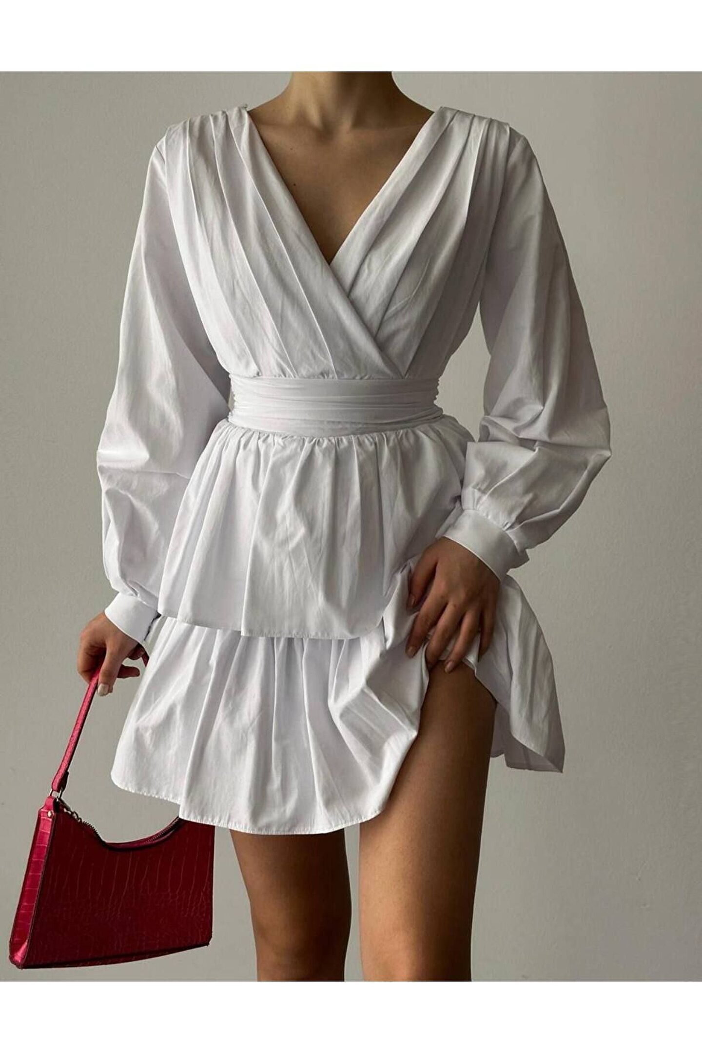 popibutik Korse Formlu V Yaka Kat Etekli Poplin Kumaş Beyaz Mini ELbise