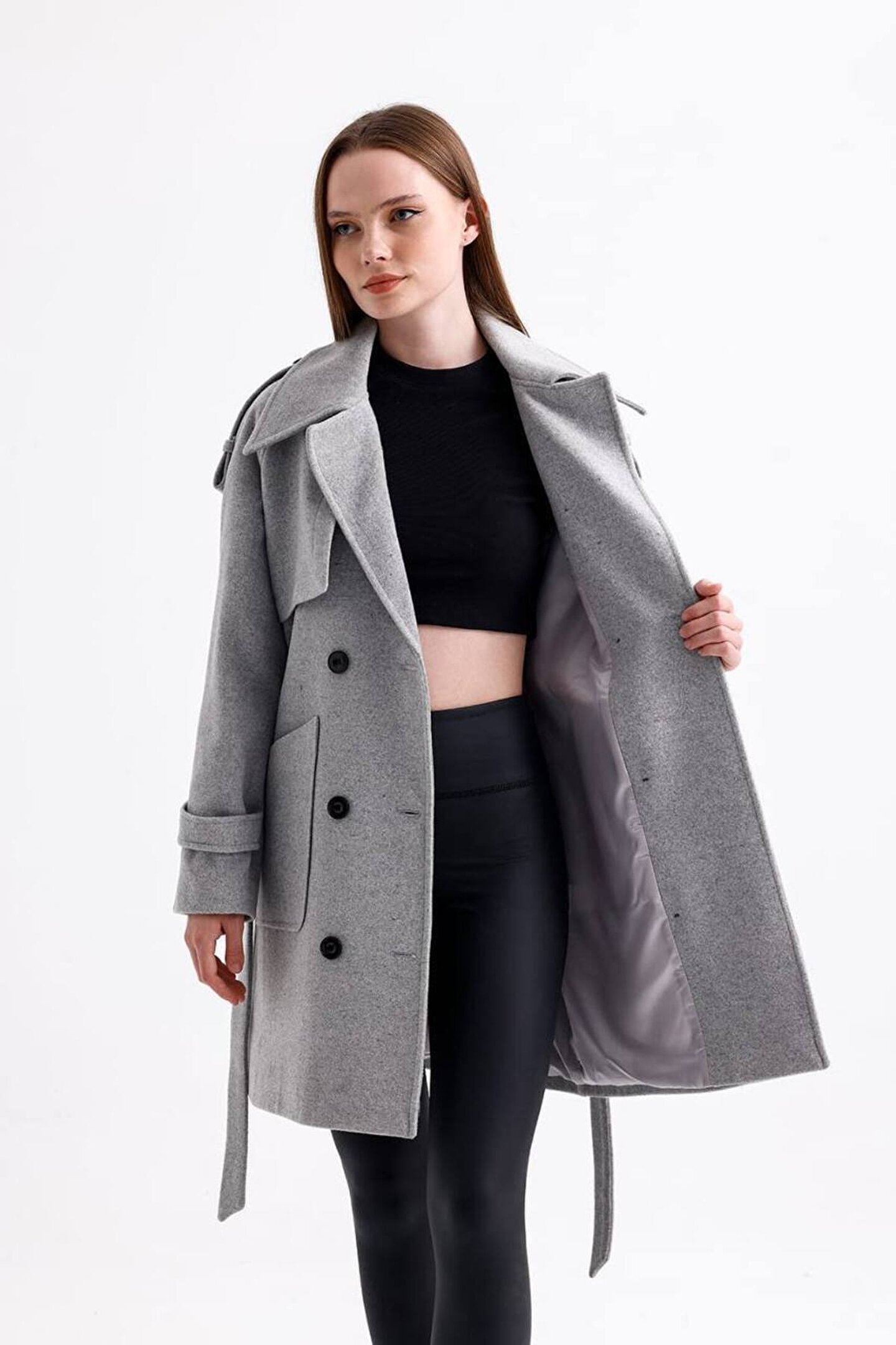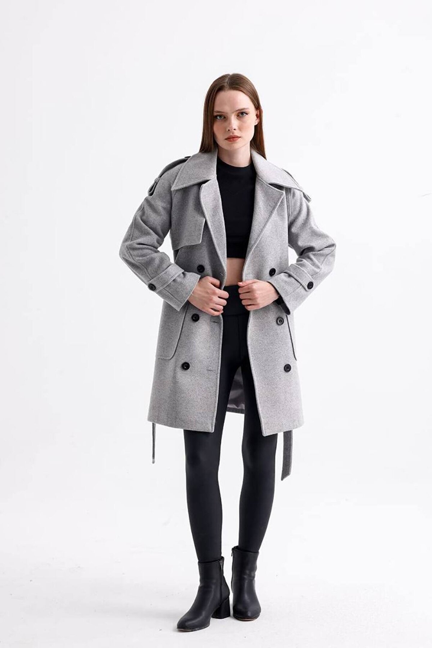 popibutik Kuşaklı Düğmeli Kaşe Kaban