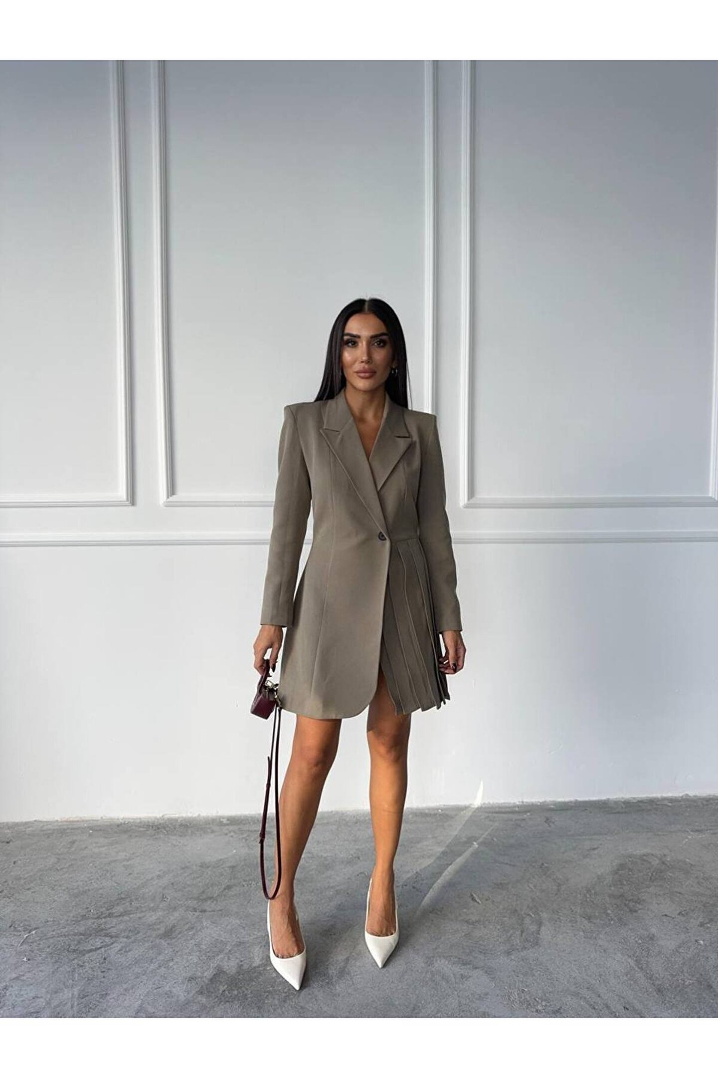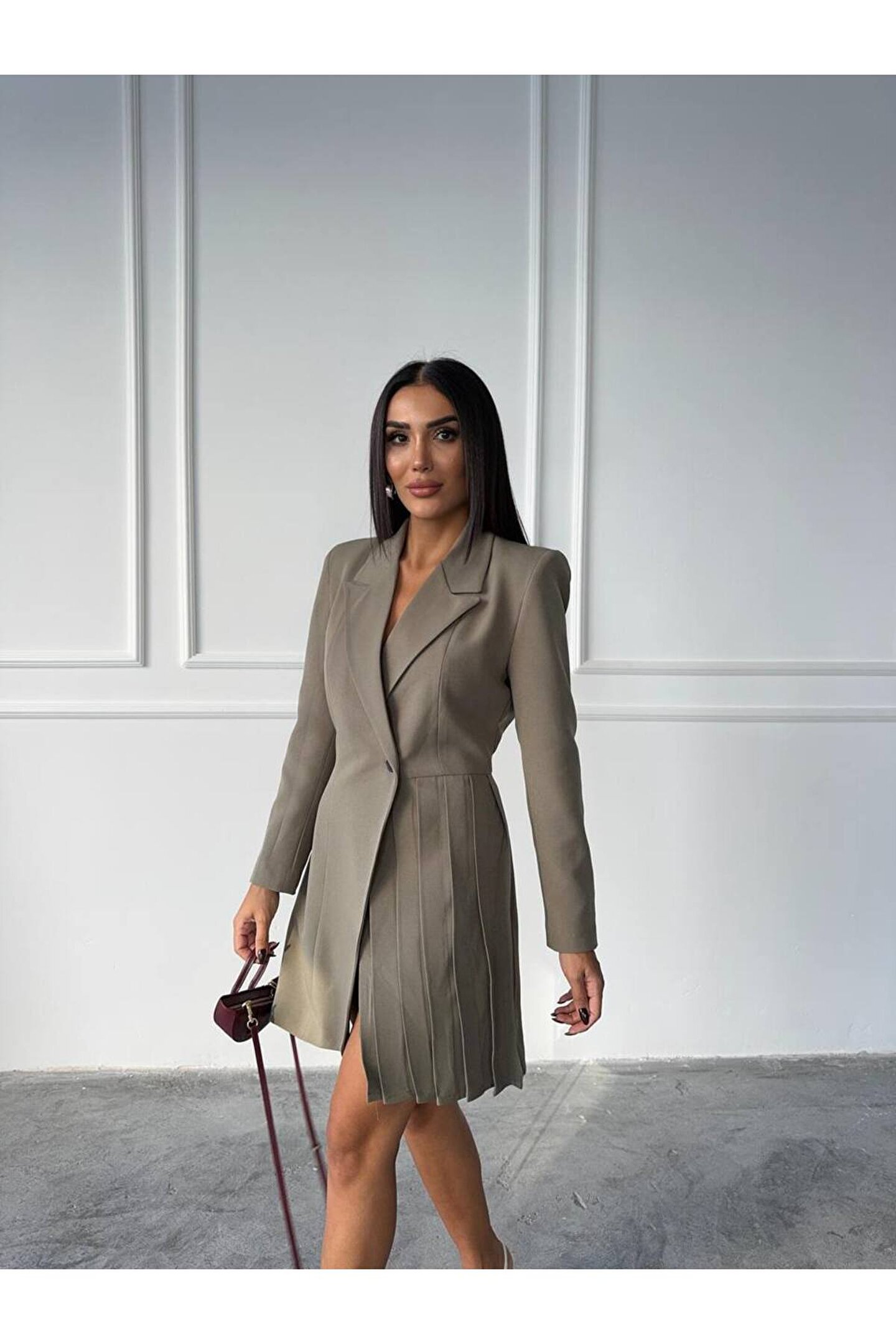 popibutik Pile Detaylı Tek Düğme Atlas Kumaş Haki Ceket Elbise