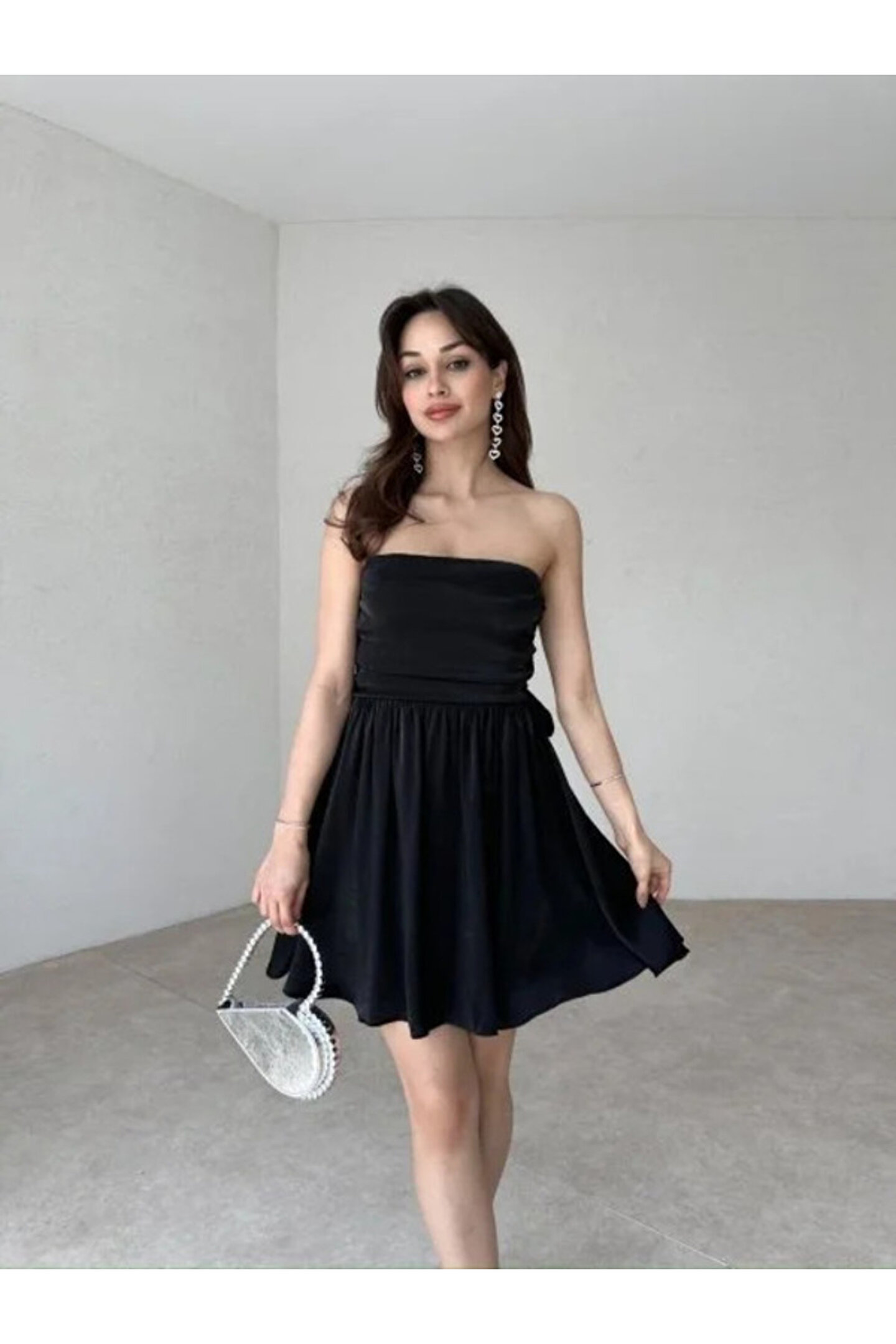 Zarif ve şık tasarımıyla dikkat çeken bu elbise, özel günlerinizde göz alıcı bir görünüm sunar; Mini boyu ile feminen ve modern bir siluet oluştururken, straplez kesimi sayesinde rahat hareket etme özgürlüğü sağlar; Dantel dokuma tipi, elbiseye sofistike bir hava katarken, siyah rengiyle her zaman asil ve şık duruşunu korur; Astarlı yapısı sayesinde konforlu bir kullanım sunarken, tüm yaş gruplarına hitap eden tasarımıyla geniş bir kullanıcı yelpazesine sahiptir; Slim kalıbı vücut hatlarını zarifçe sararak feminen bir duruş sergiler ve genç yaş grubuna özel olarak tasarlanmıştır; Parlak saten kumaşı ile ışıltınızı ön plana çıkarırken, sırt fiyonk detayıyla feminen detaylara yer vererek estetik bir dokunuş sağlar;