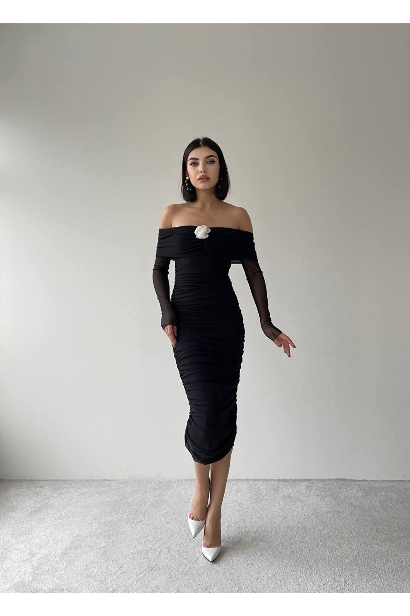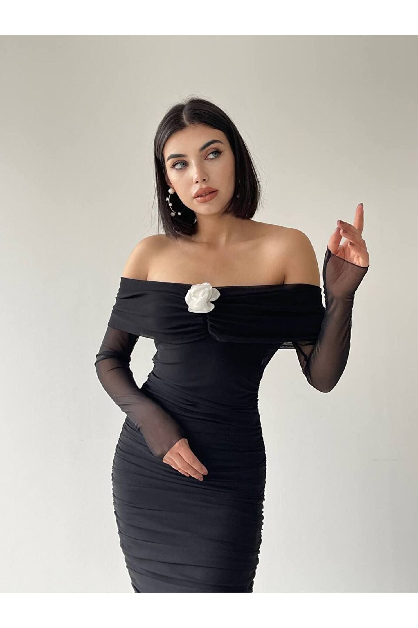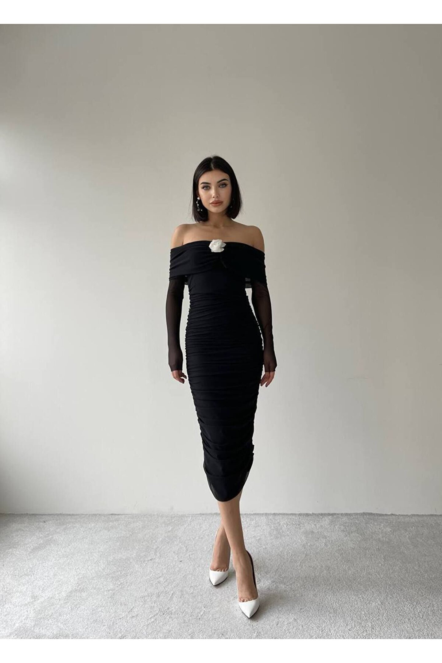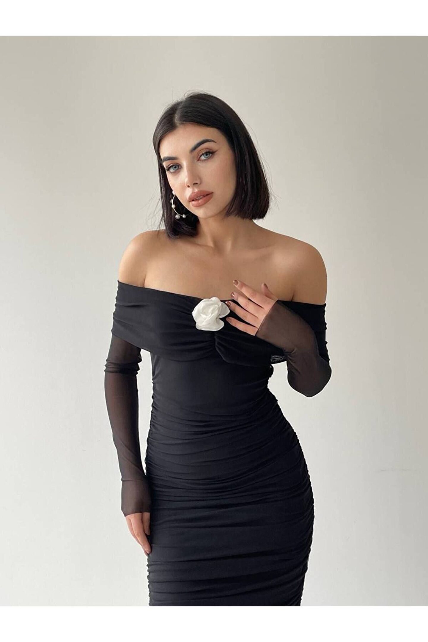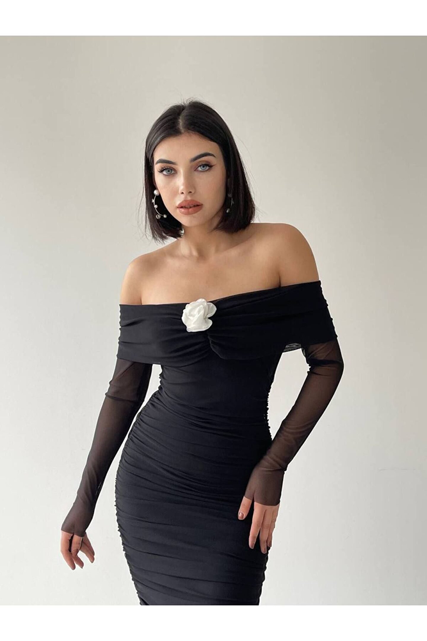 popibutik Siyah Straplez Gül Detay Drapeli Elbise