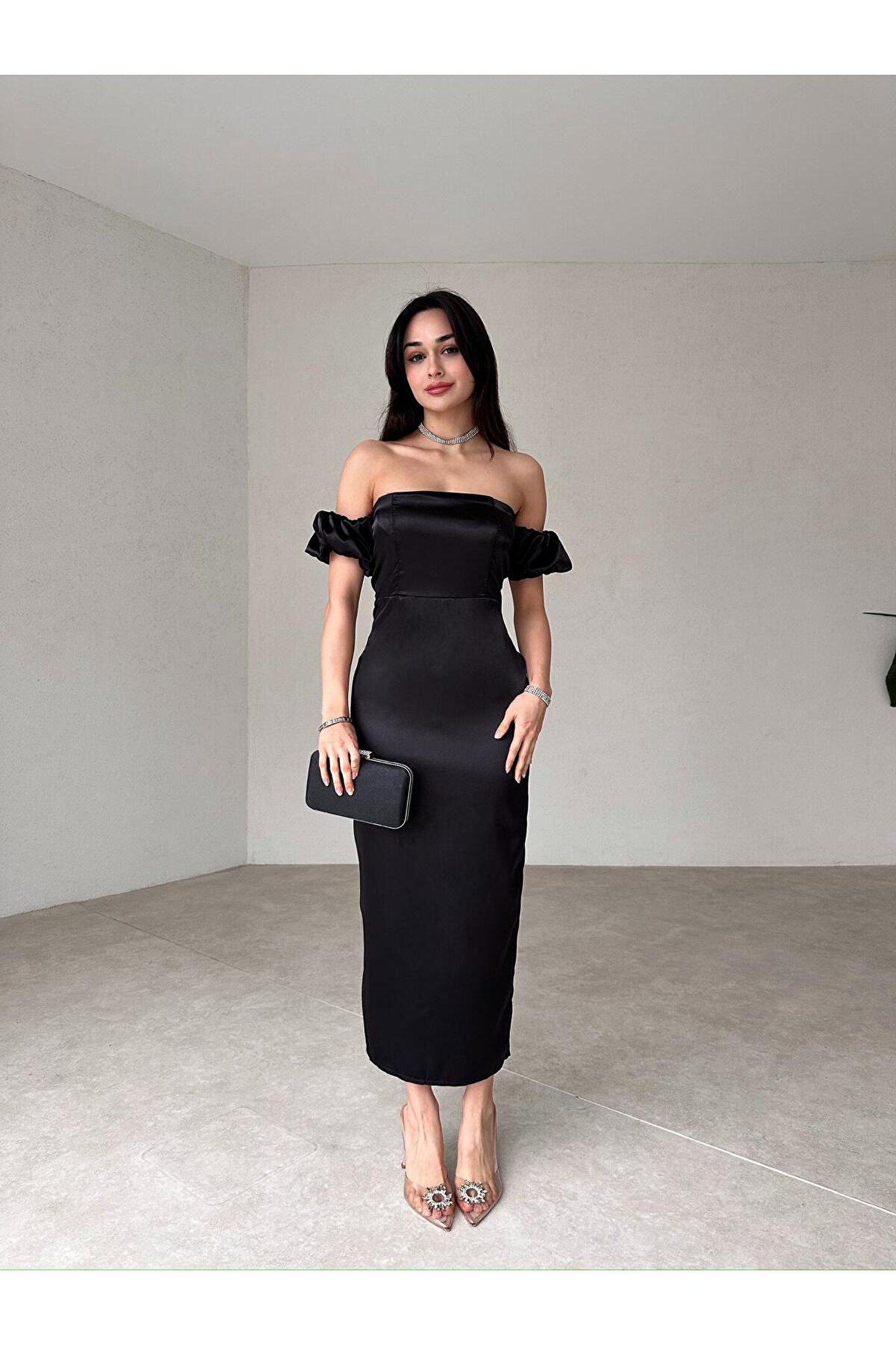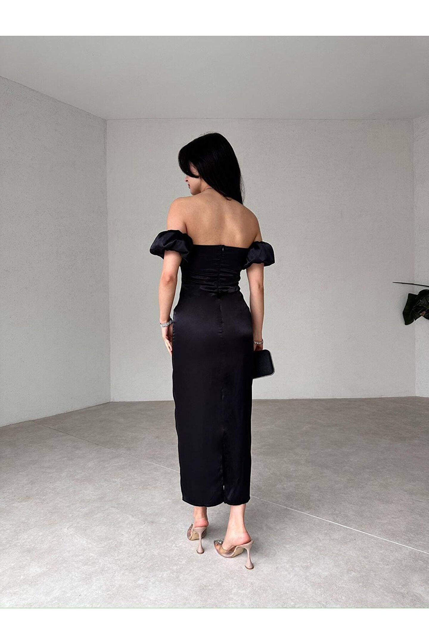 popibutik Straplez Kol Detaylı Yırtmaçlı Midi Boy Siyah Şifon Elbise