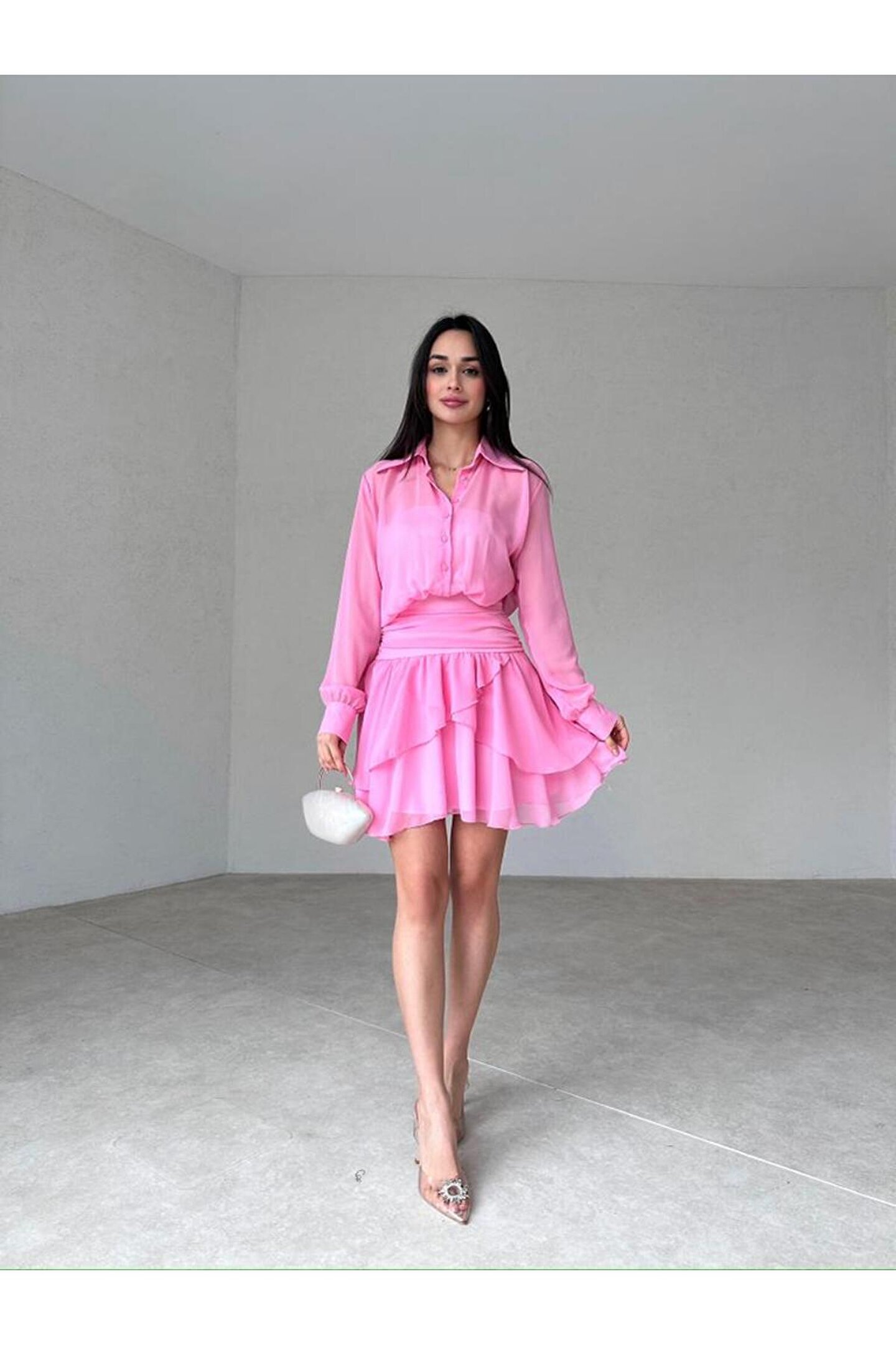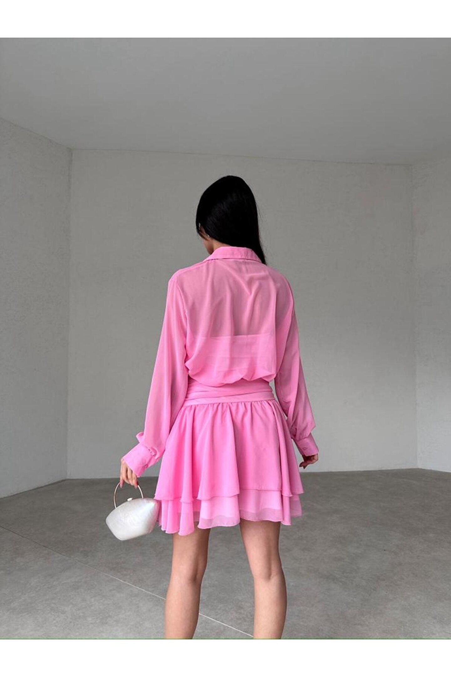 Gömlek yakası detayı ile modern ve şık bir görünüm sunar; Düz kesimi sayesinde rahat hareket etme özgürlüğü sağlar; Genç yaş grubuna hitap eden tasarımıyla dinamik ve canlı bir stil yaratır; Slim kalıbı vücut hatlarını zarifçe sararak feminen bir siluet oluşturur; Şifon dokuma tipi, hafif ve nefes alabilen yapısıyla konforlu bir kullanım sunar; Düz deseniyle sade ve zamansız bir şıklık sergiler; Astarlı yapısı sayesinde rahatlık ve şıklığı bir arada yaşatır; Şık ve gece ortamları için idealdir; göz alıcı bir tercih olur; Tüm yaş gruplarına uygun tasarımıyla geniş bir kullanıcı yelpazesine hitap eder; Fermuar detayları pratik kullanım imkanı sağlar ve kolayca giyilip çıkartılabilir; Dantel kumaş tipi ile sofistike bir dokunuş katarken, zarafeti ön plana çıkarır; Mini boyu ile modern ve trend bir görünüm kazandırırken, uzun kollarla feminen çizgileri tam;
