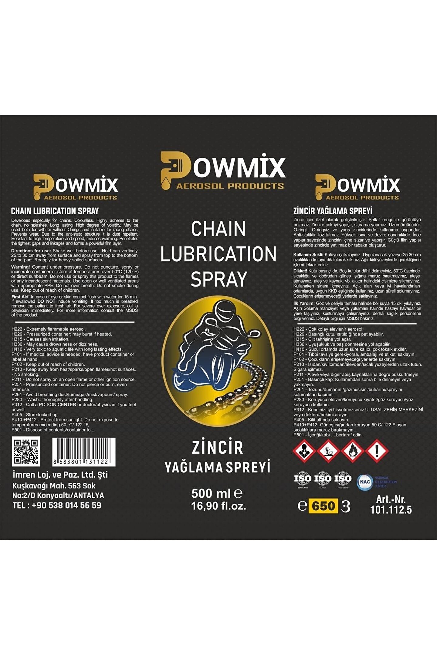 Powmix Zincir Yağlama Spreyi, Zincir için özelolarak üretilmiştir. ; Şeffaf rengi ile görüntüyü bozmaz. ; Zincire çok iyiyapışır, sıçrama yapmaz. ; Uzun ömürlüdür. ; O-ringli, O-ringsiz ve yarışzincirlerinde kullanıma uygundur. ; Anti-statiktir, toz tutmaz. ; Yüksek ısıya vedevire dayanıklıdır. ; İnce yapısı sayesinde zincirin içine sızar ve yapışır.Güçlü film yapısı sayesinde zincirde yırtılmaz bir tabaka oluşturur.;