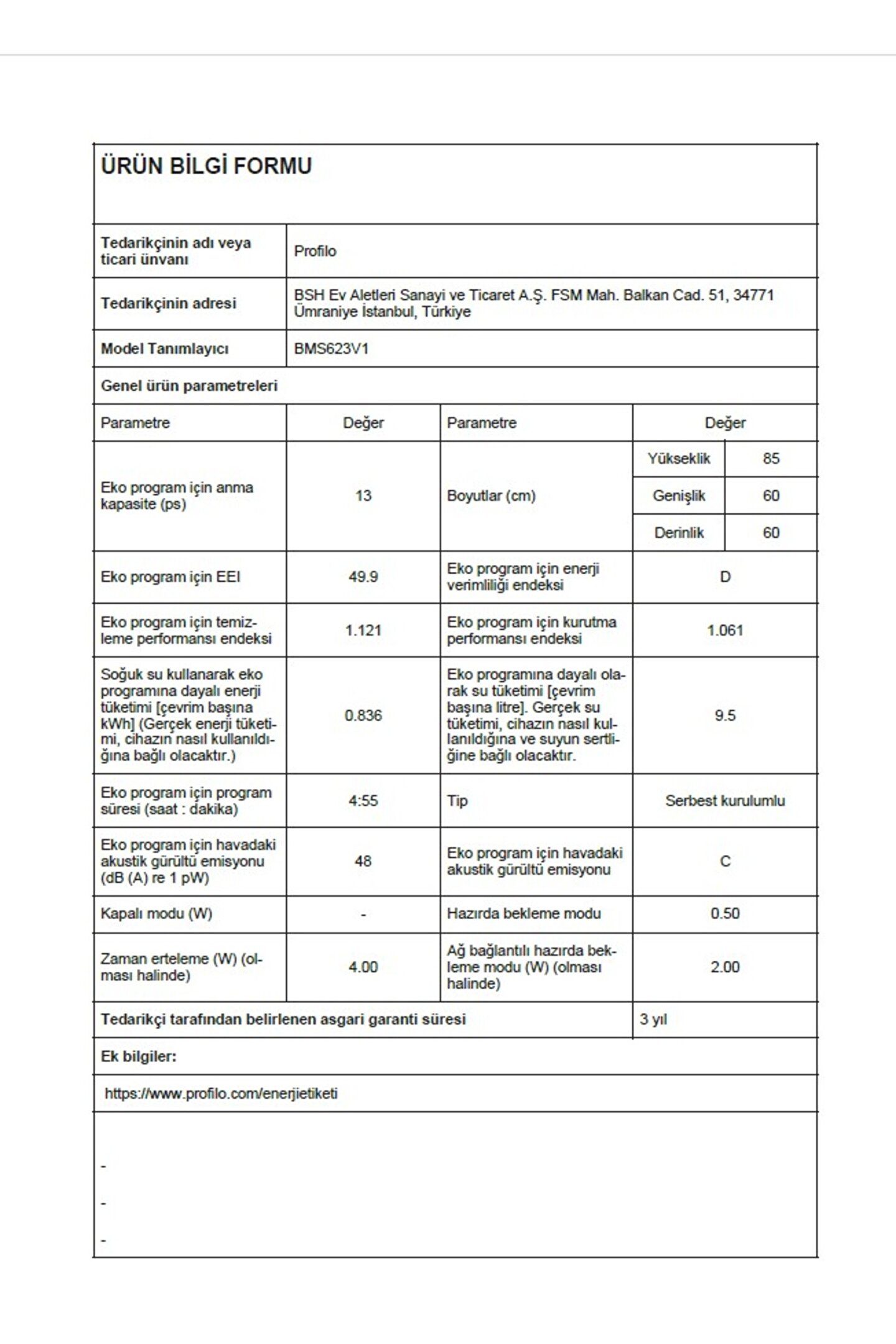 - Modern tasarımıyla mutfaklarınıza şıklık katan Profilo BMS623V1 bulaşık makinesi, evinizin dekorasyonuna kolayca uyum sağlar.; - A'dan G'ye enerji sınıf aralığına sahip olan bu bulaşık makinesi ile enerji tasarrufu yaparken temizliği de ihmal etmezsiniz.; - D enerji sınıfına sahip olması sayesinde düşük enerji tüketimiyle çevreye duyarlı bir kullanım sunar.; - Yetkili servis desteği ile tamiri gereken durumlarda profesyonel yardım alabilirsiniz; böylece makinanız uzun süre ilk günkü performansını korur.; - Üretici ülkesi Türkiye olan bu ürün, yerel üretim avantajlarıyla kaliteyi evinize getirir.; - Geniş aileler için ideal kapasitesi olan 13 kişilik set üstü bulaşık makinesi, sıkça kullanılan bulaşıklarınızı rahatlıkla yıkamanızı sağlar.; - Resmi distribütör garantisi altında olan Profilo BMS623V1, satın alma sonrası da güven verir.; - Kurulum gerektiren bu bulaşık makinesi için yetkin teknisyenlerden destek alarak montaj işlemini kolayca gerçekleştirebilirsiniz.; - Çeşitli ihtiyaçlara yönelik tasarlanmış 6 farklı program seçeneği ile her türlü bulaşık türüne uygun temizlik deneyimi yaşatır.; - Derinlik ölçüsü 60 cm ve üzeri olan bu model, geniş iç hacmi sayesinde büyük tabaklarınızdan küçük fincanlarınıza kadar tüm eşyalarınız için yeterli alan sunar.; - Su tüketimi açısından da verimli olan Profilo BMS623V1, 9 ila 11 litre arasında değişen su harcamasıyla ekonomik bir kullanım vaat eder.; - Genişlik ölçüsü 58 cm olan bu bulaşık makinesi, mutfak tezgahınıza kolayca entegre olacak boyuttadır.; - Ücretsiz kurulum/montaj hizmetinden faydalanarak zaman kazanırken aynı zamanda profesyonel işçilikten gönül rahatlığıyla yararlanabilirsiniz.; - Solo kullanım şekline sahip olan bu bulaşık makinesi, bağımsız konumuyla mutfak düzeninizi bozmaz ve pratik bir çözüm sunar.; - 3 yıl garanti süresiyle uzun vadeli kullanım güvencesi sağlayarak yatırımınızın karşılığını almanızda yardımcı olur.