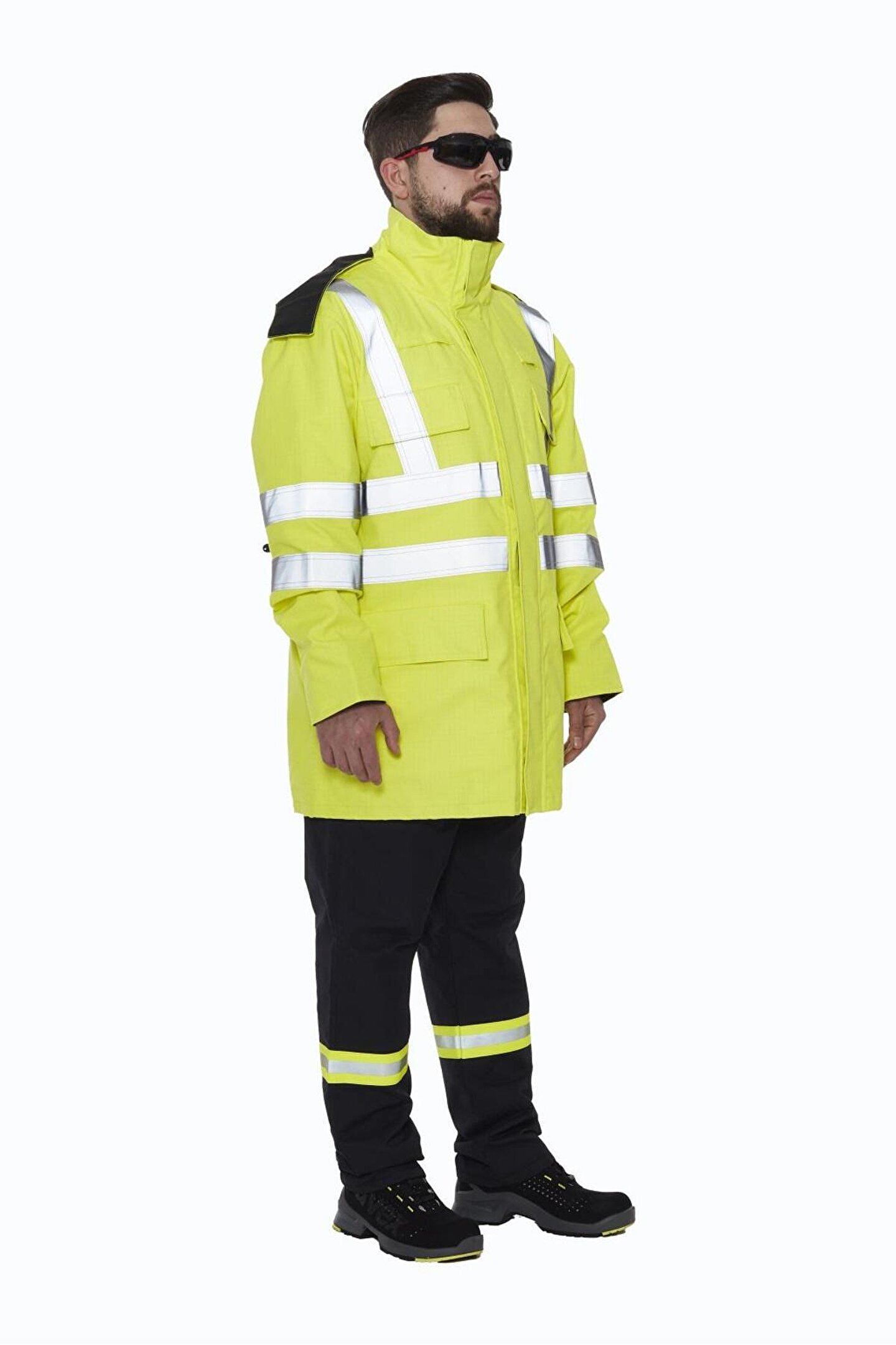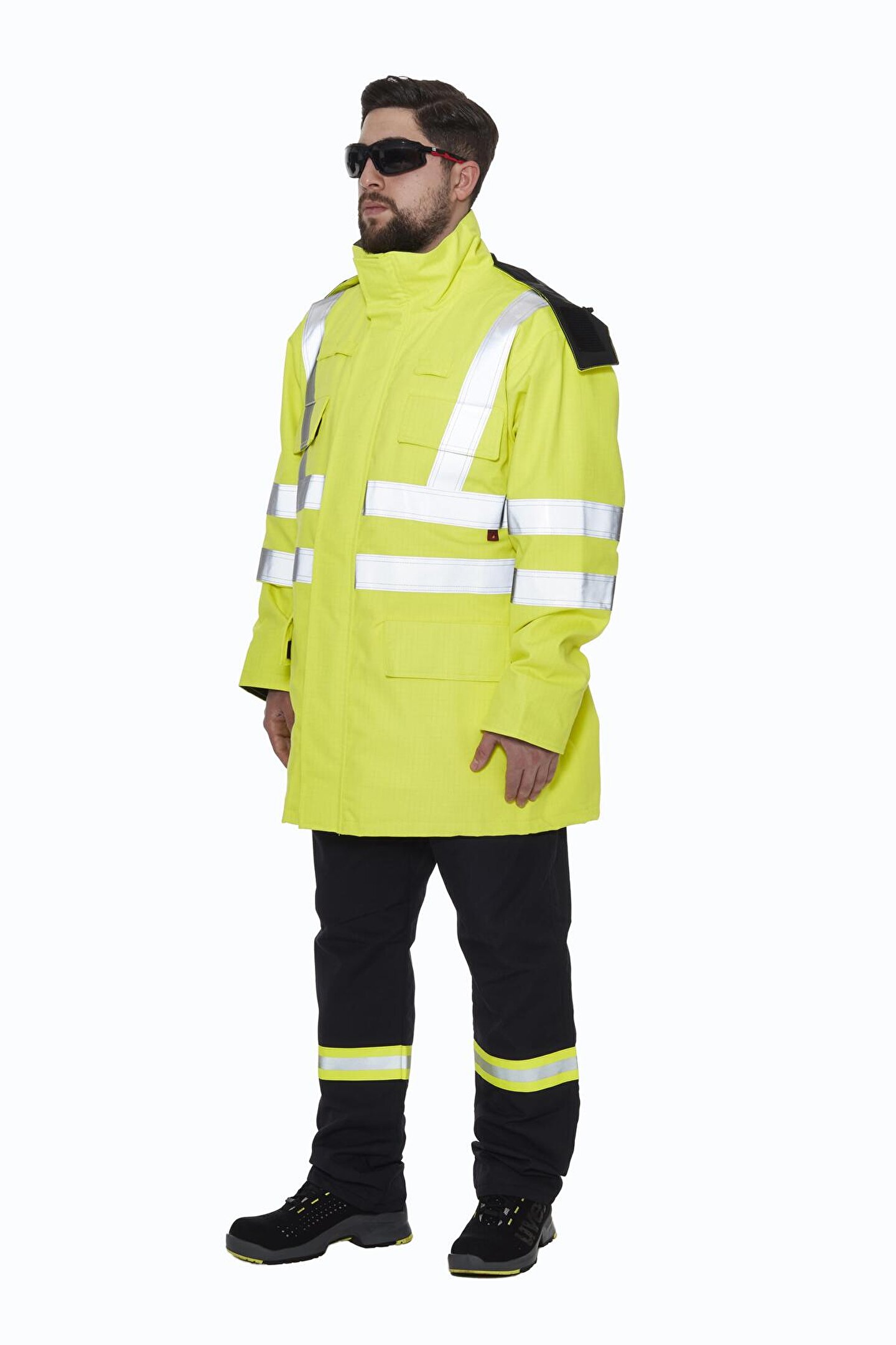 İTFAYECİ ALEV ALMAZ PETRO KİMYA YAĞMURLUK Yağmurluk, yangınla mücadele eden personelin; yangın söndürme çalışmaları esnasında ortaya çıkan su, alev ve sıcaklığın olumsuz etkilerinden korunması amacıyla kullanılır. (EU)2016/425 Kişisel Koruyucu Donanım sınıfına giren, özel tasarıma sahip yağmurluklardır. EN 343 Yağmura karşı koruma, EN1149-5antistatik, EN471 görülebilirlik, EN ISO 14116 yanmazlık “İtfaiyeciler için koruyucu giyecekler – standartlarına uygun olarak üretilir ve CE işaretlidir Teknik Bilgiler Yağmurluk, yangınla mücadele eden personelin; yangın söndürme çalışmaları esnasında ortaya çıkan su, alev ve sıcaklığın olumsuz etkilerinden korunması amacıyla kullanılır. (EU)2016/425 Kişisel Koruyucu Donanım sınıfına giren, özel tasarıma sahip yağmurluklardır. EN 343 Yağmura karşı koruma, EN1149-5antistatik, EN471 görülebilirlik, EN ISO 14116 yanmazlık “İtfaiyeciler için koruyucu giyecekler – standartlarına uygun olarak üretilir ve CE işaretlidir. K umaş: Plavitex Multi (PVC/cotton) K umaş kalınlığı: 0,65mm, K umaş ağırlığı: 530 gsm, R eflektifler: gri, aramid taşıyıcılı Çift kaynaklı dikişler Yakaya gizlenmiş ayarlanabilir başlık Dış tarafa kaynaklanmış cepler Gizlenmiş fermuar Rüzgar kesici kollar Havalandırma delikleri Reflektifler Bedenler: 48-62 (S-4XL)
