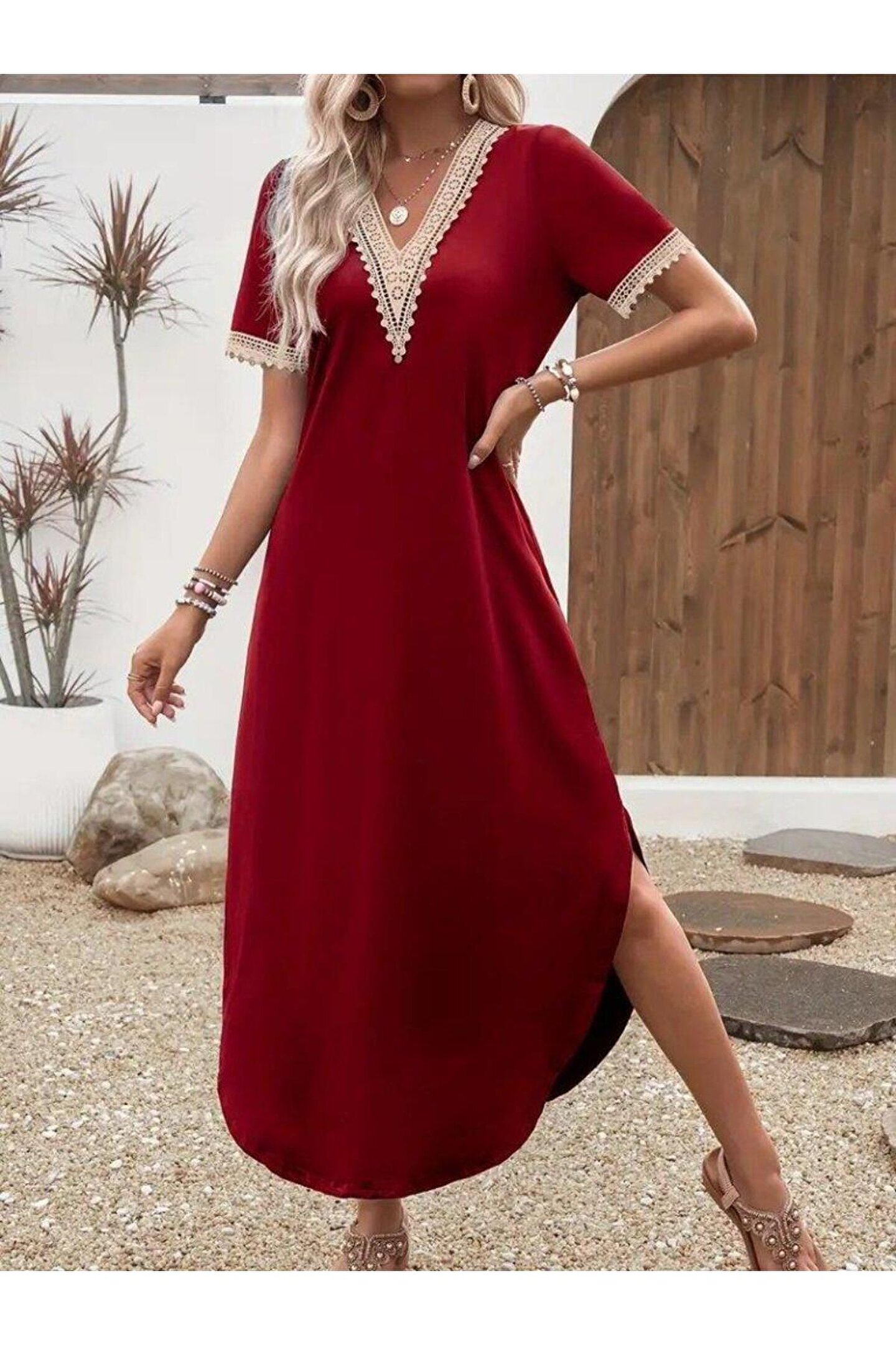 Kadın Kısa Kollu Dantel V Yakalı Uzun Viskon Elbise