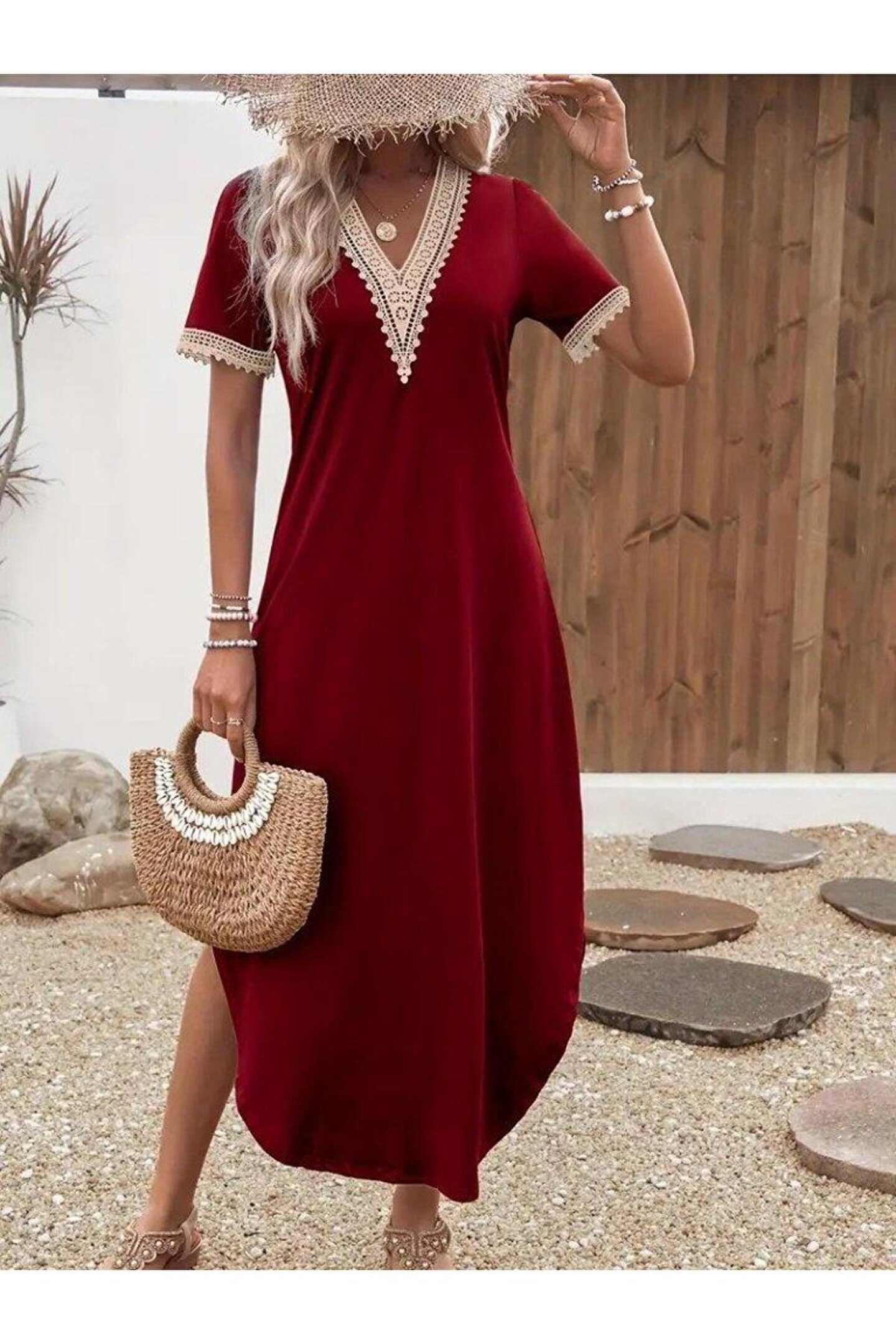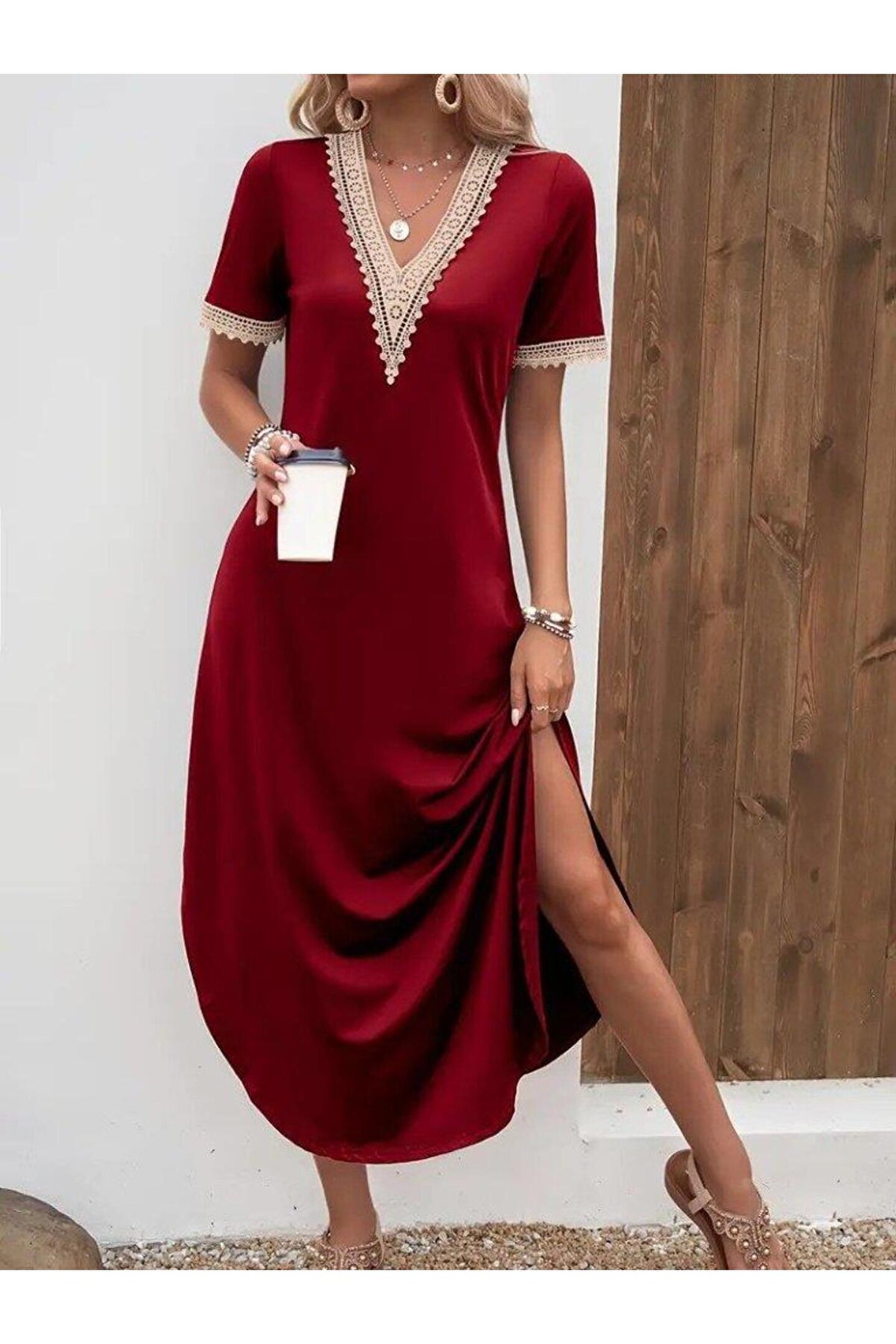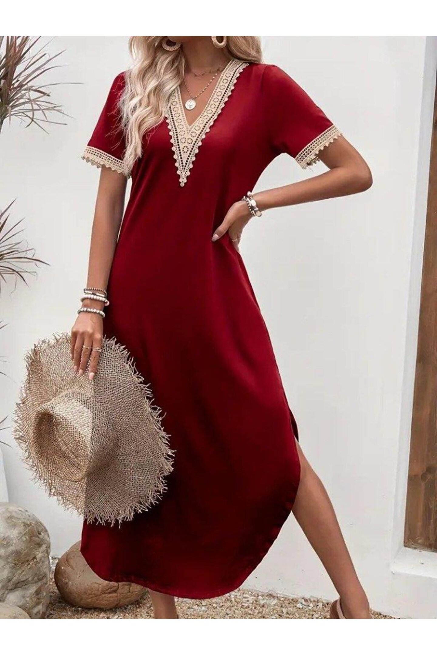 Kadın Kısa Kollu Dantel V Yakalı Uzun Viskon Elbise