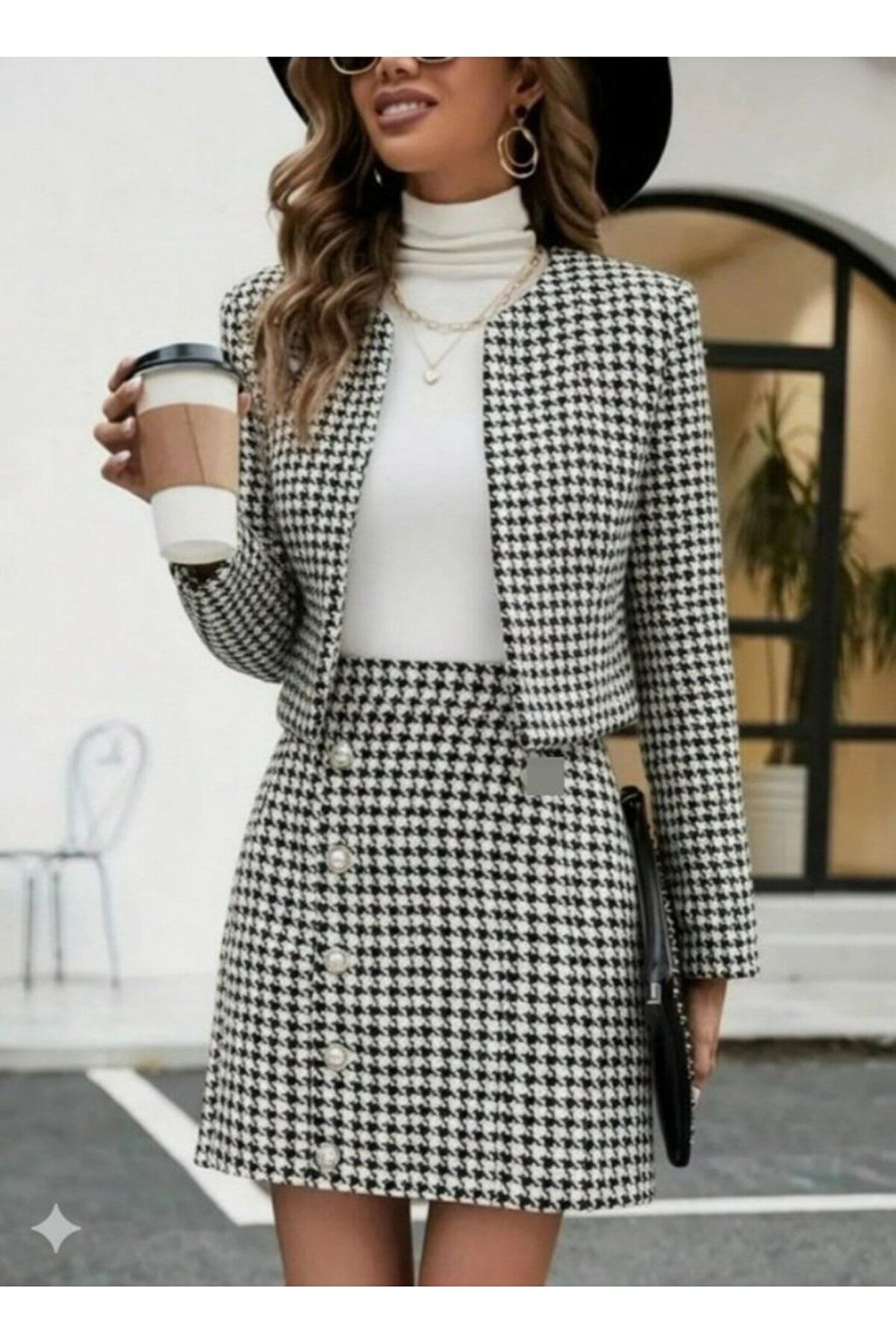 Queene Dreams Kadın Uzun Kollu önü Açık Dokuma Ceket Ve Mini Etek Ikili Takım