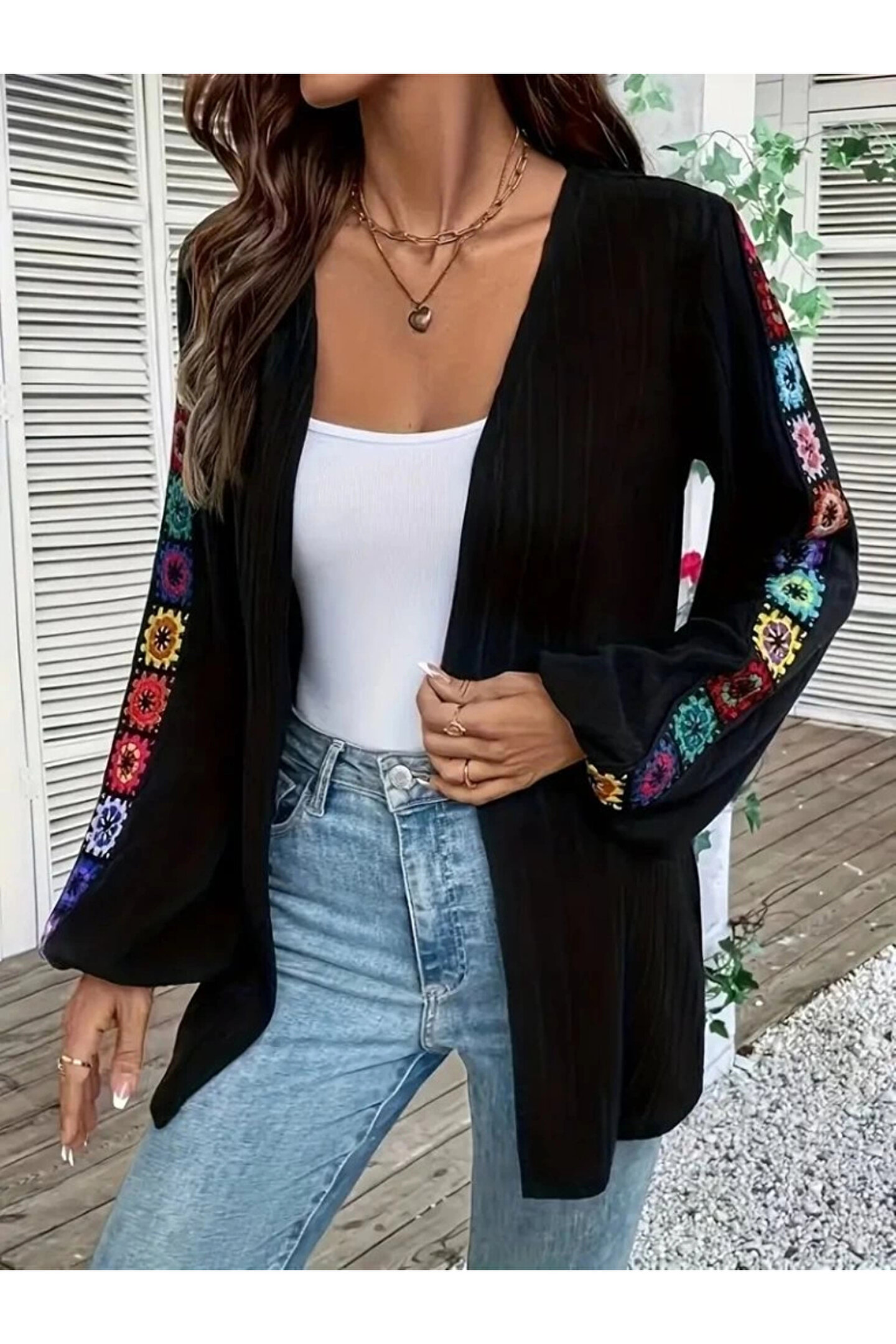 - Şık ve rahat bir görünüm için ideal, etnik desenli şardonlu kaşkorse ceket.; - Orta kalınlıkta kumaşı ile mevsim geçişlerinde ve kış aylarında konforlu bir kullanım sunar.; - Ceket yaka tasarımıyla modern ve zamansız bir stil oluşturur.; - Kemersiz tasarımı sayesinde vücut hatlarınıza uyum sağlar ve kolay kombin imkanı tanır.; - Günlük kullanıma uygun, casual ortamlarda rahatlıkla tercih edilebilir.; - Modest koleksiyonunun bir parçası olarak, sade ve zarif bir görünüm arayanlar için idealdir.; - Dantel dokuma tipi ile detaylara önem verenler için estetik bir dokunuş katıyor.; - Astarsız yapısı sayesinde hafiflik hissi verirken, uzun kol tasarımı soğuk havalarda ekstra koruma sağlar.; - Türkiye'de üretilen bu ceket, yerel işçiliği desteklerken kaliteli malzeme kullanımıyla dikkat çeker.; - Yetişkin yaş grubuna hitap eden regular kalıp ve boy ölçüleriyle her bedene uygunluk gösterir.;