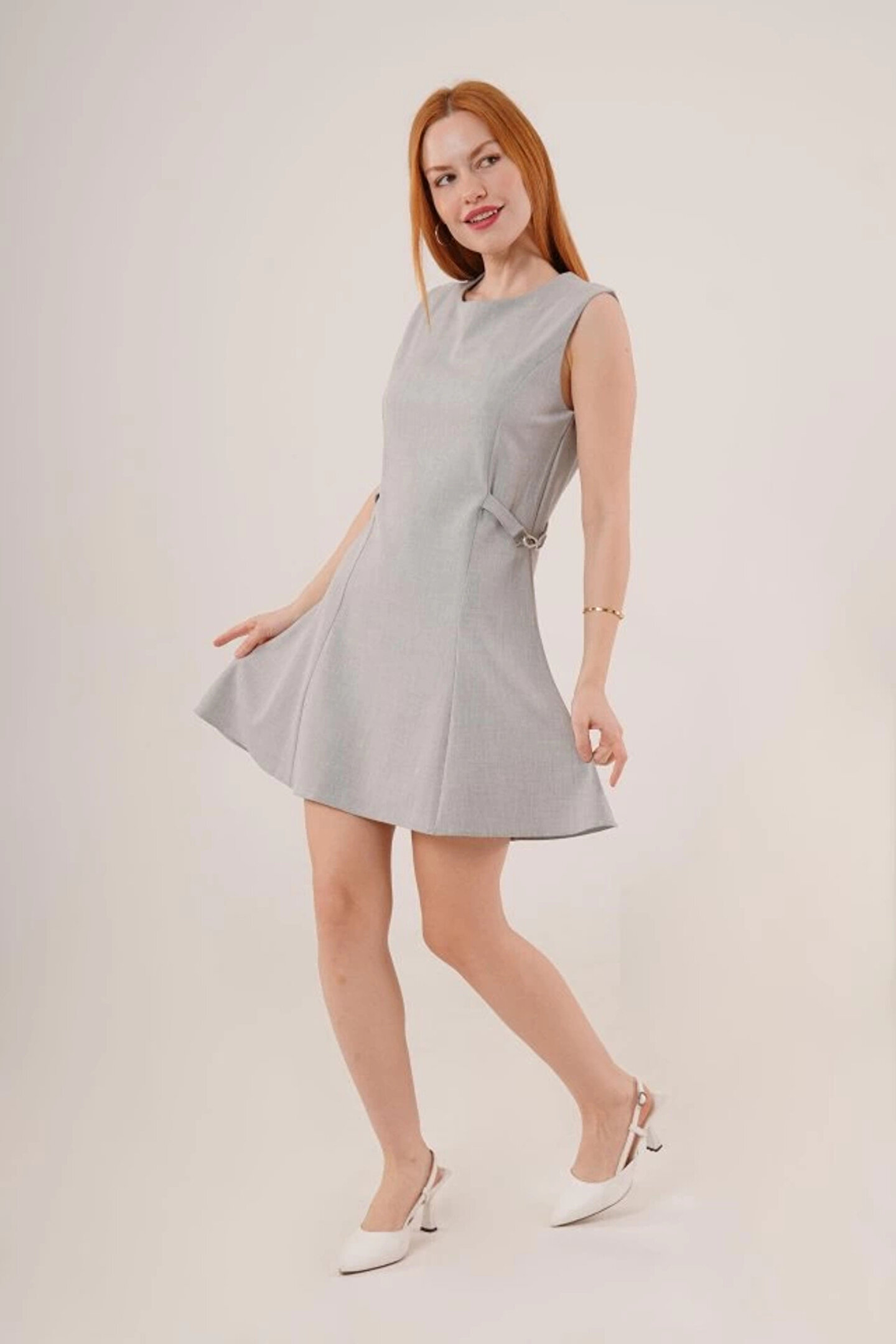 Yanları Zincir Detaylı Sıfır Kol Gri Mini Elbise