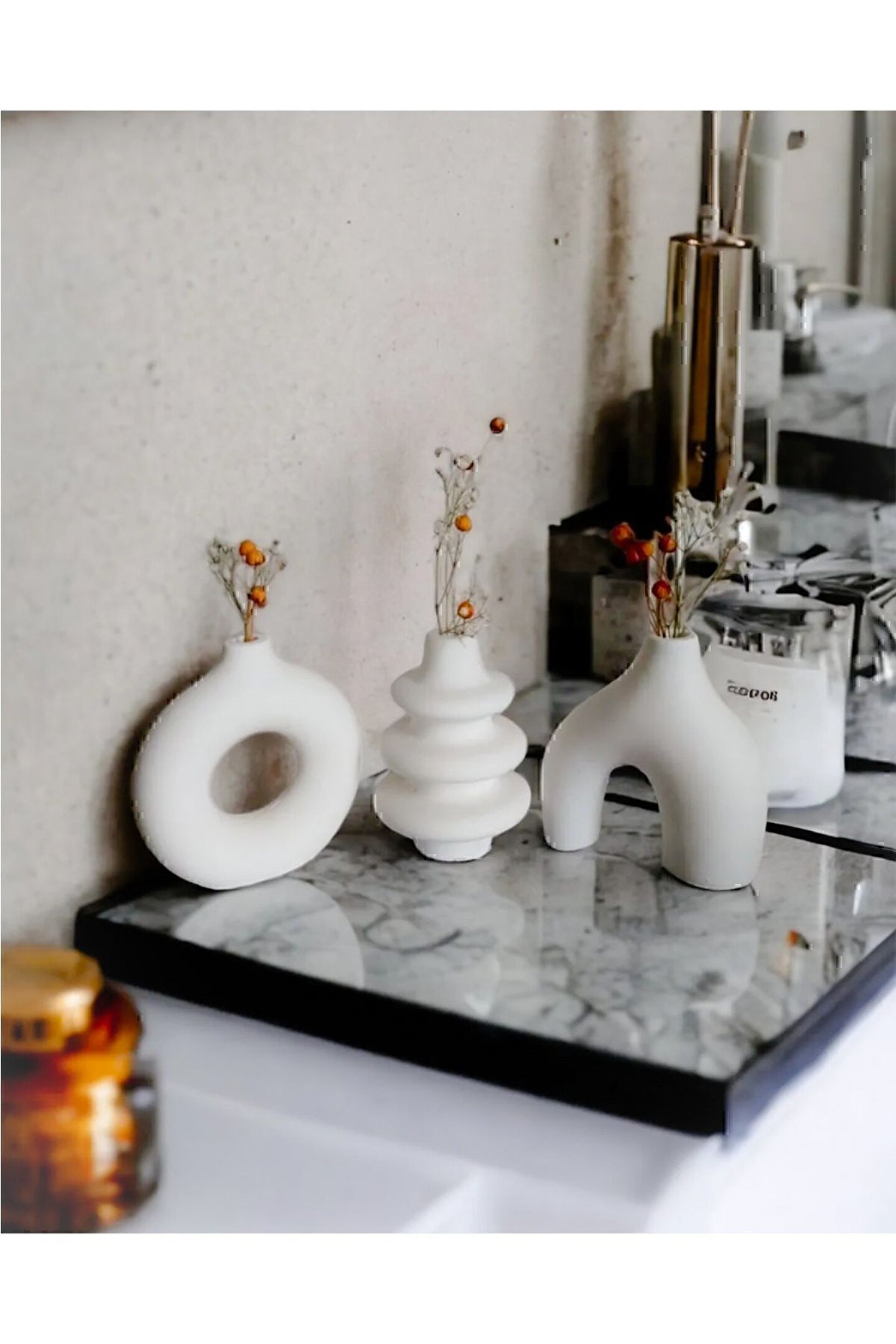 - Zarif beyaz renkteki bu vazo seti, minimalist dekorasyon anlayışınıza mükemmel uyum sağlar.; - 0 ile 10 cm arasında değişen yüksekliğiyle, her türlü alanda kolayca yer bulur ve kullanım alanı sunar.; - Beton materyali sayesinde dayanıklılığı artırılmış olup uzun süreli kullanım vaat eder.; - Üç parçadan oluşan set, evinizde veya ofisinizde estetik bir görünüm oluşturmanız için idealdir.; - Tek ebat tasarımıyla standart boyutlarda olan bu vazo seti, farklı alanlara kolayca adapte olabilir.