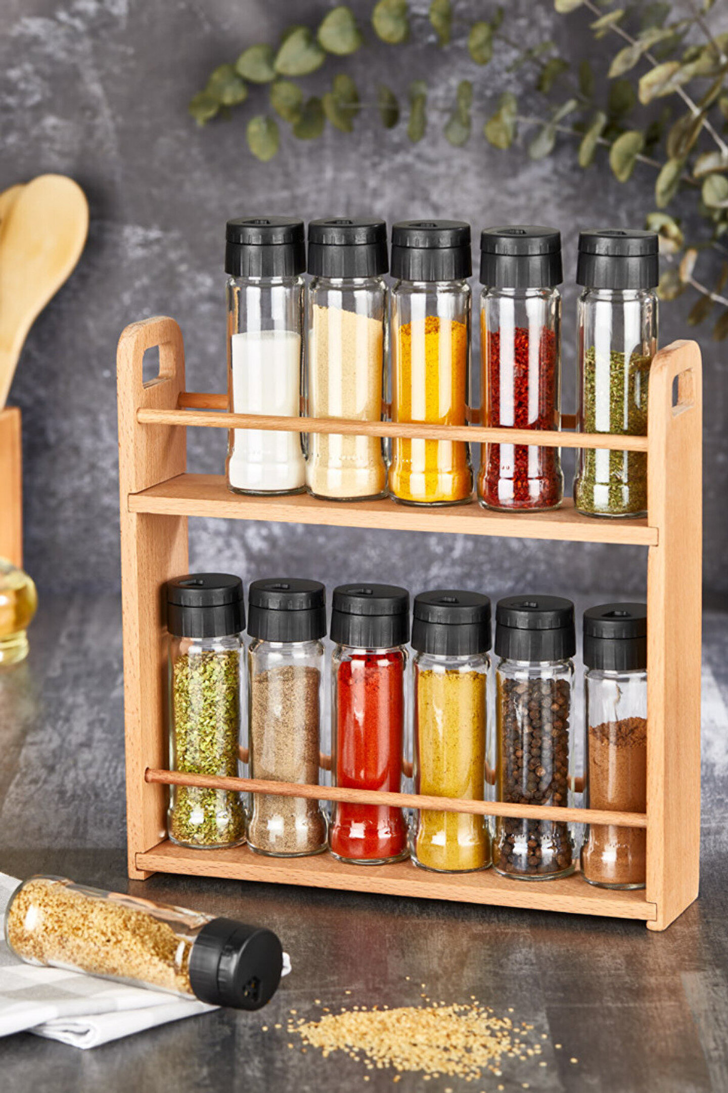 13 Parça Ahşap Standlı Cam Baharatlık Baharat Takımı