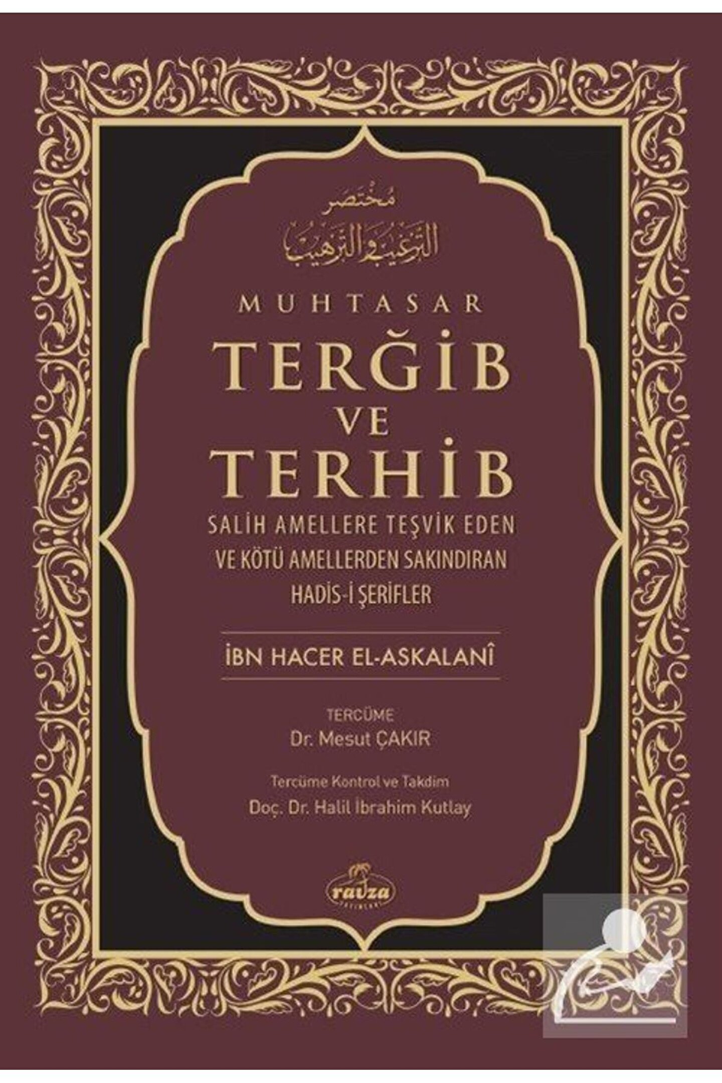 Muhtasar Terğib ve Terhib (Ciltli) İbn Hacer el-Askalani, Dr.; Halil İbrahim Kutlay / Ravza Yayınları Basım Yılı: 2019; Baskı: 1; Sayfa Sayısı: 510; Kağıt Türü: Şamuha Kağıt; Ebat: 17 x 24; Dil: Türkçe; Cilt Durumu: Ciltli; ISBN: 9786258081244; Yazar: İbn Hacer el-Askalani; Hazırlayan: Dr.; Halil İbrahim Kutlay; Çizimler: Mesut Çakır; Faziletli ameller adab güzel ahlak helal ve haram konularıyla ilgili hadislerin derlendiği eserler "Tergib ve Terhib" ve "Fezail" konulu eserlerdir.; Bu konudaki meşhur eserlerden biri İmam Münziri (ö.; 656-1258)'in et-Tergib ve et-Terhib mine'l-Hadis adlı eseridir.