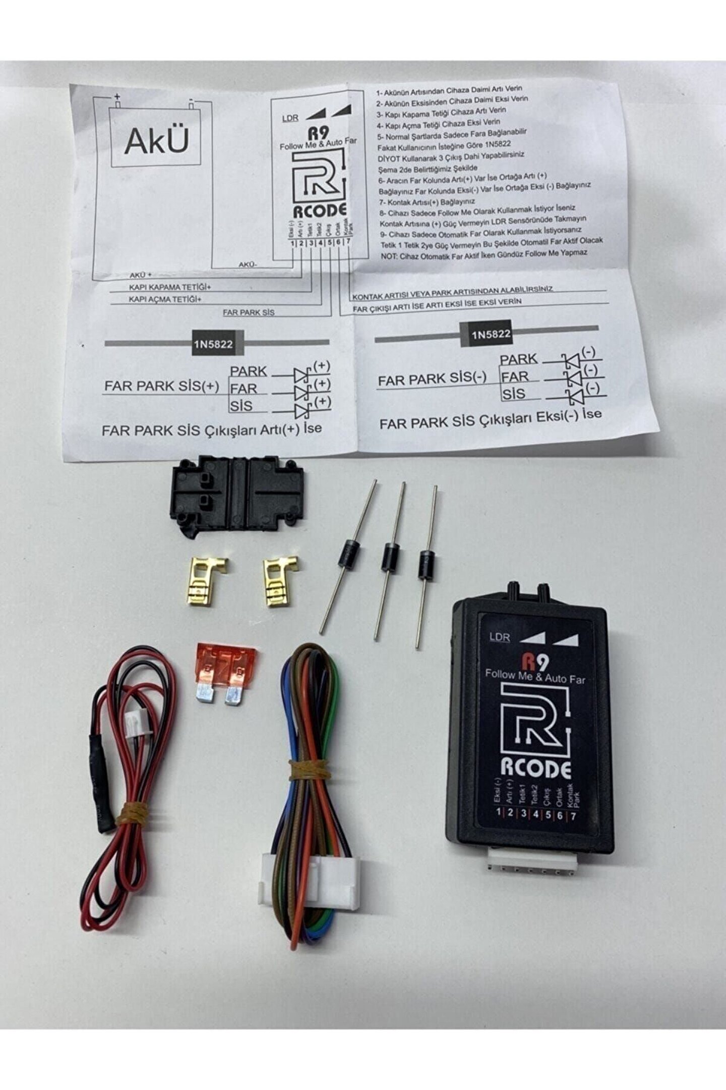 TEKNİK ÖZELLİKLERİ 3 Adet Çıkış bulunmaktadır.2 Far (2x55W) ve 1 park tetik (1x26W) Arıza lambasına karşı geliştirilmiş tasarıma sahiptir. Sensör üzerinde buton ile ON/OFF kontrolü yapılabilir. Mikroişlemcili tasarımı ile çok hızlı ve karalı çalışmaktadır. Karanlık oluşmasından 1 saniye sonra sistem devreye girmektedir Kabloları ile birlikte gelmektedir Dahili bulunan sigorta ile yüksek güvenirlik sağlar Akım Tüketimi Çok Düşüktür (Kontak Kapalı İken Ortalama 0,008A) Kompakt Tasarımı İle Montajı Kolaydır Soketli Yapısı İle İstenildiğinde Kolaylıkla Sökülüp Takılabilir. Yüksek Kaliteli terminal bağlantılı soket ile kablo sıyrılması sorunları çözer Led Ampullerde Kullanılabilr; 12V Tüm araç ve motosikletlerde kullanılabilir %100 yerli tasarımlı Türk Malıdır Çalışma Prensibi: Kontak Açıkken: Cama bağlı sensörden ortama bağlı ışık seviyesi sürekli alınır. Gün Işığının azalması ile önce park tetik çıkışı aktif olur.Karanlığın artması ile farlar devereye girer Not:Far Sensörü, farlar araç içinden el ile açıldığında otomatik devre dışı kalır. Kontak Kapalıyken: Merkezi Kilit yada alternatif Çıkışlardan Tetikleme Beklenir Tetikleme alınması ile çıkışlar ayarlanan süre kadar aktif olur. Not: Follow Me Özelliği ortam aydınlıksa otomatik devre dışı kalır. PAKET İÇERİĞİ 1x Far sensörü + Follow me home modülü 1x Kurulum Şeması 3X 1N5822 diyot 1X Sıgorta 1X Sıgorta kılıfı 2X sıgorta terminalleri