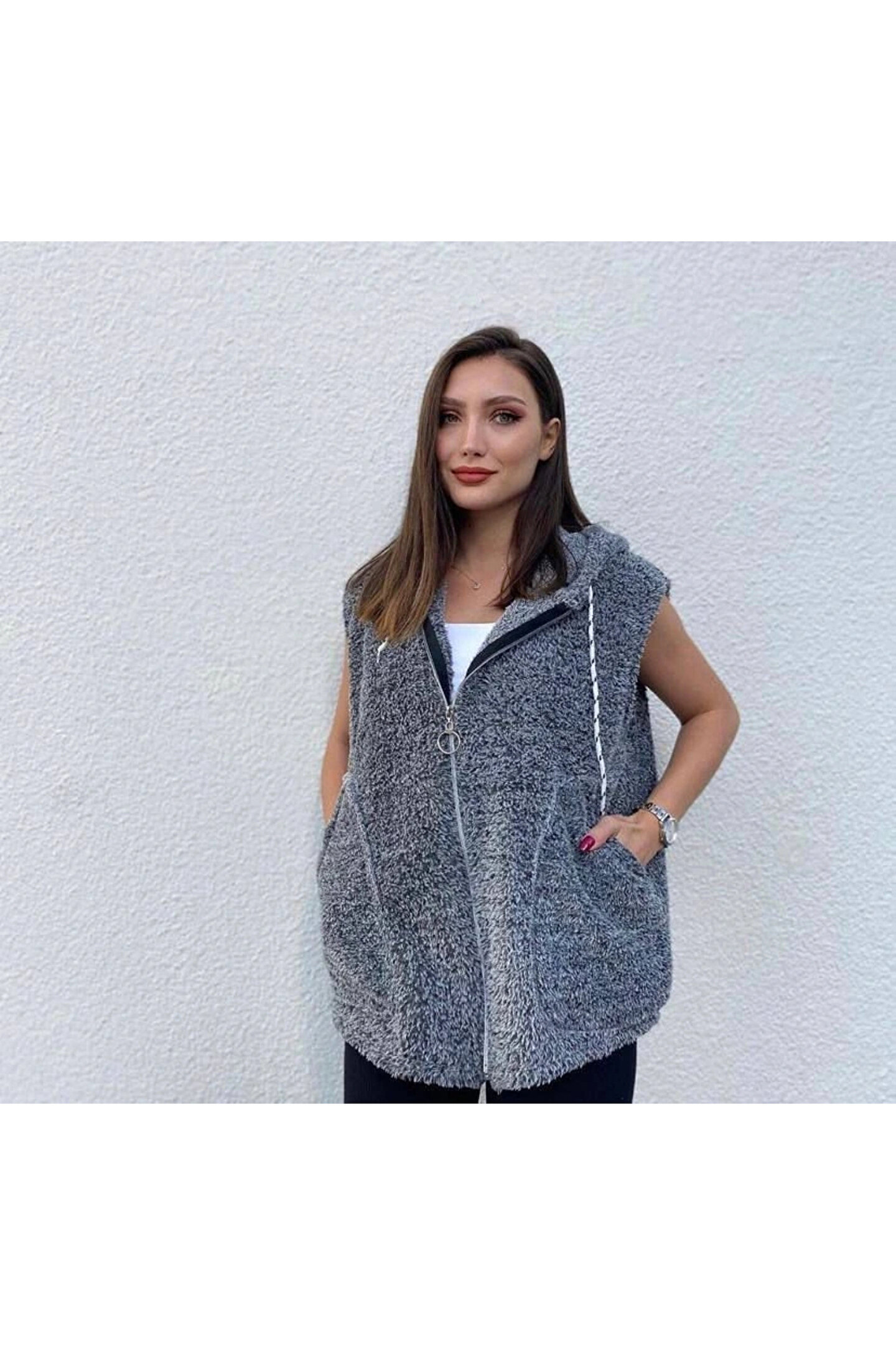 Kadın Kapüşon Ve Fermuar Detay Welsoft Kolsuz Yelek