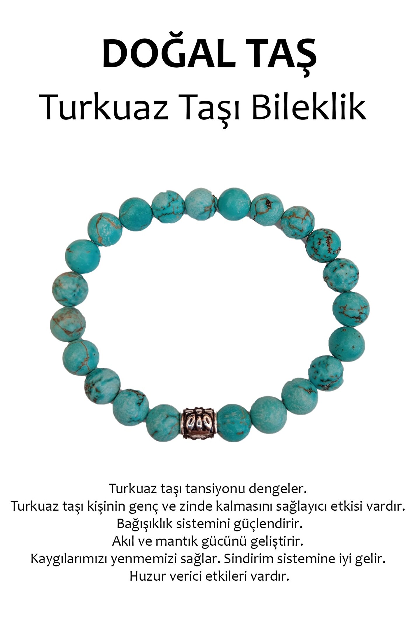 Doğal turkuaz taşı kullanılarak üretilmiş, şıklığı ve doğallığı bir arada sunan bileklik; Hakiki doğal taş materyali ile hem zarif bir görünüm sağlar hem de uzun süreli kullanım için dayanıklılık sunar; Turkuaz taşı, mavi rengiyle dikkat çeker ve her türlü kıyafetle kolayca uyum sağlar;