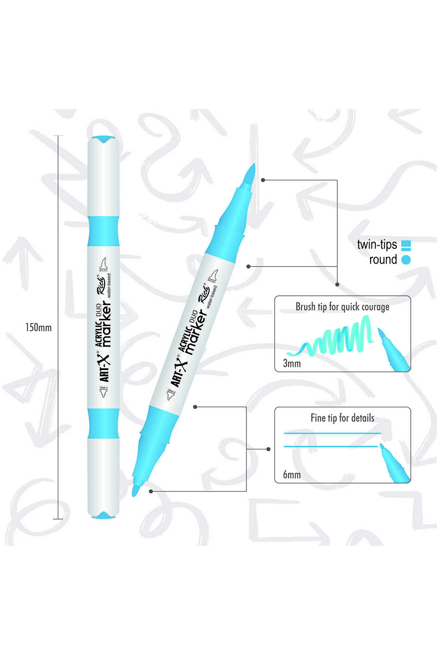 ART-X ACRYLIC DUO MARKER Su bazlıdır. Toksik değildir. 48 RENK seçeneği mevcuttur. Çift uçlu; 1 mm / 6mm fırçalar, ince ve kalın çizgiler yazmanıza izinverir, mükemmel çok yönlülük ve esneklik sağlar, çeşitli stilleri, eskizleri vedesenleri kolayca oluşturmanıza olanak tanır. Ucunun bir kısmı daha geniştir. Yeni tasarımlı akrilik işaretleme kalemi, benzersiz biryaratıcı deneyim sunan yenilikçi özellikleriyle sanatsal araçlar dünyasındaezber bozuyor. Göze çarpan varyasyonlardan biri, sanatçıların hassasiyet ve çokyönlülük ihtiyaçlarını karşılayan, çift uçlu akrilik işaretleme kalemidir. Buçift uçlu akrilik kalem, karmaşık ayrıntılar için ince bir uca ve genişvuruşlar için daha geniş bir uca sahip olup, sanatçıların bu iki uç arasında sorunsuzbir şekilde geçiş yapmasına ve yaratıcı vizyonlarını kolaylıkla hayatageçirmesine olanak tanır. Canlı ve çabuk kuruyan mürekkebi ile akrilikişaretleme kalemi, çeşitli sanatsal projeler için bir olasılıklar dünyasınınkapılarını açar. İster profesyonel bir illüstratör, hobi sahibi veya el işimeraklısı olun, bu yeni tasarımlı akrilik işaret kalemi, etkileyici birkontrol, renk canlılığı ve çok yönlülük kombinasyonu sunarak, onu sanatsalifadelerinin sınırlarını zorlamak isteyenler için vazgeçilmez bir araç halinegetiriyor .