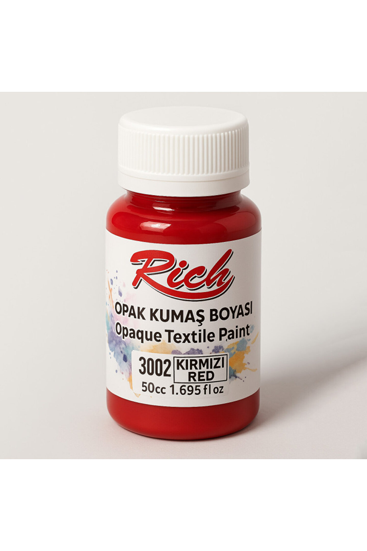 Rich Kumaş Boyası Opak 50 cc Kırmızı Su bazlıdır.; Tüm kumaş türleri üzerinde etkilidir.; Bir kat sürülmesi tavsiye edilir.; Boyama işlemi yapıldıktan sonra 1 gün kurumaya bırakılır.; Daha sonra ise ütüleme işlemi yapılarak sabitleme sağlanır.; Yoğun pigmentli yapısıyla opak kumaş boyası, kumaş üzerinde güçlü ve kalıcı renkler oluşturur.; Özel formülü sayesinde pamuk, keten, polyester ve karışımlı kumaşlarda mükemmel bir kapatıcılık sağlar.; Esnek ve çatlamayan yapısı, boyanan yüzeyin doğal dokusunu korumasına yardımcı olur.; Tekstil tasarımlarında, kıyafet yenileme ve dekoratif projelerde profesyonel sonuçlar elde etmek isteyenler için idealdir.