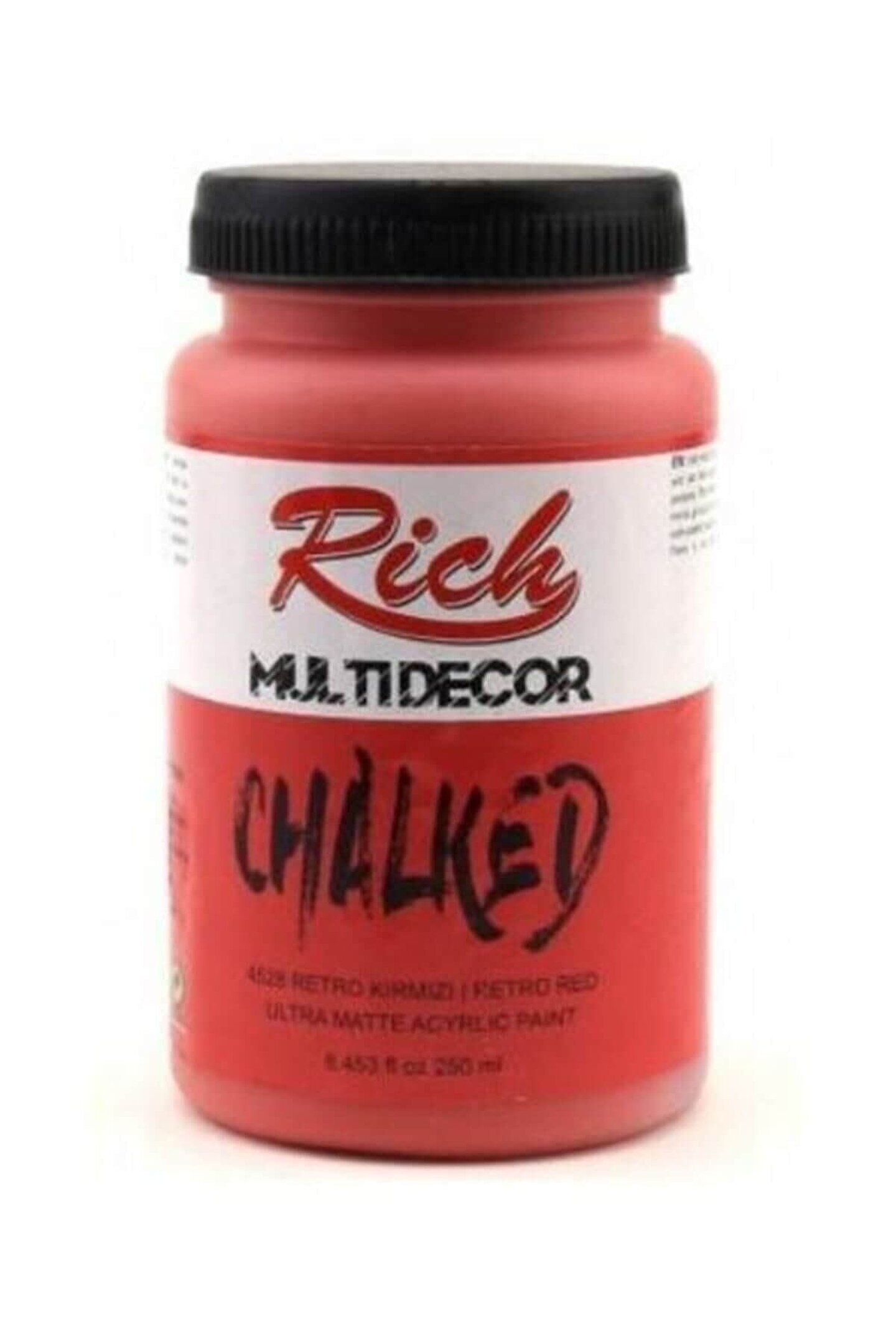Rich Multi Decor Chalked 250 Cc 4528 Retro Kırmızı Akrilik Boya Rich Multi Decor Chalked Paint serisi Her türlü yüzeye uygulama yapabileceğiniz kuruduğunda kadifemsi mat dokusu olan su bazlı akrilik boyadır. Dekoratif amaçla her türlü yüzeyde kullanılabilen Ultra Mat, Su Bazlı boyalardır. Ahşap, metal, cam, kumaş, seramik, polyester, vernikli ve kaplamalı yüzeylerde sabitleştirme gerektirmeden direkt uygulanır. Deri ile temasında zararı yoktur.
