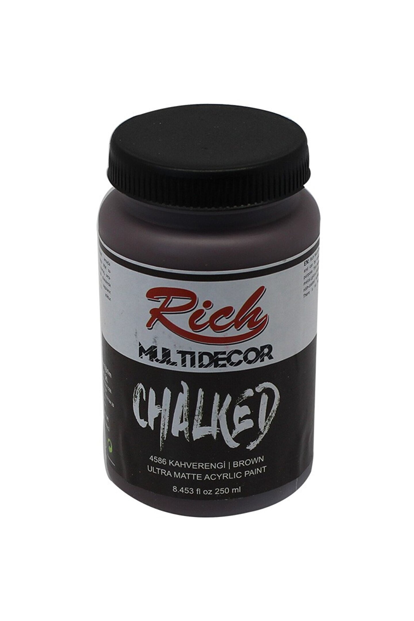Rich Multi Decor Chalked 250 cc Kahverengi 4586 Rich multi decor chalked akrilik boya, istediğiniz yüzeyde kullanılabilir, ağır örtücü, ultra mat kadifemsi, su tabanlı akrilik boyadır.; Ahşap, mdf, metal, cam, kumaş, seramik gibi vernikli ya da verniksiz tüm yüzeylere direkt olarak uygulanabilmektedir.; Zımpara ya da astar boya gerektirmez.; Fırça izi bırakmaz.; Sulandırılma ihtiyacı yoktur.; Kat aralarında ortalama 6-8 saat beklenmelidir.; Rich Multi Decor Chalked Nasıl Kullanılır? Rich Multi Decor Chalked ile mobilyalarınızı rahatlıkla boyayabilirsiniz.; Zımpara yapılmasına gerek olmayan bu hobi boyası aynı zamanda kokusuz olmasıyla da dikkat çeken ve rakiplerine açık ara fark atan birinci kalite bir boyadır.; Akrilik yapıdadır.; Rich Multi Decor Chalked ile siz de kendi evinizin mimarı olabilirsiniz.; Multi surface boyalar her yüzeyde rahatlıkla uygulanabilen ve eşyalarını geri dönüşüm için özel olarak hazırlanmış kokusuz ve özel bir boya grubudur.; Astar atmanıza gerek kalmaz.; Boyama işleminden sonra Rich Su Bazlı Vernik ürünü ile 2 kat verniklenmelidir.; Unutmayın ki boyaya su katmanın amacı boya miktarını arttırmak değil fırçanın boyarken yüzeyde daha rahat kalmasını sağlamaktadır.; Boyama işlemi bittikten sonra ortalama 2 gün geçince Rich Su bazlı vernik ile boyarsanız ve 2 kat arası bir gün beklerseniz maksimum verim i alabilirsiniz.; Rich Multi Decor Chalked boyalar ile su kullanımınıza gerek kalmaz, çünkü boya zaten yüzeyde fırça ile akıcı bir kıvamdadır.; Siz de rich multi decor chalked ile eski mobilyalarınızı yenileyebilir ve kendi evinizin mimarı olabilirsiz! Unutmayın ki Rich Multi Decor Chalked boyalar tüm yüzeyler için uygulanabilir.; Geniş yüzeylerde maxi ipek rulo veya kadife rulo kullanabilirsiniz.; Aynı zamanda ufak alanlar için rich sünger ponpon fırçalar işinizi büyük ölçüde görecektir.; Aynı zamanda ponpon fırçalar ile boyama yaparken klasik fırçalara göre çok daha az yüzey izi bırakmış olursunuz.; Daha fazla hobi boyama ürünü için mağazamızı gezinebilirsiniz.; Rich multidecor chalked akrilik boya, istediğiniz yüzeyde kullanılabilir, ağır örtücü, ultra mat kadifemsi, su tabanlı akrilik boyadır.; Ahşap, mdf, metal, cam, kumaş, seramik gibi vernikli ya da verniksiz tüm yüzeylere direkt olarak uygulanabilmektedir.; Zımpara ya da astar boya gerektirmez.; Fırça izi bırakmaz.; Sulandırılma ihtiyacı yoktur.; Kat aralarında ortalama 6-8 saat beklenmelidir.; Siparişleriniz bidoluhobi tarafından özenle hazırlanır ve en kısa sürede ilgili kargo firmasına teslim edilir.