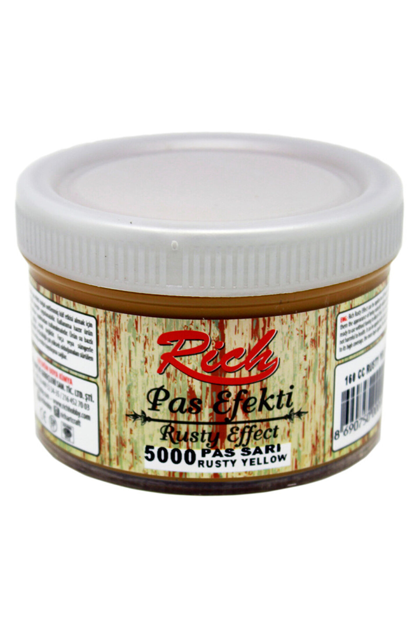 Rich Pas Efekti 150 cc Pas Sarı 5000 Rich pas efekti doğal oksitlenmiş küf etkisi almak için her türlü yüzeye uygulanabilir.; Kullanıma hazırdır inceltme yapılmadan kullanılması tavsiye edilir.; Pas Efekti boyalar ahşap hobi malzemelerinin boyanmasında olmazsa olmaz bir ürün grubu haline gelmiştir.; Pas efekti boyalar kullandığınız alanda paslanmış ve eskimiş bir görüntü vermektedir.; Birçok alanda kullanıma uygun olan pas efekti boyaları inceltme yapmadan kullanmanız tavsiye edilmektedir.; Pas Efekti boyaları kullanmadan önce kullanacağınız alana ister kabartma şekilde oymalar, isterseniz zemin oluşturmak için farklı materyaller kullanabilirsiniz.; Pas efekti boyalar yoğun gruplu boyalardan olduğu için kullandığınız zemini rahatlıkla kapatacaklardır.; İsteğe göre kullanmadan önce yüzey ince bir zımparayla zımparalandıktan sonra, hafif nemli bir bezle silinebilir.; Silindikten sonra Pas efekti boyanız bir kat sürülür ve kurumaya bırakılır.; İhtiyaca göre 2 kat da sürebilirsiniz.; Katlar arasında 6-8 saat beklemeniz tavsiye edilmektedir.; Siz de daha fazla hobi boyama malzemesi için mağazamızın ürün kataloğunu gözden geçirebilirsiniz.