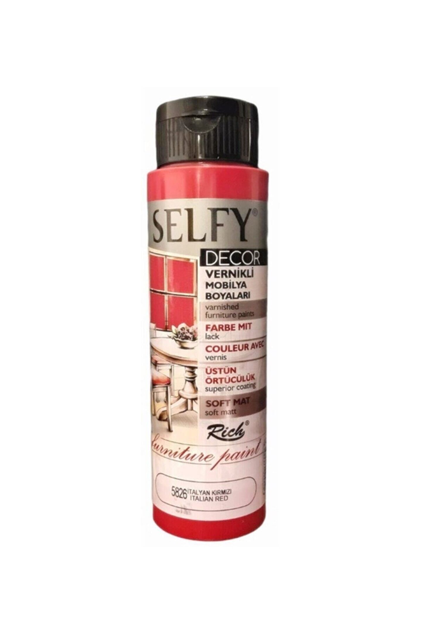 Rich SELFY DECOR Mobilya Boyaları dekoratif amaçlı olup su bazlı kendinden vernikli boyalardır. ; Uygulanacak olan yüzey temiz ve kuru olmalıdır. ; Kat aralarında minimum 4-6 saat beklenmeli, ürün kullanılmadan önce mutlaka çalkalanmalıdır. ; Tam sabitlenme süresi ortalama 4-5 gündür. ; Boyama işlemi sonucunda ekstra bir vernik gerektirmez. ; Sulandırma gerektirmez. ; Boyama işlemi sonucunda ekstra bir vernik gerektirmez. ; Daha parlak bir görünüm istenirse üzerine Rich High Gloss vernik sürülebilir. ; Tam sabitlenme süresi ortalama 4-5 gündür. ; Sağlığa zararlı madde içermez. ; CE ve EN71 normlarına uygundur. ; Rich Selfy Decor Vernikli Mobilya Boyaları Üstün Örtücülük Soft Mat;