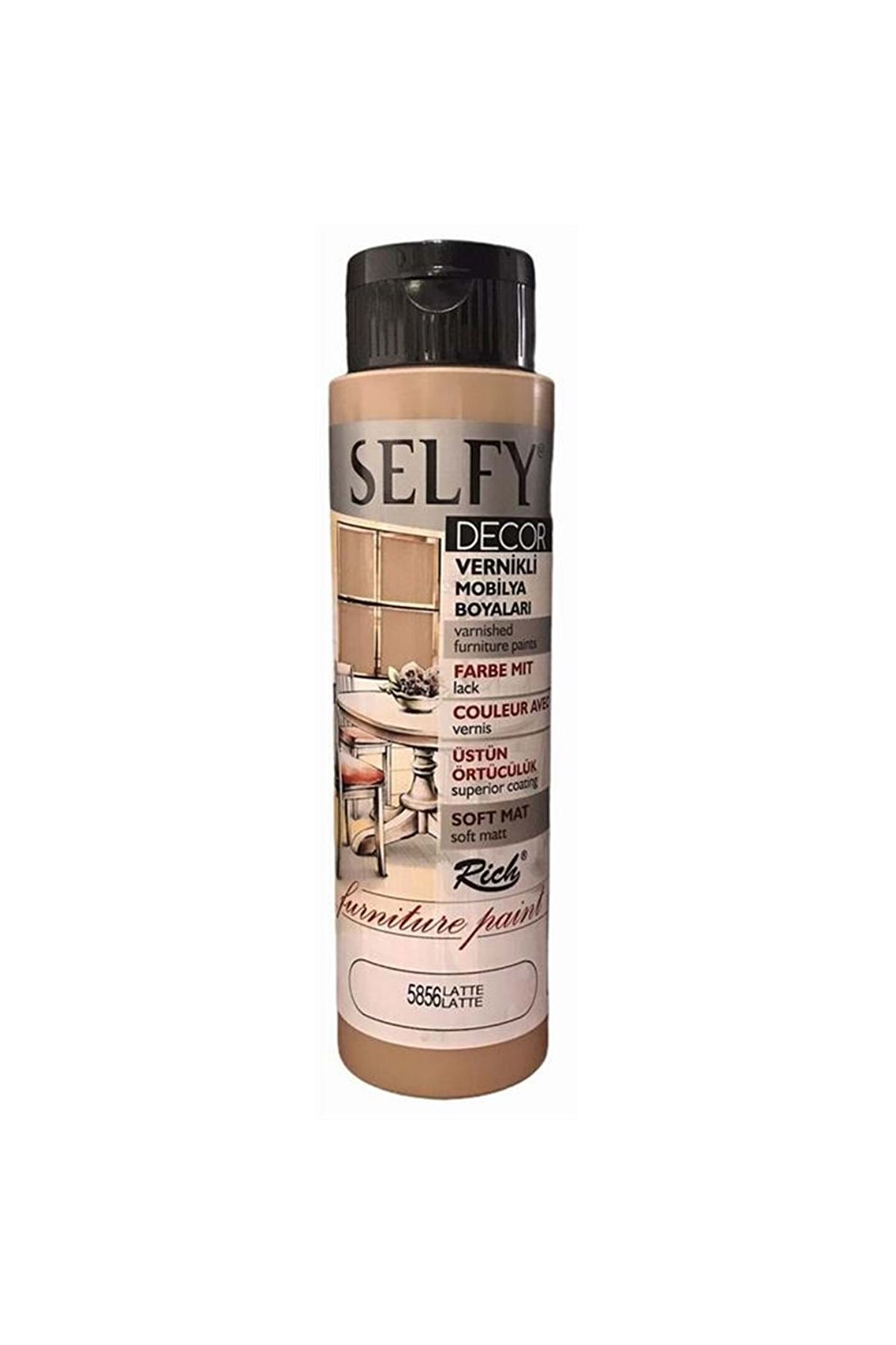 Rich SELFY DECOR Mobilya Boyaları dekoratif amaçlı olup su bazlı kendinden vernikli boyalardır. ; Uygulanacak olan yüzey temiz ve kuru olmalıdır. ; Kat aralarında minimum 4-6 saat beklenmeli, ürün kullanılmadan önce mutlaka çalkalanmalıdır. ; Tam sabitlenme süresi ortalama 4-5 gündür. ; Boyama işlemi sonucunda ekstra bir vernik gerektirmez. ; Sulandırma gerektirmez. ; Boyama işlemi sonucunda ekstra bir vernik gerektirmez. ; Daha parlak bir görünüm istenirse üzerine Rich High Gloss vernik sürülebilir. ; Tam sabitlenme süresi ortalama 4-5 gündür. ; Sağlığa zararlı madde içermez. ; CE ve EN71 normlarına uygundur. ; Rich Selfy Decor Vernikli Mobilya Boyaları Üstün Örtücülük Soft Mat;