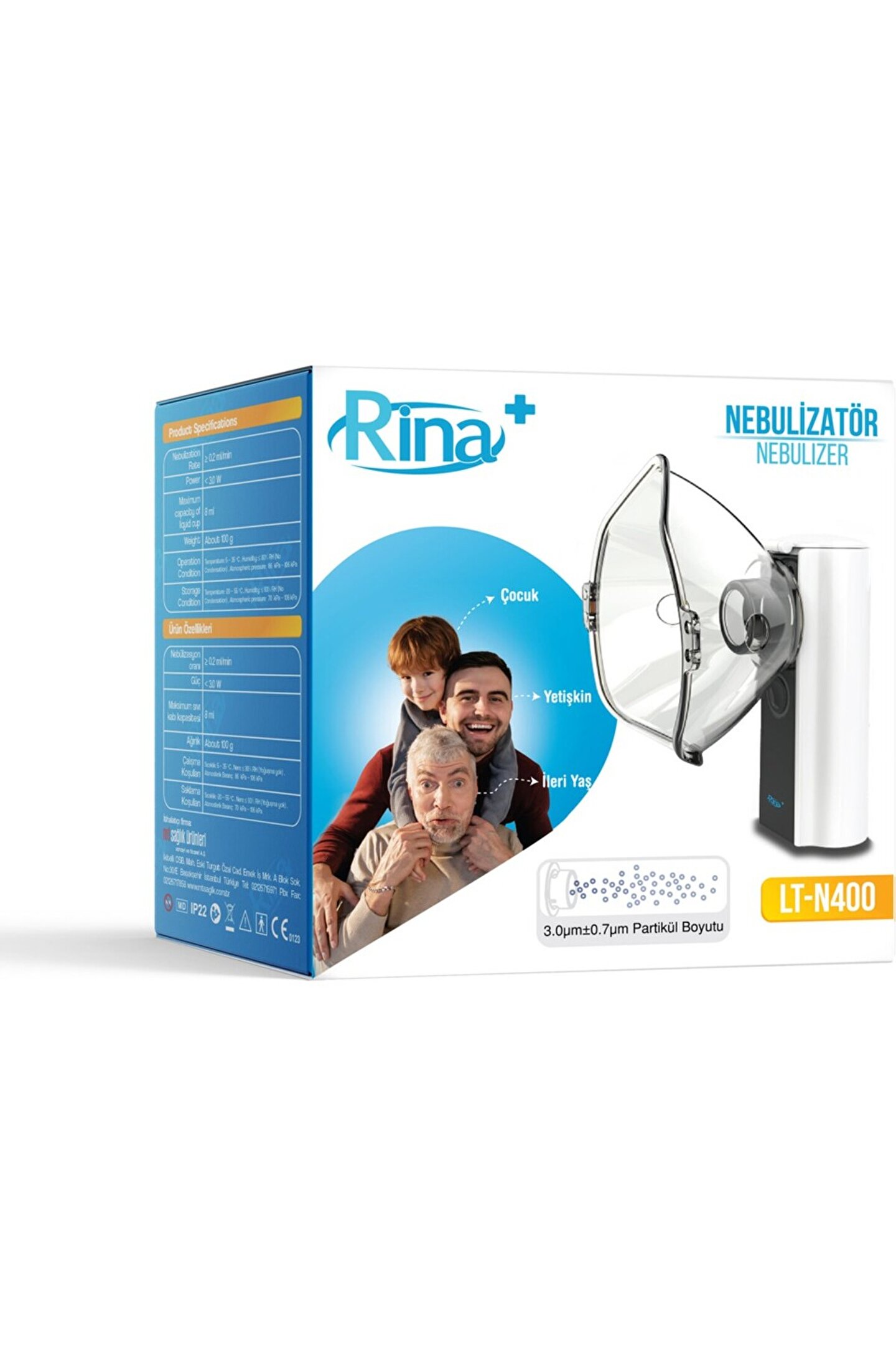 Ürün Özellikleri: Şarj Edilebilir Dahili Bataryalıdır. Nebülizasyon Oranı≥ 0.2 ml/minGüç< 3.0 WMaksimum Sıvı Kabı Kapasitesi8 mlDikkatYüksek konsantrasyon, yüksek viskozite, askıda kalan sıvı ve uçucu sıvı, nebülizasyon tabakasının hasar görmesine veya tıkanmasına neden olabilir. Lütfen doktorun rehberliğinde doğru ilaç tipini, kullanım yöntemini ve dozajını seçin.Lütfen nebulizasyon için saf su veya damıtılmış su kullanmayın; saf su yalnızca sıvı kabını temizlemek için kullanılabilir.Her kullanımdan sonra kalan sıvıyı temizlediğinizden emin olun, tekrar kolay kullanım için sıvı kabını, maskeyi ve ağızlığı temizleyin.Hasarı önlemek için lütfen sıvı kabını doğrudan temizlemek için akan su kullanmayın veya nebülizasyon tabakasına herhangi bir nesneyle dokunmayın.Ürün KullanımıGüç düğmesine kısaca basın. Yeşil gösterge ışığı yanıp sönerek nebülizörün otomatik temizleme moduna girdiğini gösterir.Temizleme döngüsü tamamlandığında, nebülizasyon işleminin başladığını gösteren yeşil gösterge ışığı sabit kalacaktır.Nebulizatör, otomatik olarak kapanmadan önce 10 dakikalık tek bir döngü için çalışacak şekilde tasarlanmıştır. Cihazı kullanmaya devam etmek istiyorsanız kapama/açma düğmesine tekrar kısa bir süre basmanız yeterlidir.Nebulizasyon işlemi sonunda kapatma tuşuna kısa süre basarak cihazı kapatabilirsiniz.