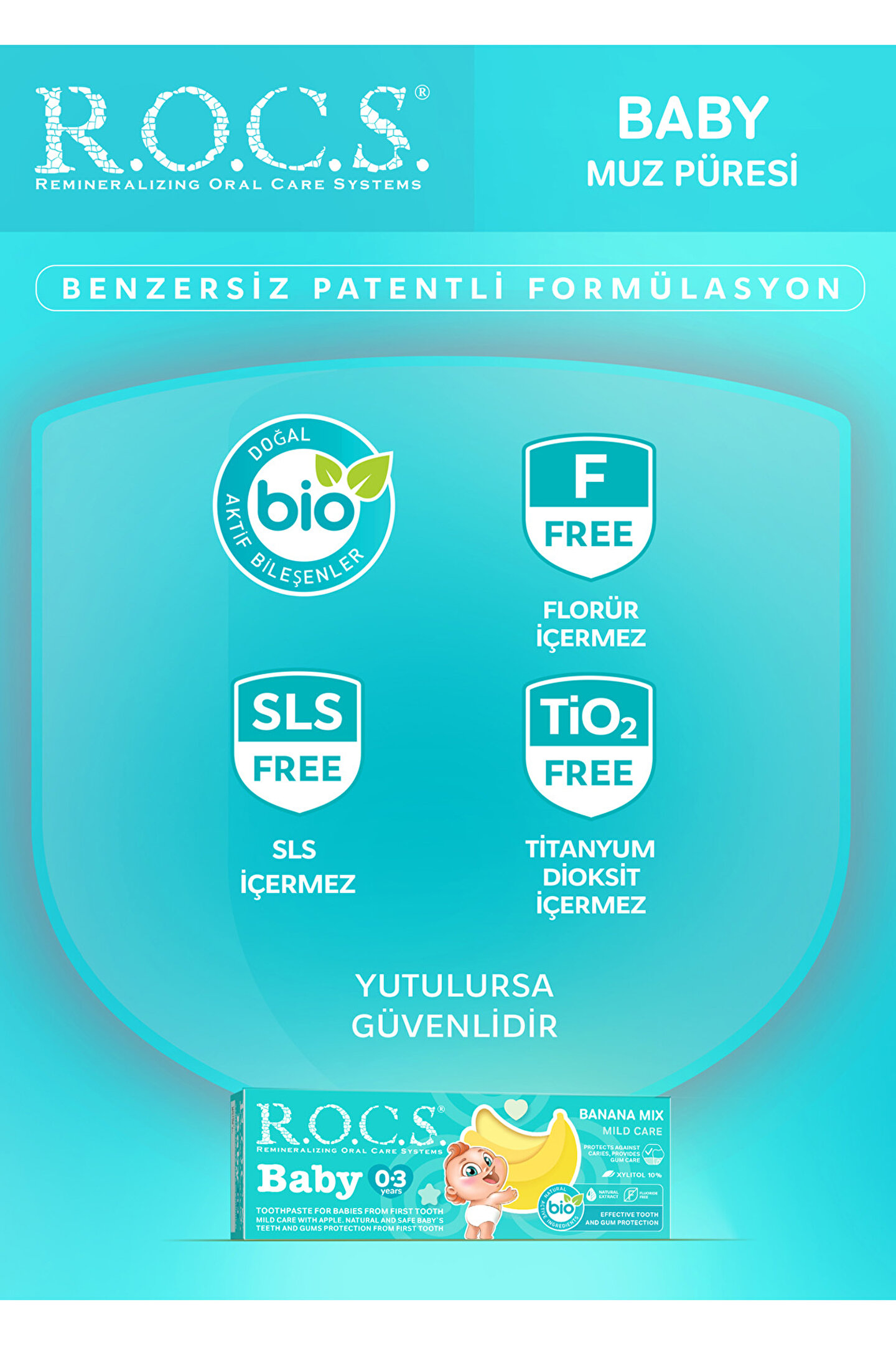 Açıklama: R.; O.; C.; S.; Baby diş macunu bebek dişlerini, diş minesine zarar vermeden nazikçetemizlemeye yardımcı olur.; ; Diş minesinin doğal mineralizasyonunu destekleyerekgüçlenmesini sağlamayı hedefler.; ; Huş ağacındanelde edilen doğal ksilitoliçeriği çürüklere karşı güvenli koruma sağlar.; Florür ve sodyum lauril sülfat,içermez.; ; Bebeklerin çok sevdiği muz püresi tadı doğal bileşenlere dayanır.;