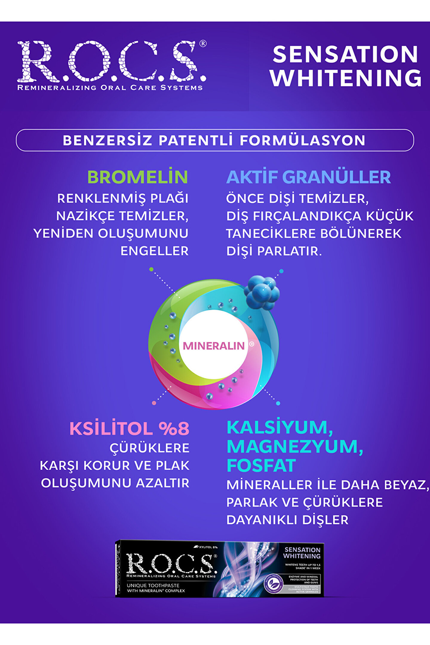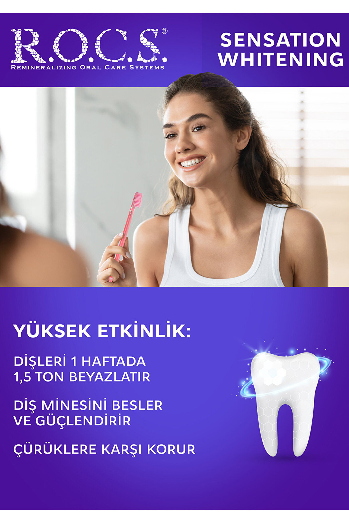 Rocs Sensation Whitening dişlerinizi 1 haftada 1,5 ton beyazlatan etki sistemi size hiç yaşamadığınız bir deneyim sunuyor.; R.; O.; C.; S.; Sensation whitening ekstra parlatıcı granüller ile dişlerinizin çok daha beyaz ve parlak gözükmesini sağlar.; İçeriğindeki Bromelin enzimi renklenmiş diş plağını çözer.; Özel parlatıcı granüller diş yüzeyini temizler ve beyazlatır.; Bu granüller daha küçük parçacıklara ayrılarak diş yüzeyini daha da parlatır ve fırçalama sonunda dişlerin ışıldamasını sağlar.; Dişlerin günde en az 2 kez fırçalanması önerilir.