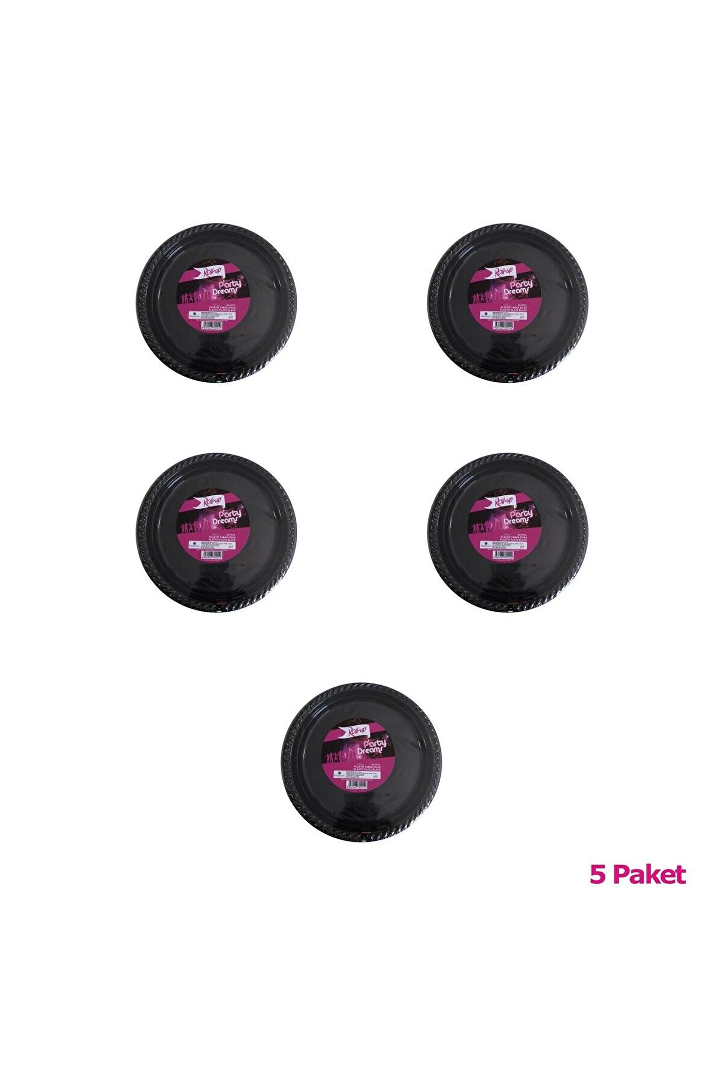 Roll-Up Parti Tabak Malzeme : Plastik Tür : Tek Kullanımlık Form : Yuvarlak Renk : Siyah Çap : 22 Cm. Paket İçi : 25 Adet Tabak Koli İçi : 5 Paket Toplam : 125 Adet Tabak