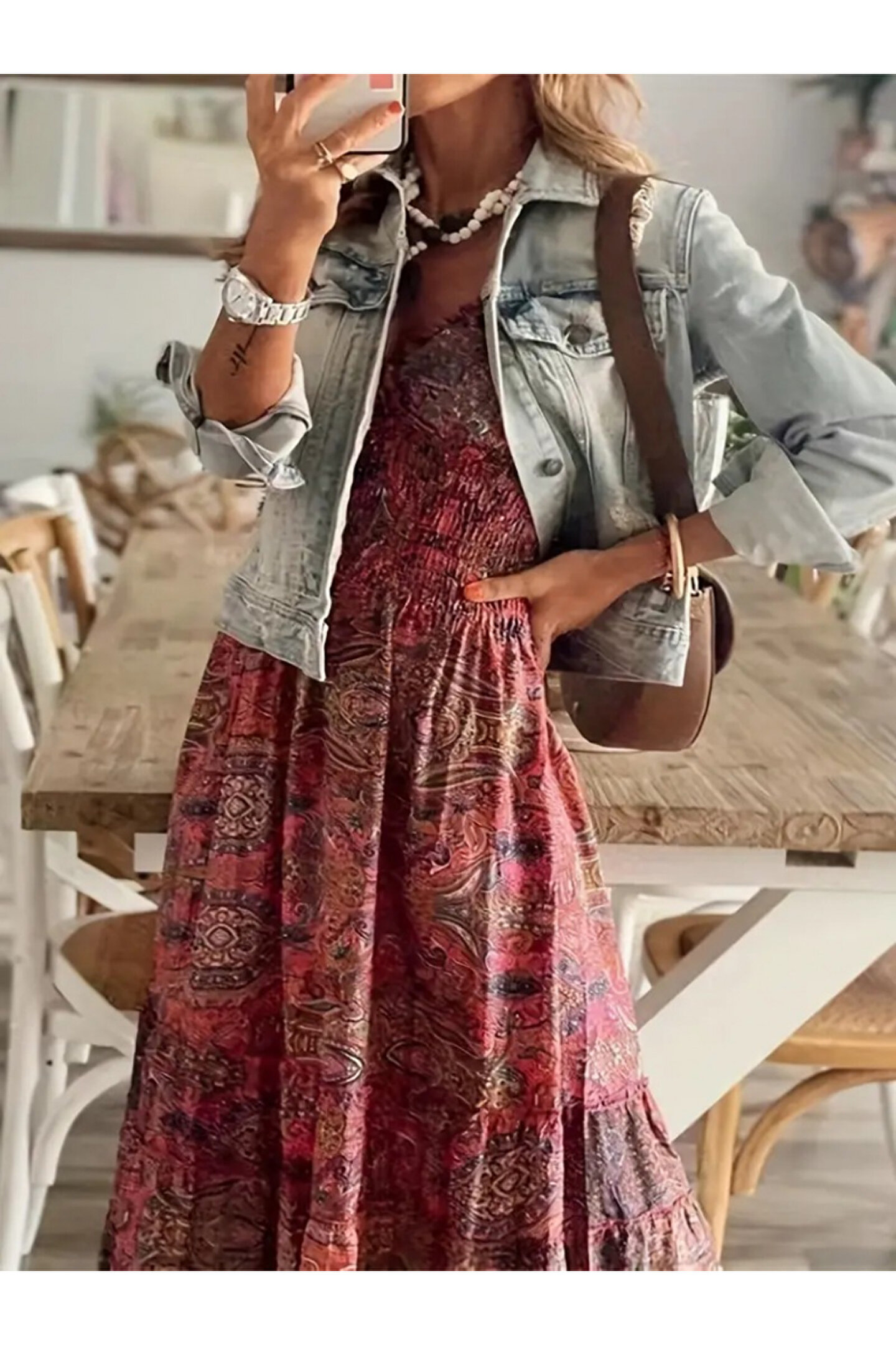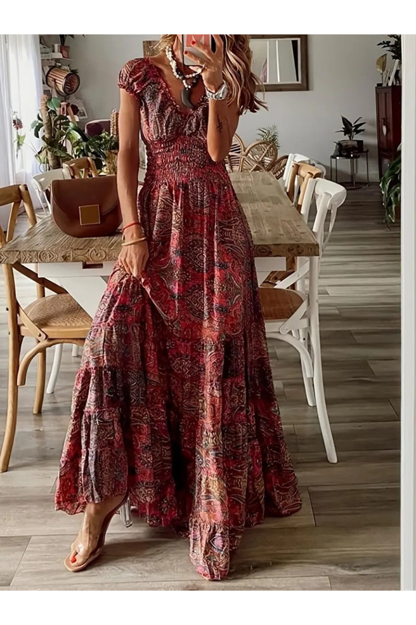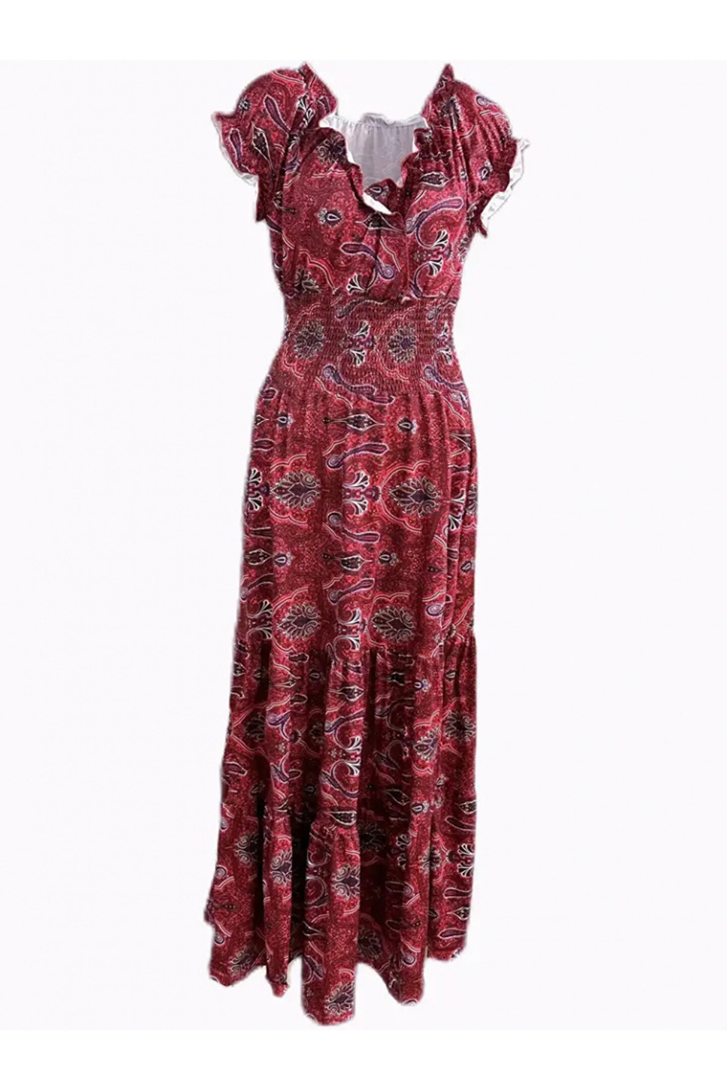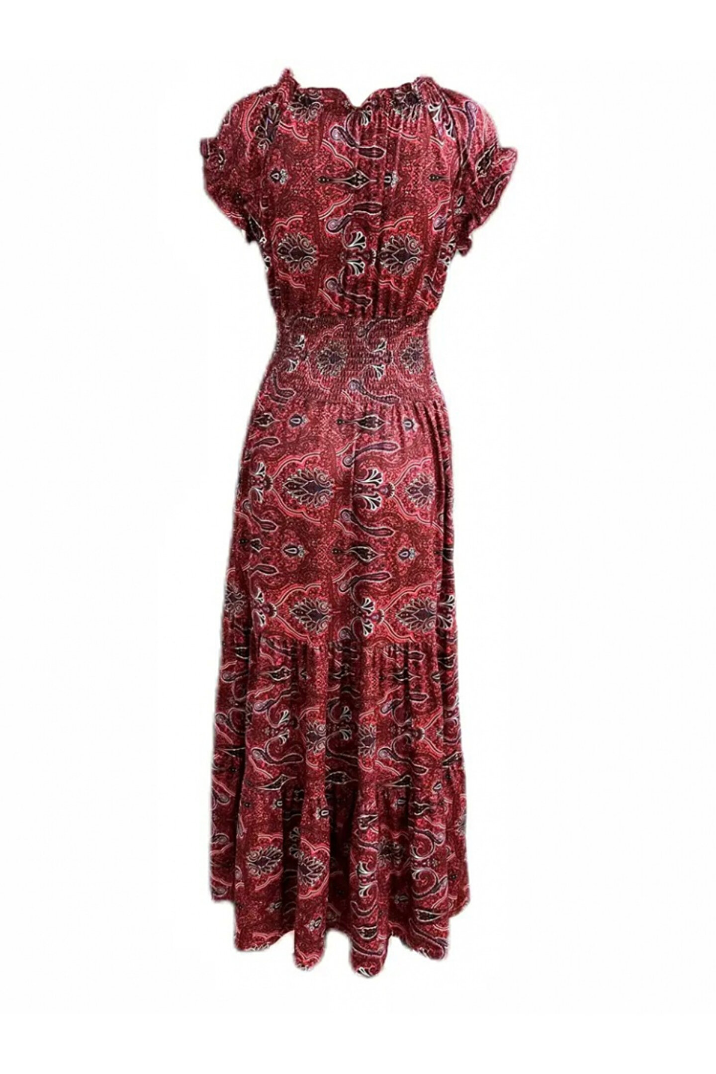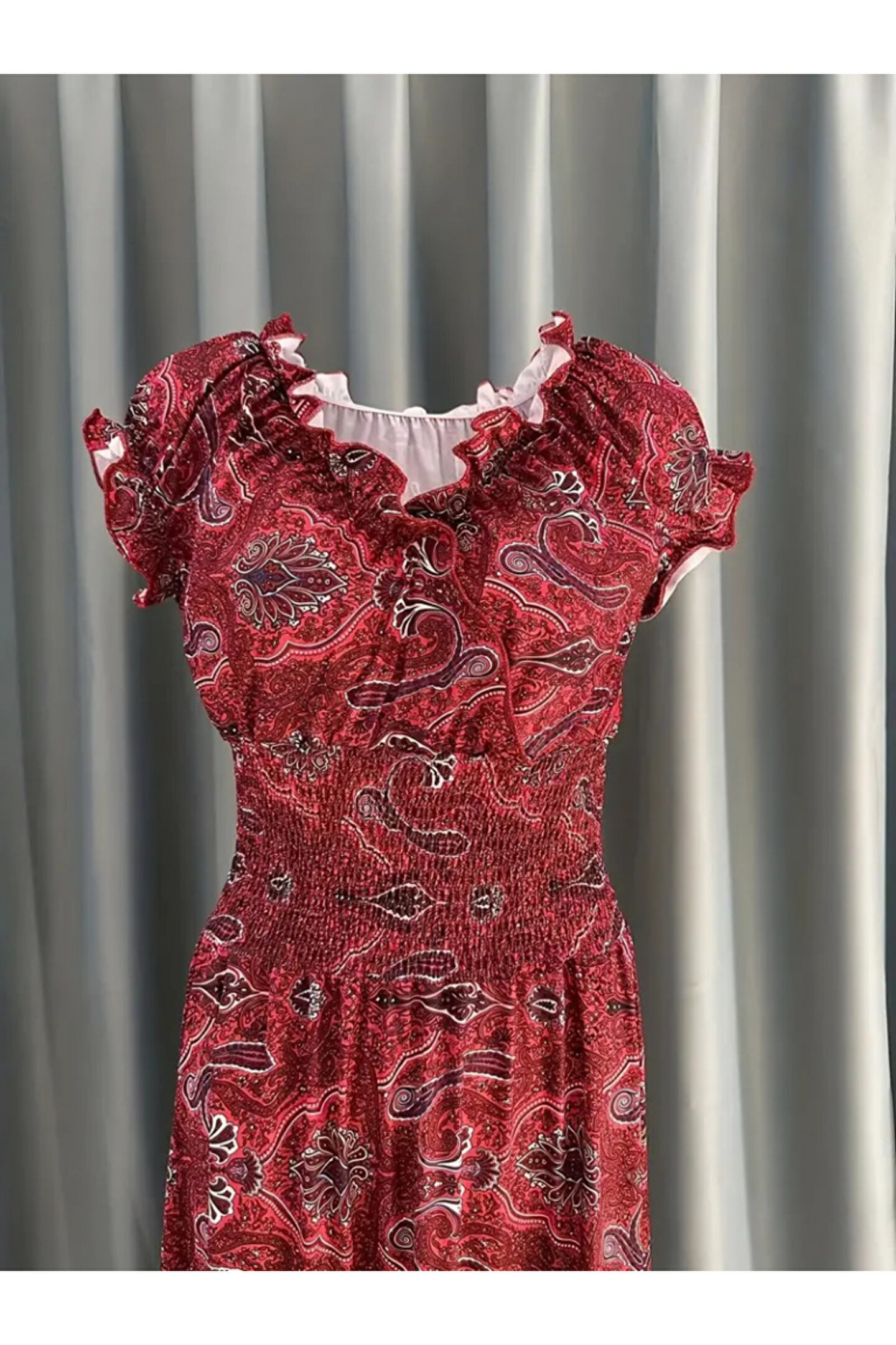 Ronanna Kadın Kısa Kollu V Yakalı Beli Gipeli Desenli Süprem Maksi Elbise