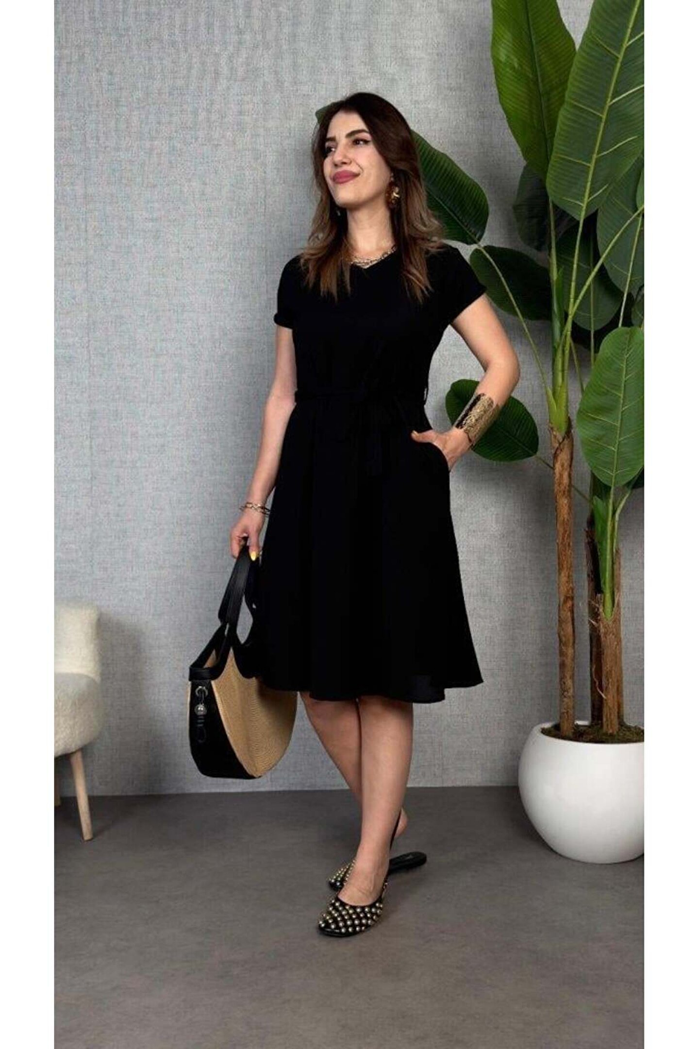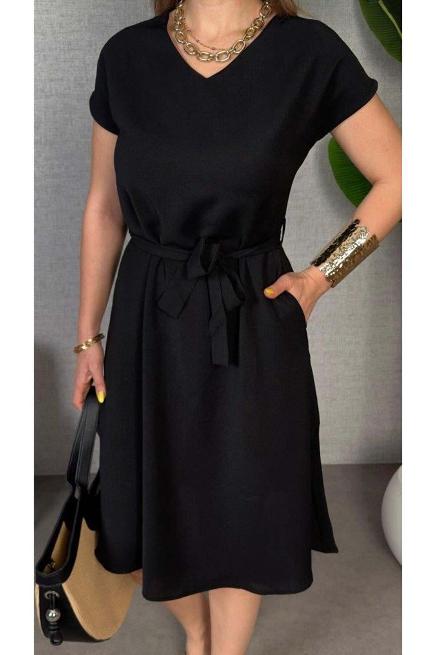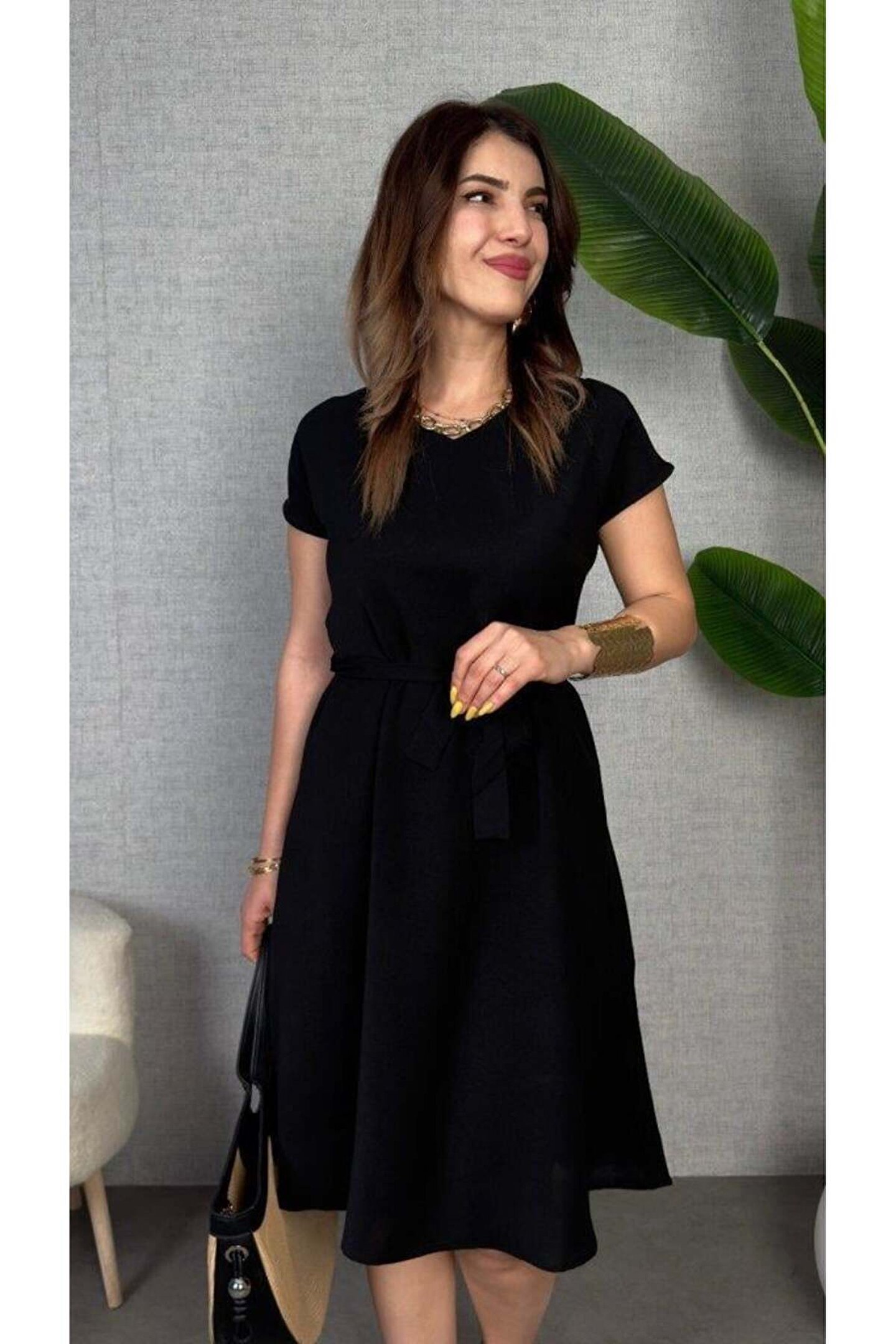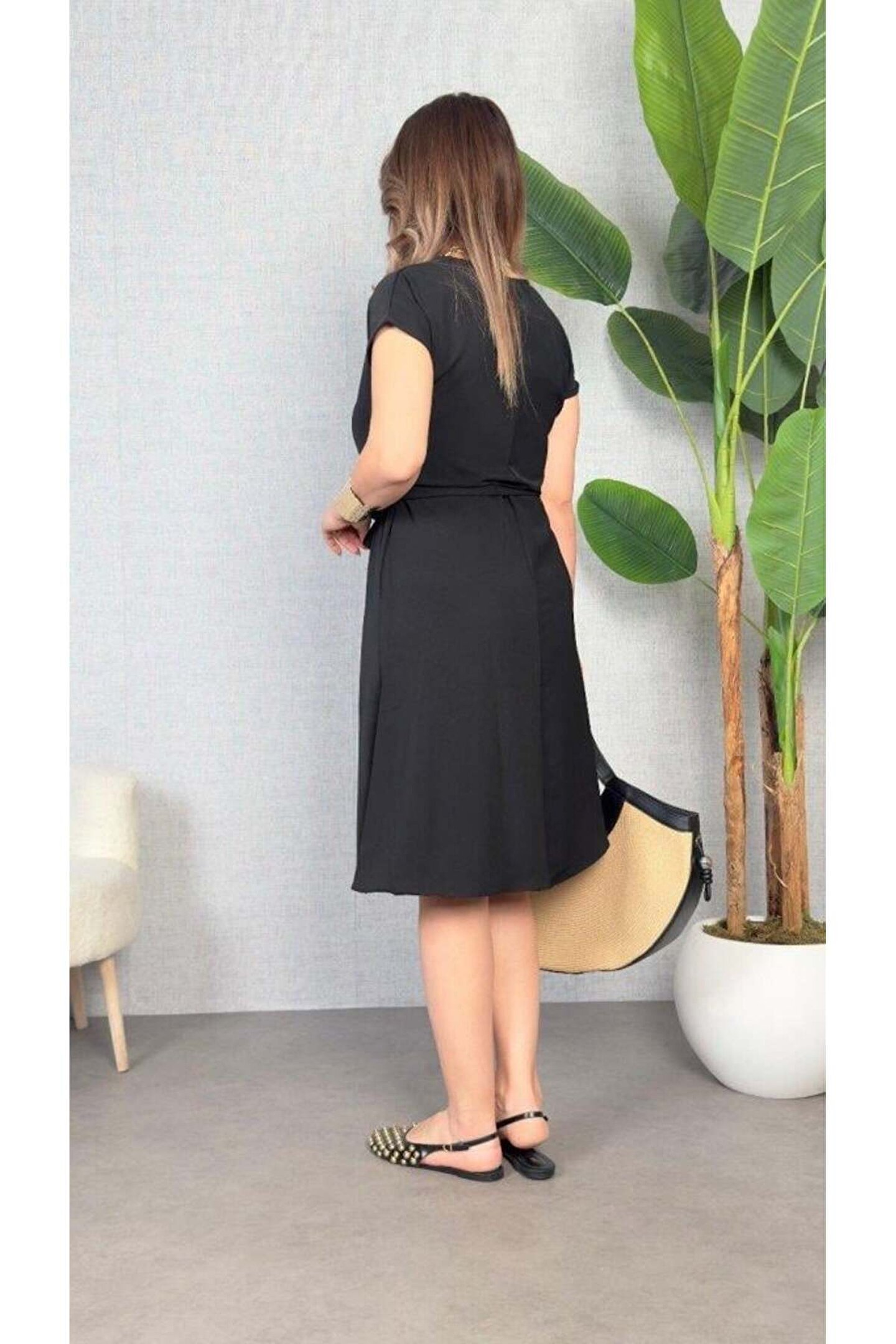 Kadın Kısa Kollu V Yakalı Beli Kuşaklı Ithal Keten Elbise