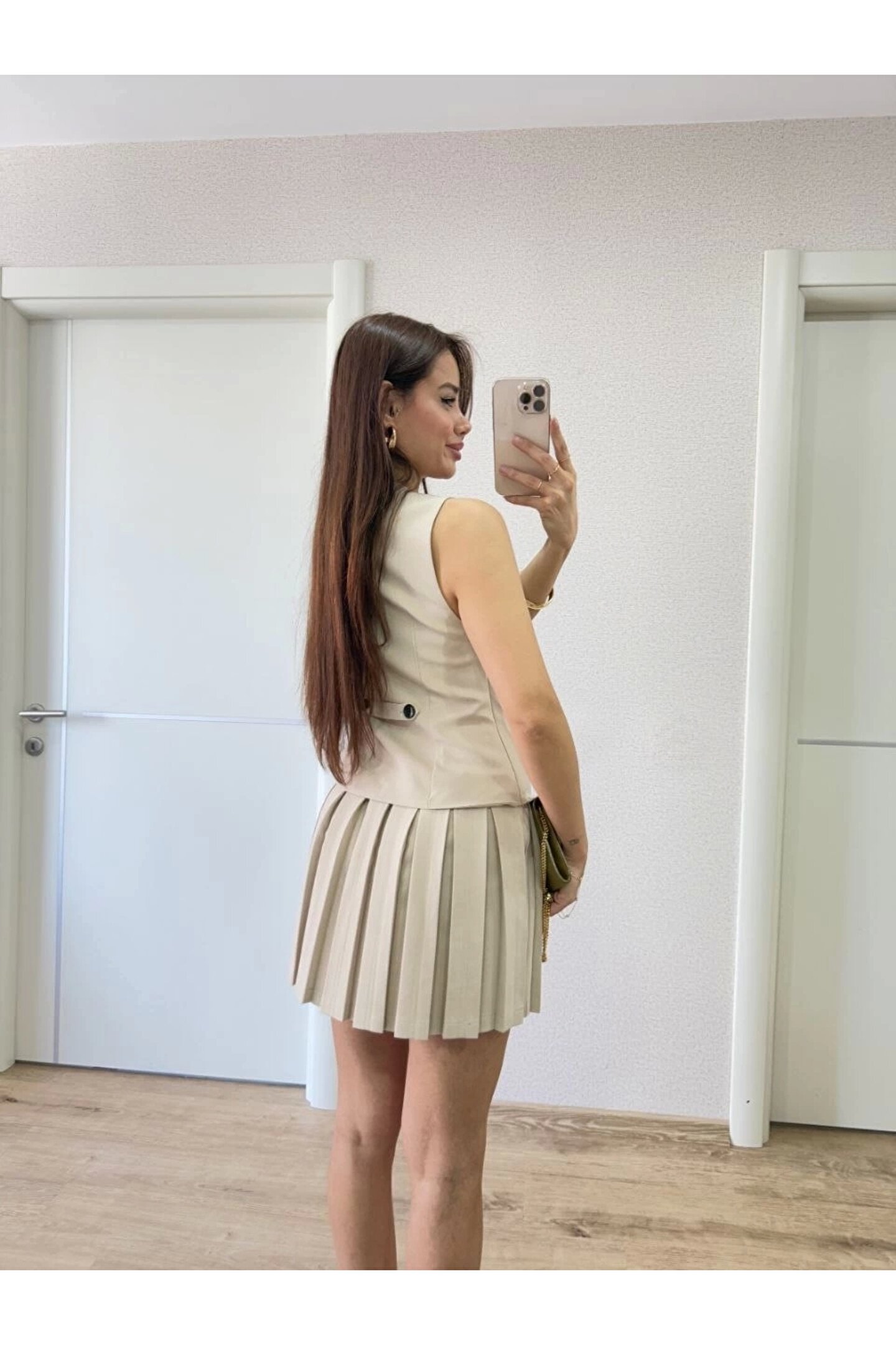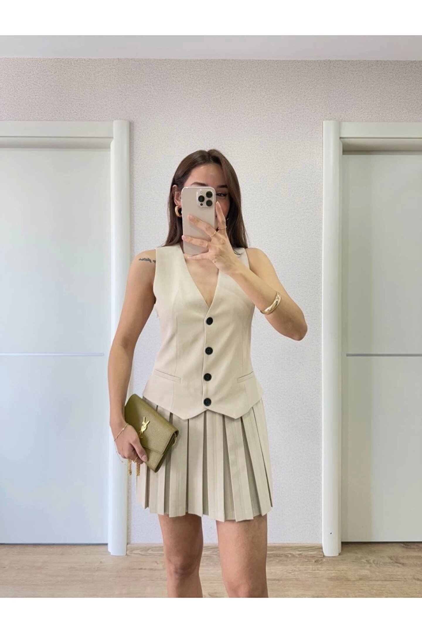 - Keten kumaştan üretilmiş olup, hafifliği ve nefes alabilir yapısıyla gün boyu konfor sağlar.; - Bej rengiyle zamansız bir şıklık sunar ve farklı aksesuarlarla kolayca kombinlenebilir.; - Mini boy tasarımı ile modern ve dinamik bir görünüm kazandırırken, genç tarzınıza uyum sağlar.; - Düğme detayları sayesinde hem şık hem de pratik kullanım imkanı sunar; kolayca giyilip çıkartılabilir.; - Slim kalıbı vücut hatlarınıza mükemmel uyum sağlayarak zarif bir siluet oluşturur.; - Trend ortamlarda dikkat çekici bir stil yaratmanız için idealdir; günlük kullanım veya özel davetlerde tercih edilebilir.; - Düz deseniyle sadelikten yana olanların beğenisini kazanacak şekilde tasarlanmıştır; leke tutmaz özelliğiyle bakımı kolaydır.; - Kolsuz tasarım yaz ayları için serinlik ve rahatlık sunarken, V yaka kesimiyle feminen çizgilere sahiptir.; - Keten materyali sayesinde uzun süreli kullanım vaad ederken aynı zamanda dayanıklılığı arttırır.