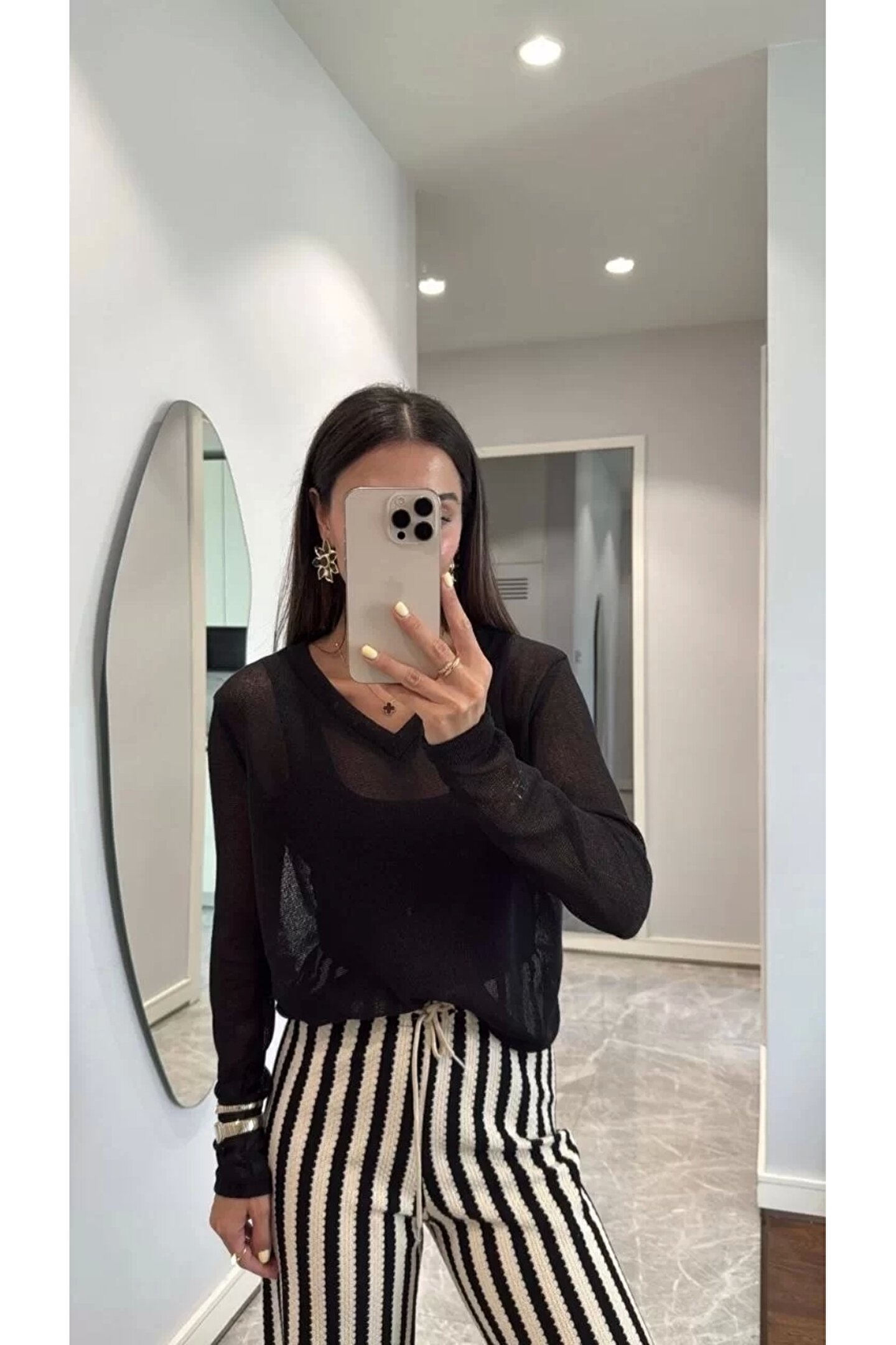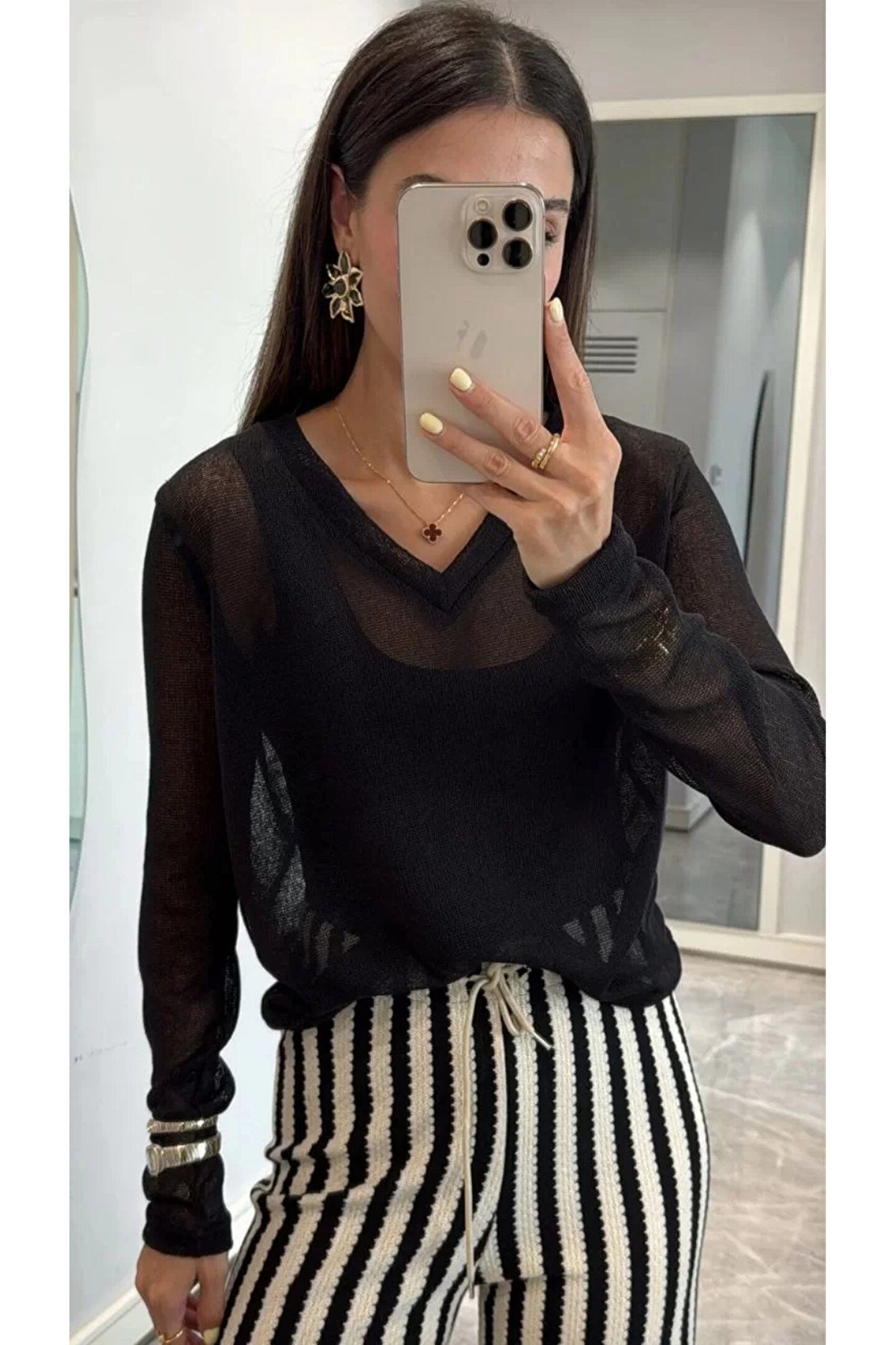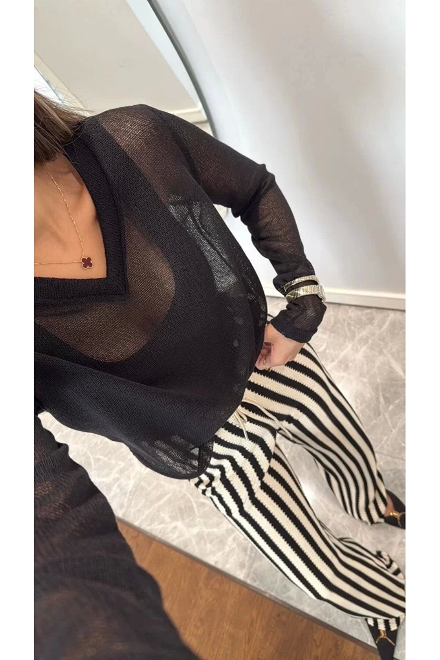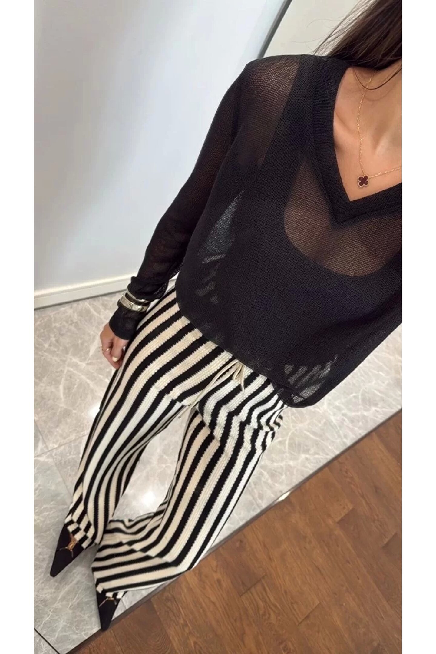 - V yaka tasarımı ile modern ve şık bir görünüm sunar.; - Siyah renk seçeneği, kolay kombin yapabilme imkanı sağlar.; - Triko kumaşı sayesinde yumuşak dokunuşu ve konforlu kullanımı ön plana çıkar.; - Genç yaş grubuna hitap eden dinamik ve trend bir stil sunar.; - Standart boy uzunluğuyla farklı vücut tiplerine uyum sağlar.; - Dijital baskı teknolojisiyle üretilmiş deseni canlı ve kalıcıdır.; - Kutusuz ambalajı ile minimalist bir yaklaşım sergiler.; - Düz kesimi sayesinde rahat hareket etme özgürlüğü tanır.; - Tül dokuması hafifliği ve zarifliğiyle dikkat çeker.; - Uzun kollu tasarım soğuk günlerde ekstra koruma sağlar.; - Parti ortamları için idealdir; şıklığı ve rahatlığı bir arada sunar.; - Cepsiz yapısı pratik kullanım vaad ederken, astarsız oluşu hafiflik hissi verir.; - Her mevsime uygun ortamda tercih edilebilen çok yönlülük gösterir.