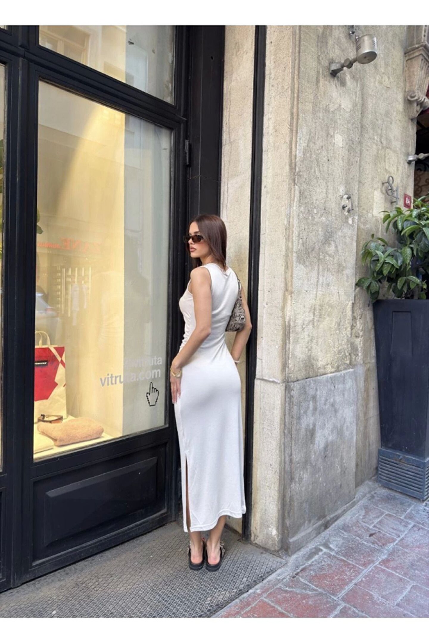 SA Alişveriş Dünyam Osy Modal Yumuşak Dokulu Kumaş Bisiklet Yaka Sıfır Kolsuz Yırtmaçlı Uzun Elbise - Beyaz