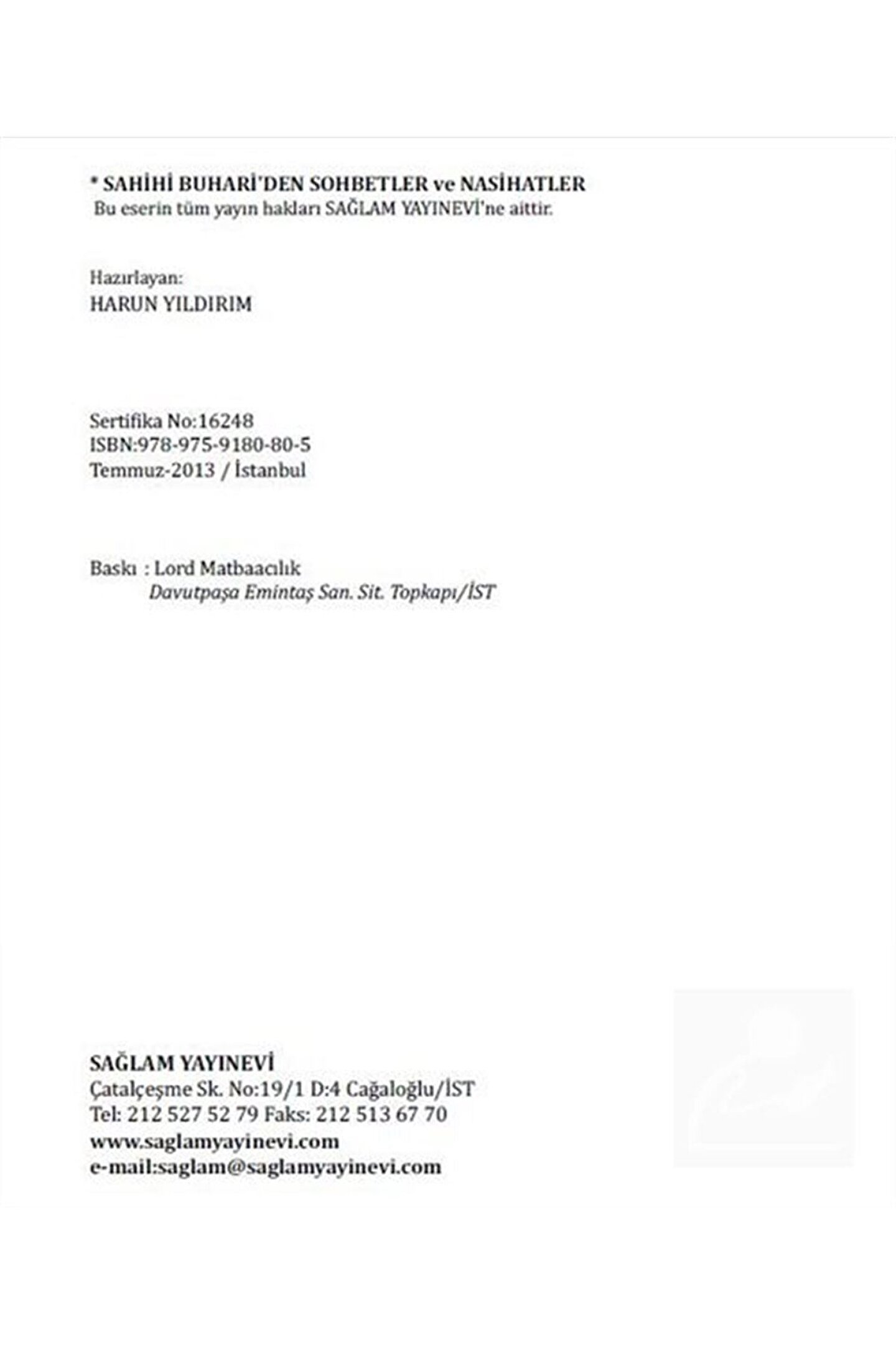 Sahihi Buhari'den Sohbetler ve Nasihatler Harun Yıldırım / Sağlam Yayınları Basım Yılı: 2013; Sayfa Sayısı: 1006; Kağıt Türü: Kitap Kağıdı; Ebat: 16,5 x 24; Dil: Türkçe; Cilt Durumu: Ciltli; ISBN: 9789759180805; Yazar: Harun Yıldırım; Hatibin minberdeki görevi, peygamber görevinin bir devamıdır.; Peygamberimizin minberdeki sesini günümüze kadar hatipler taşıya gelmiştir.; Bu cihetle hatiplerin sorumluluğu ve görevlerinin kudsiyeti tartışılamaz derecede yüksektir.; Allah Rasûlü sallallahu aleyhi ve sellem Cuma günü cemaat toplanınca mescide girer, ashabına selâm verir, minbere çıkınca kıbleye dönüp dua etmez, yüzünü cemaate çevirip ezanı dinlemek üzere otururdu.; Ezandan sonra kalkıp Allah'a hamd, sena ve şehadetten sonra; coşkulu ve uyarıcı bir sesle hutbeyi irad ederdi.; Hutbeyi kısa tutar, namazı uzatır, Allah'ı çok anar, kısa ve özlü sözler kullanırdı.; Hutbelerinde; İslâmın temel esaslarını anlatır, emir ve nehiylerini bildirir, ashabının ihtiyaç duyduğu uyarıcı ve müjdeleyici konularda hutbeler okurdu.; Yeri geldiğinde hutbesini keserek cemaatiyle ilgilenir, sorulara cevap verir, bazen minberden inip tekrar çıkar ve daha sonra hutbesine devam ederdi.; Hutbenin, cemaati bire bir olarak ilgilendirmesi, dikkatini çekmesi, Fikir ve yol göstermesi, her alanda dinleyiciyi tatmin etmesi gerekir.; Allah Rasûlü sallallahu aleyhi ve sellemin yalnızca Cuma ve bayram namazları ile sınırlı değildir.; Bazen sabah namazından sonra, bazen öğle namazından sonra hutbe okumuş insanlara İslâm'ı anlatmıştır.; Hutbeler dinin anlaşılmasında büyük önem taşımaktadır.; Allah Rasûlü sallallahu aleyhi ve sellem ve ashabının hutbeleri bizim için birer hazine niteliğindedir, insanları aydınlatıcı, yol gösterici, öğretici mesajlarla doludur.