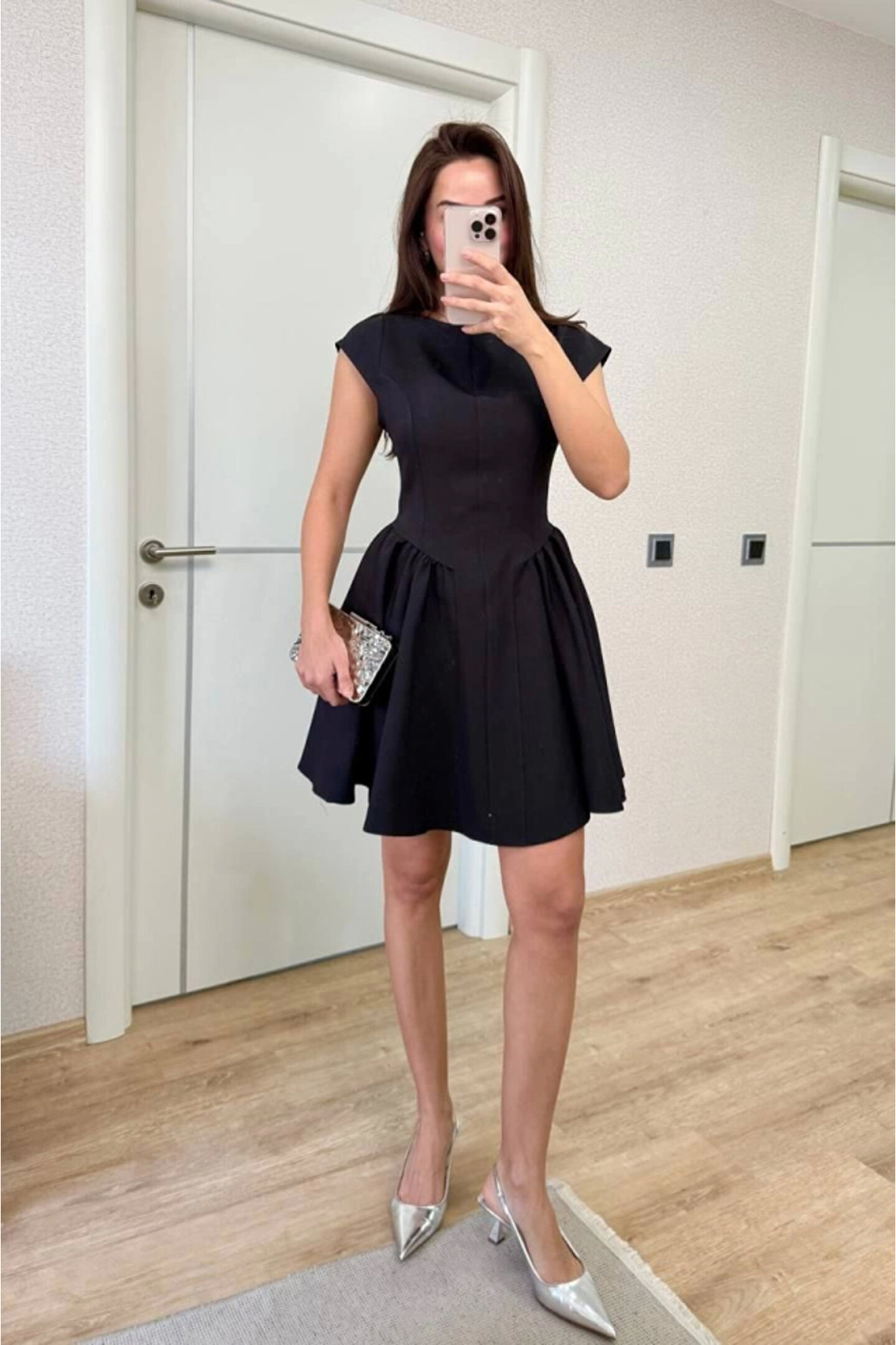 Sırt Dekolteli Çan Detaylı Mini Elbise - Siyah