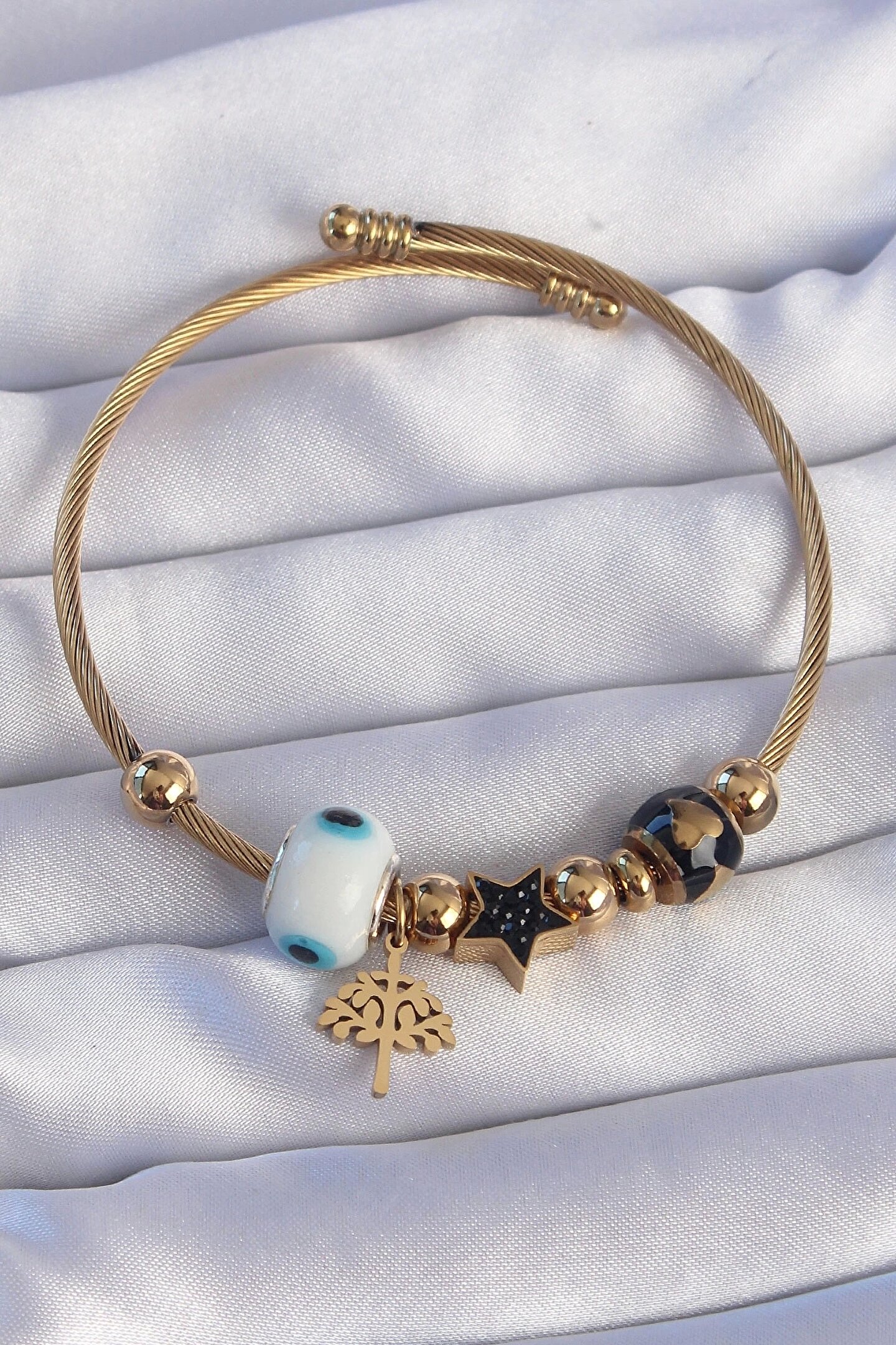 ŞANS BOUTİQUE 316L Çelik Gold Renk Siyah Zirkon Taşlı Yıldız Tasarımlı Ağaç Detay Nazarlı Charm Bileklik