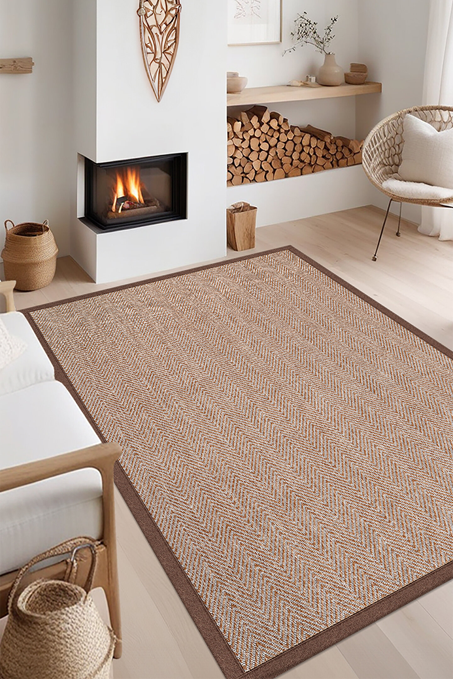 SARAZ HALI 0408-Kahve Kumaş Bordür Sisal Halı Kilim Hav Toz Vermez Kolay Temizlenen Hasır Kilim