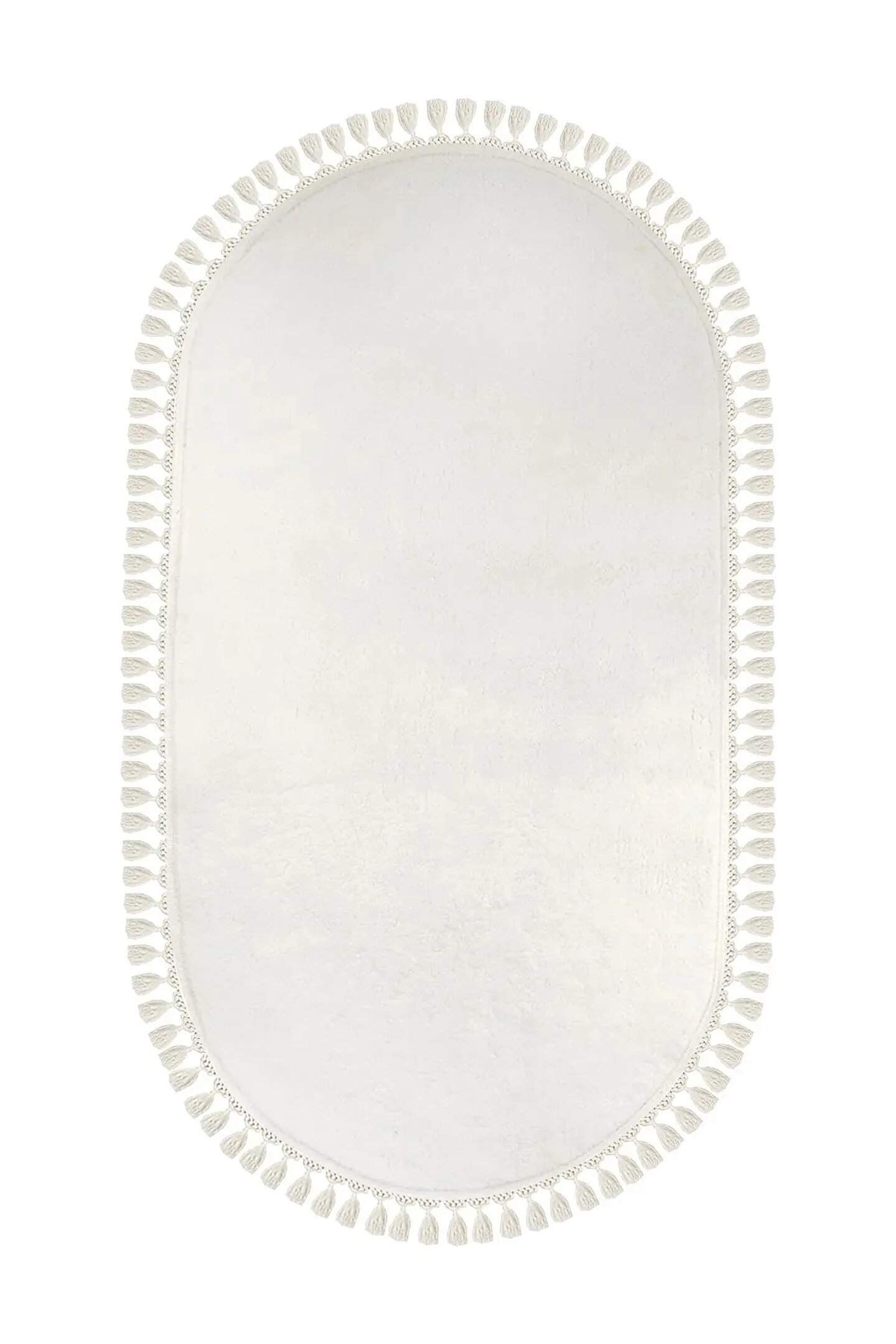 SARAZ HALI Puffy Beyaz Oval Örgü Saçaklı Peluş Yumuşacık Yıkanabilir Kaymaz Taban Halı Salon Oturma Odası