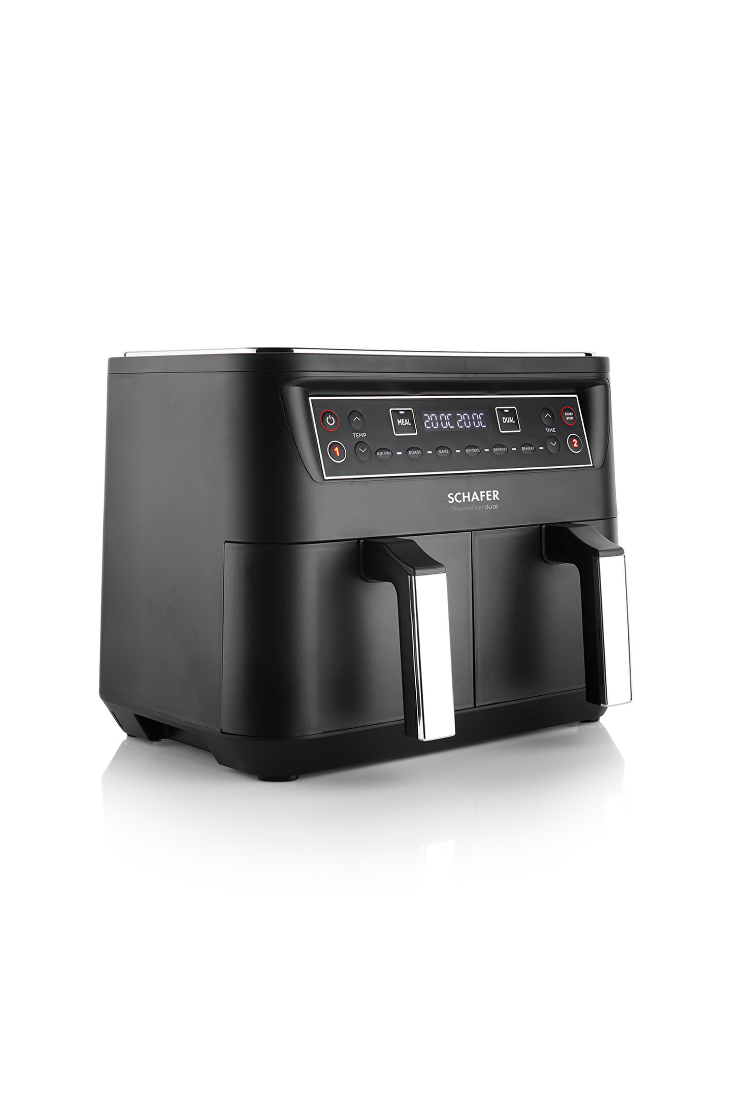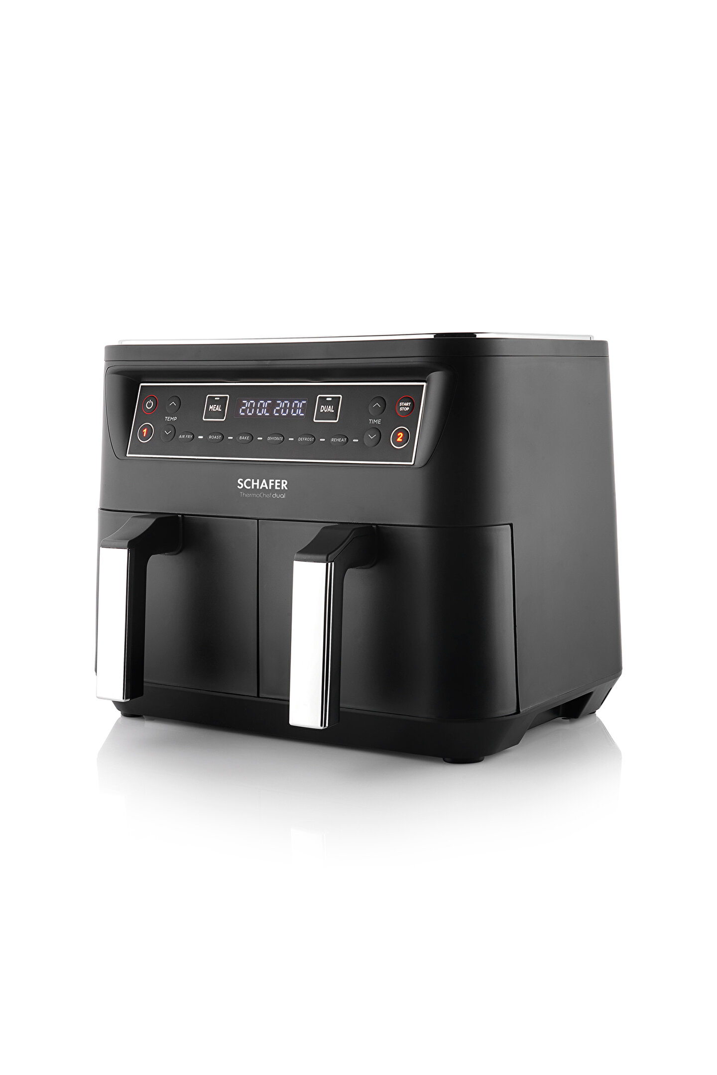 Schafer Thermochef Dual Dijital Airfryer/Sıcak Hava Fritözü 2460W Isıtma Gücü 8L Pişirme Kapasitesi (2*4L Kapasite) Çok Amaçlı Pişirici (Multi Function) Yağsız Kullanım Dokunmatik Isı ve Zamanlama İstenildiğinde Manuel Isı ve Zaman Kontrolü Pişirme Haznelerini Ayrı Ayrı Kullanabilme Fırın Fonksiyonunda Et Pişirme Fırın Fonksiyonunda Ekmek ve Kek Pişirme Tekrar Isıtma Özelliği Sebze ve Meyve Kurutma Fonksiyonu Dondurulmuş Gıdaları Çözme Fonksiyonu Tek Hazne Kullanabilme Seçeneği Pişirme Hazne Izgarası Sayesinde Yağdan Arındırma Ürün Ölçüsü (Tek Hazne için): En:15 cm Boy: 22 cm Derinlik: 12,5 cm Isıtma Dereceleri: Buz çözme: 240 decere max.; ; / 30 dk max.; ; Pişirme : 210 decere max.; ; / 1 saat max.; ; Meyve Kurutma: 40-90 derece arası / 12 saat max.; ; Airfry: 150 derece en düşük ısı Et: 120 derece en düşük ısı Ekmek: 120 derece en düşük ısı Yeniden Isıtma ( Mikrodalga ) : 130-210 derece arası;