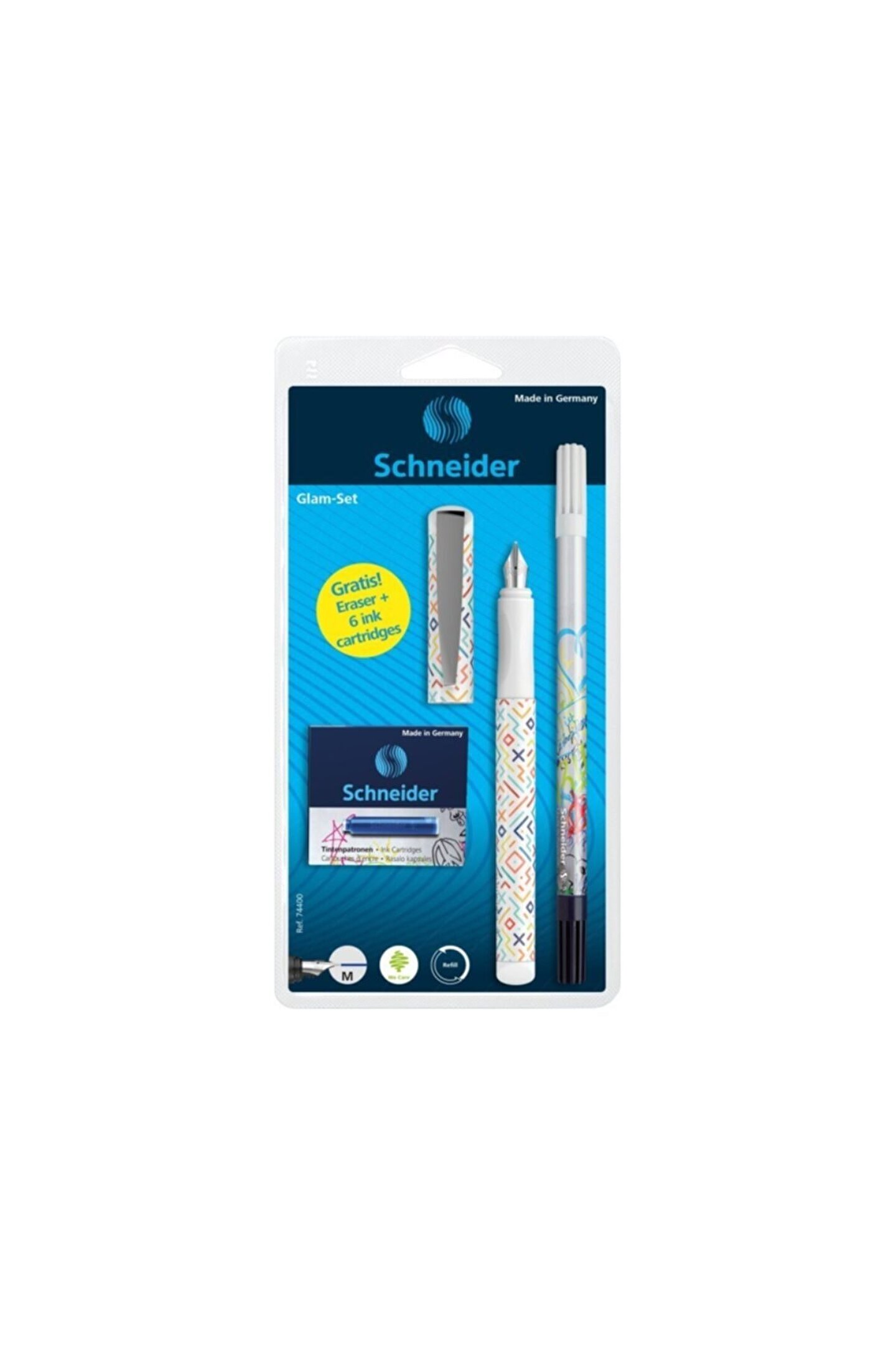 Schneıder 74400 Dolma Kalem Glam-Set İridyum paslanmaz çelik tükenmez kalem, hem sağlak hem de sol elini kullananlar için uygundur; Ergonomik manşonlu kenetleme alanı; Standart mürekkep deseniyle çalışır; Çeşitli renk kombinasyonlarında üç boyutlu baskılı gövde (kabartmalı tasarım);