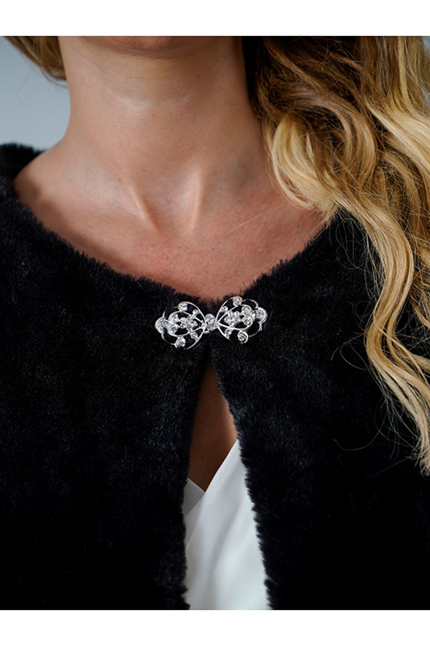 Zarif tasarımıyla dikkat çeken bu broşlu Fransız uzun kollu kürk siyah etol bolero şal, gelinlerin nikah törenlerinde şıklığını tamamlamak için idealdir.; Broş detayı ile zenginleştirilmiş bu şal, hem klasik hem de modern gelinler için mükemmel bir aksesuar seçeneğidir.; Rahat kullanım sağlayan uzun kolları sayesinde soğuk havalarda sıcak tutar ve konforlu bir deneyim sunar.; Siyah renk seçeneğiyle her türlü kıyafetinize uyum sağlayarak zamansız bir tarz oluşturmanızı mümkün kılar.;
