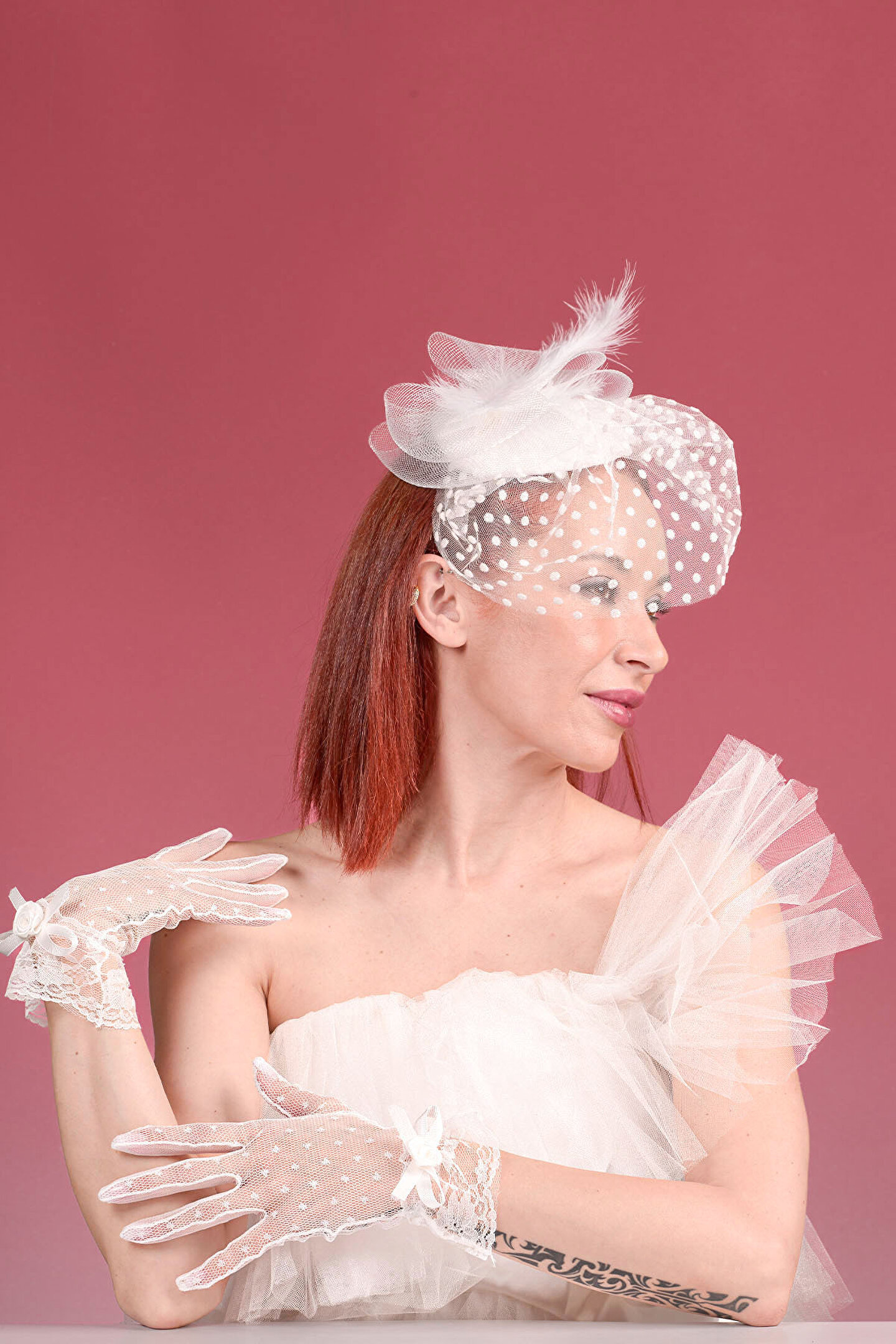 SeddA Kırık Beyaz Puantiyeli Gelin Kepi Nikah Şapkası Ve Puanlı Gelin Eldiveni Kombin Set