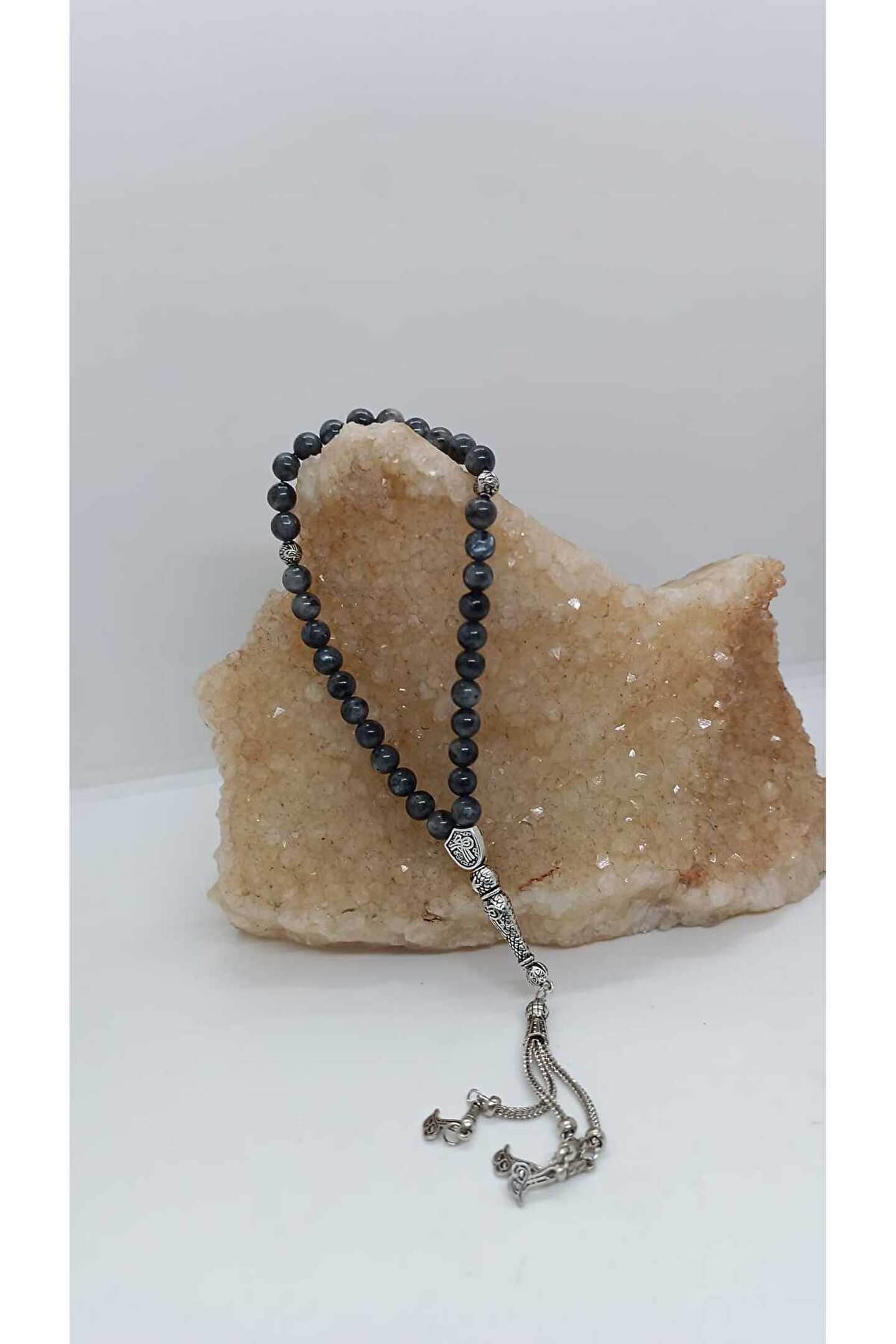 - Gümüş kaplama malzemesiyle üretilmiş, uzun ömürlü ve şık bir tasarıma sahip; - Doğal taş desenleriyle göz alıcı bir görünüm sunar ve her kullanımda farklı bir estetik sergiler; - Doğal taş kullanımı sayesinde, her tespih seti benzersiz ve otantik bir dokunuşla öne çıkar;