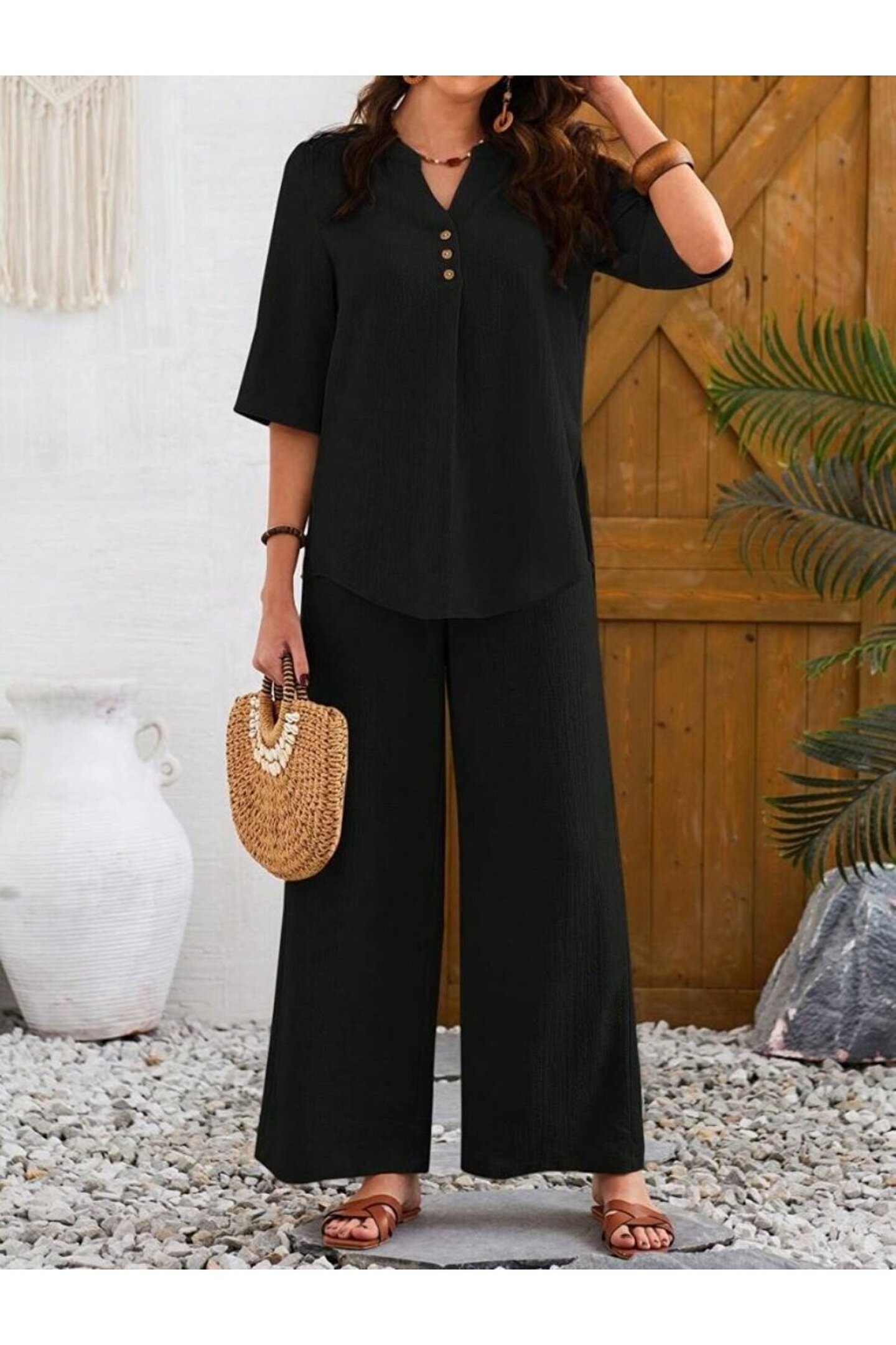Kadın Kısa Kollu V Hakim Yaka Düğmeli Bürümcük Bluz Ve Pantolon Ikili Takım