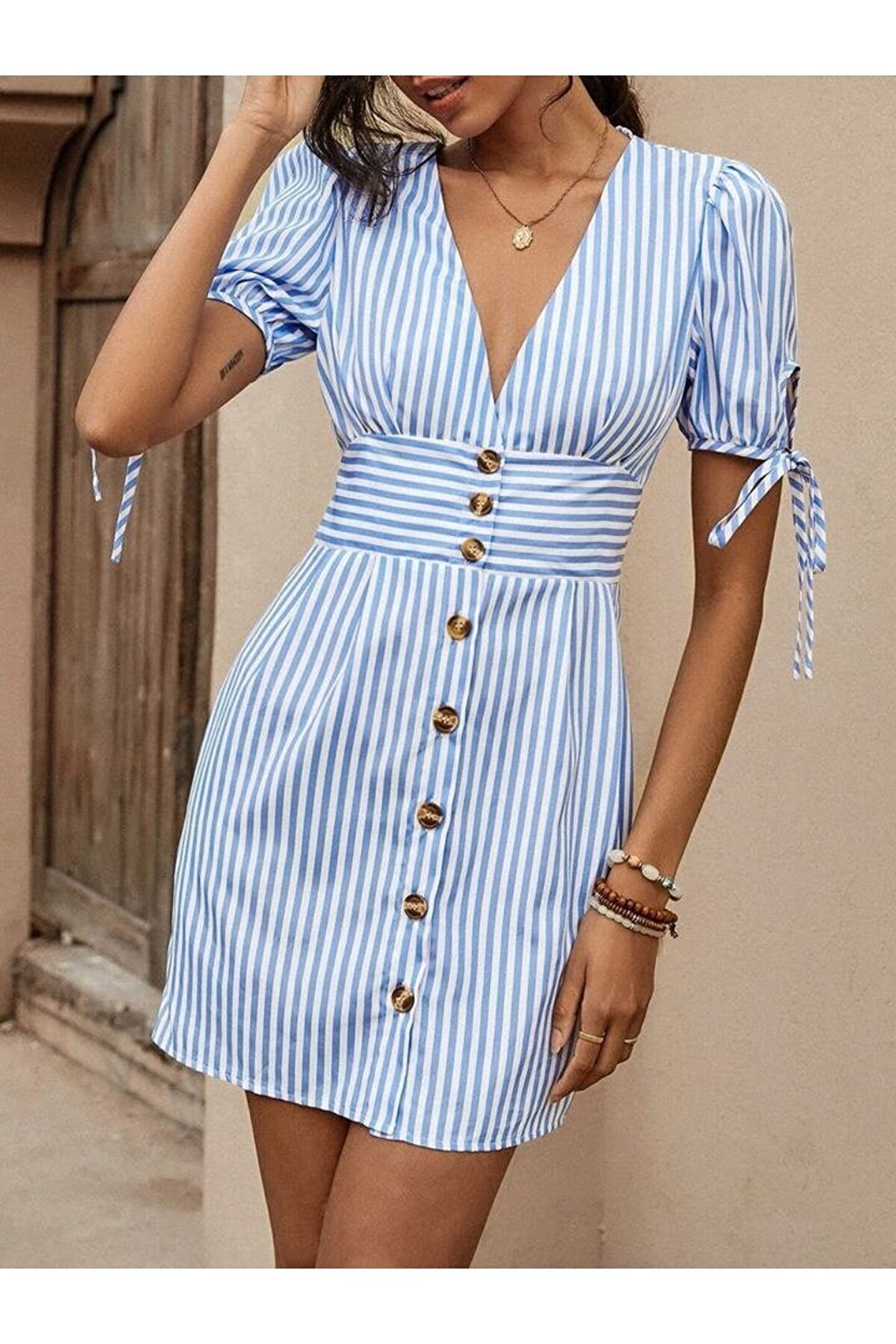 Serero Gökyüzü Moda Kadın Kısa Bağcıklı Kol Kruvaze Yaka önden Düğmeli Kısa Poplin Elbise