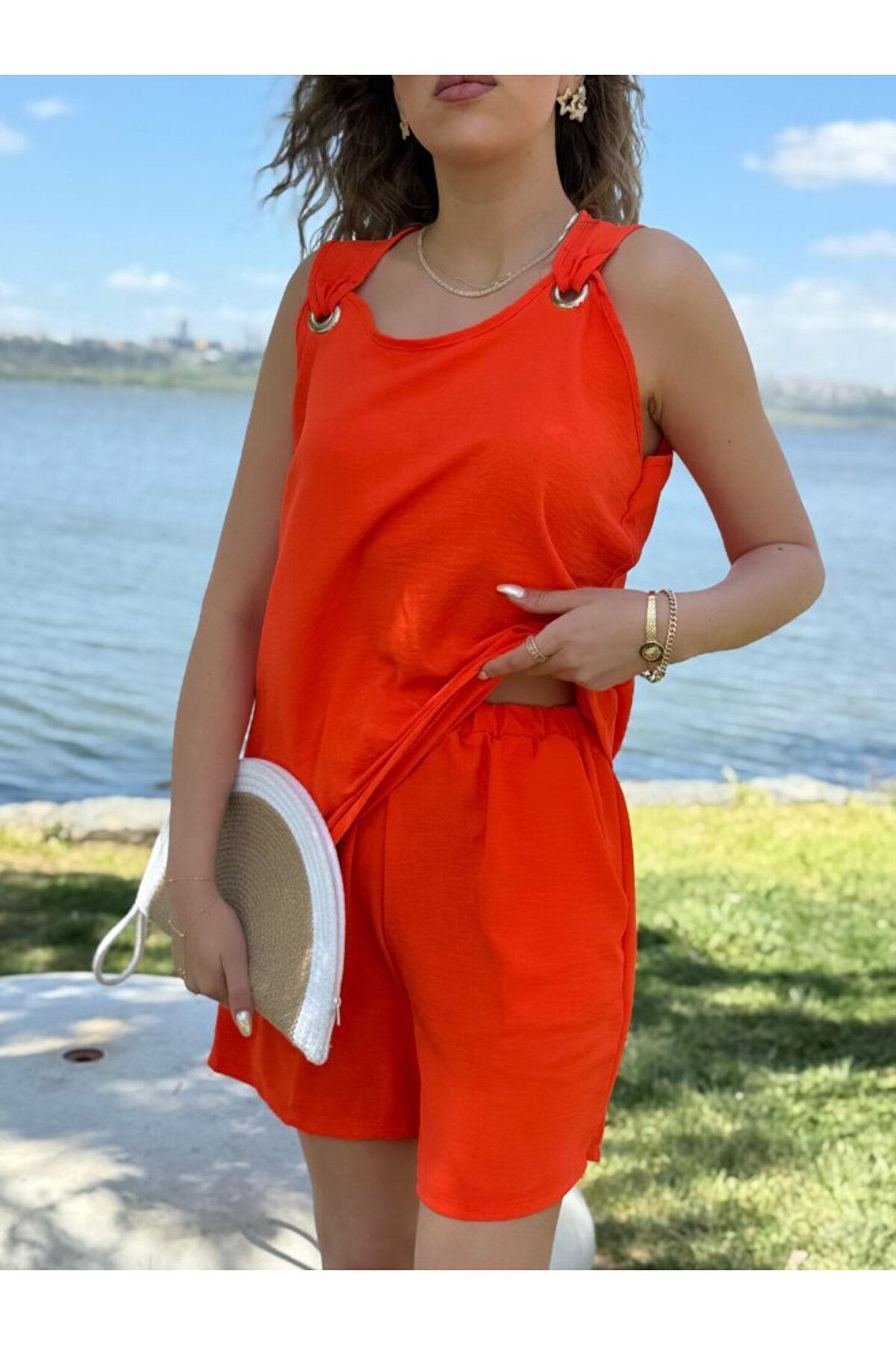 Kadın Kolsuz V Yaka Kuş Gözü Detay Bluz Short Aerobin Ikili Takım